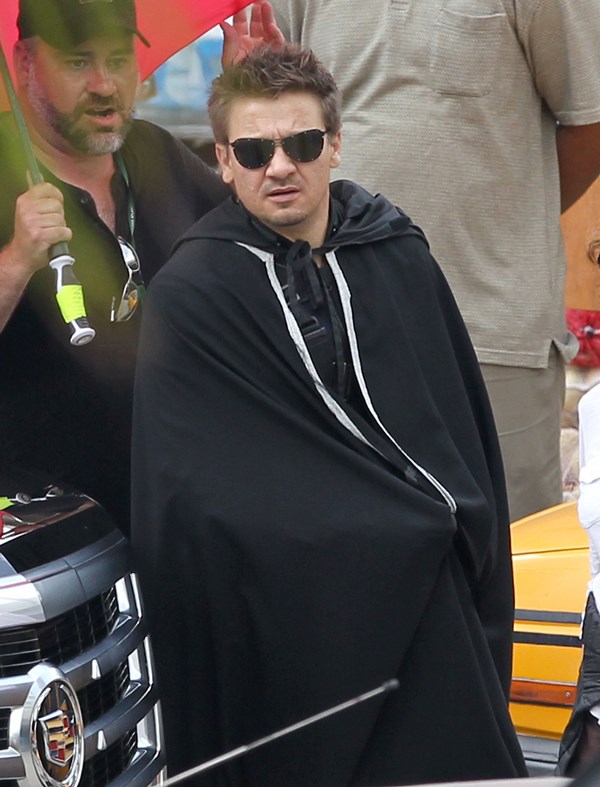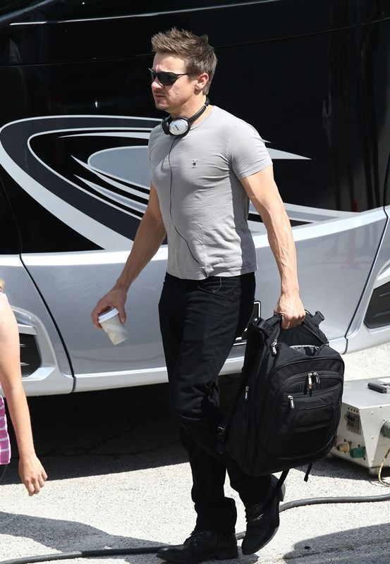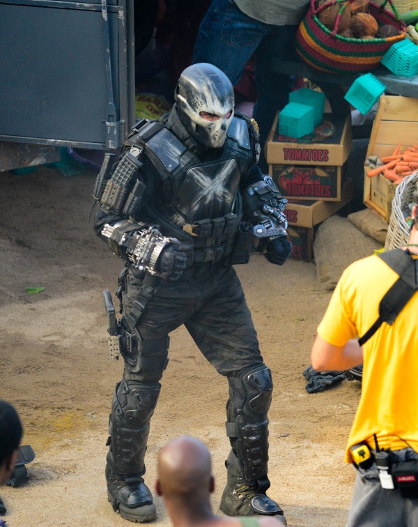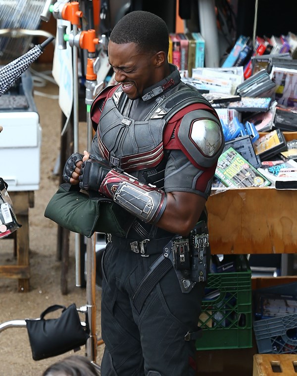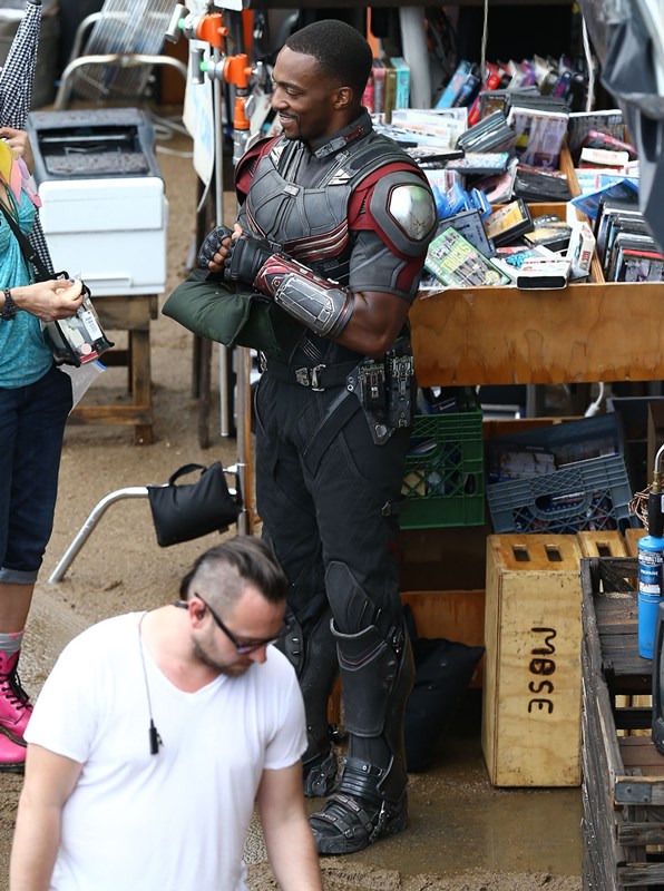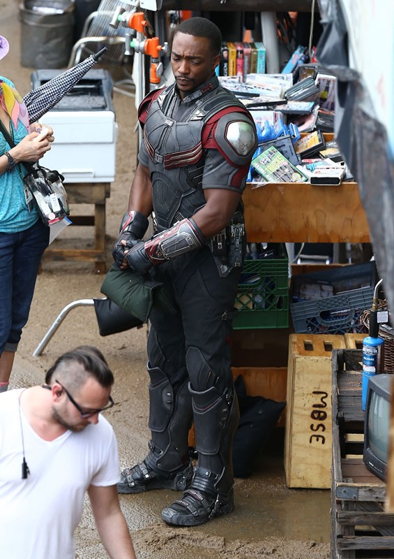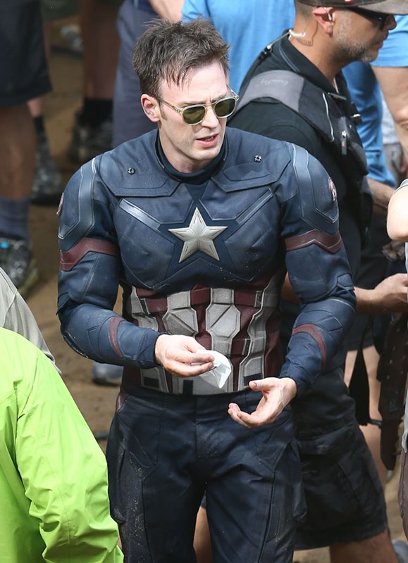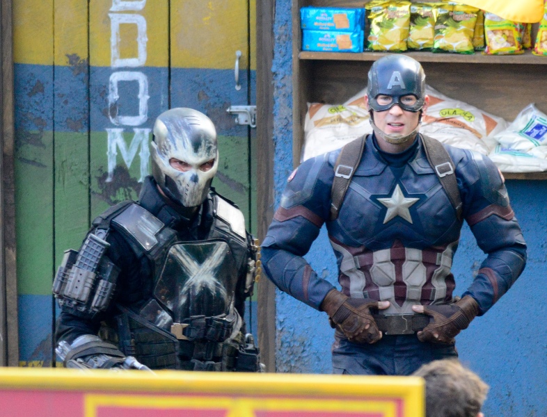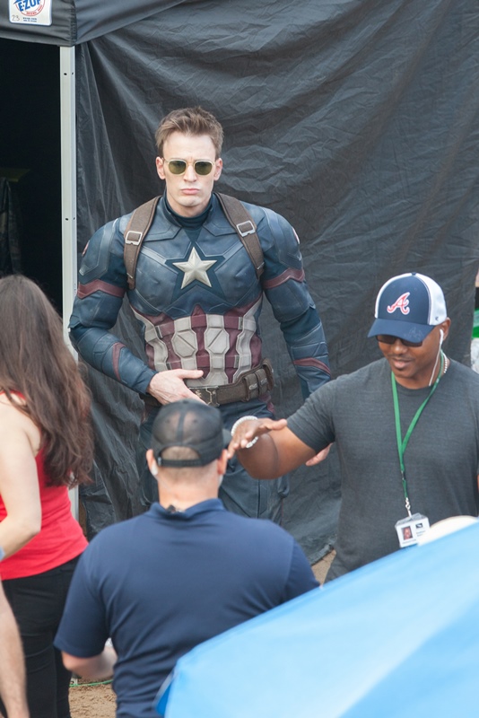 And I mean EVERYONE, up to and including the stunt doubles. Filming for Captain America: Civil War continues and more set photos are coming out of Atlanta—hilariously doubling for Nigeria—and we’ve got more of Chris Evans looking like a life-size action figure in his Cap suit, and better shots of Anthony Mackie in Falcon’s new souped-up gear, and though we can see Elizabeth Olsen’s wig action, there still isn’t a good look at her second generation Scarlet Witch costume. Jeremy Renner is on set now, too, but I think everyone’s still mad at him so I don’t know if anyone is paying him attention right now. He’s still on the naughty step. There are also shots of Captain America throwing down with the villain Crossbones, aka Brock Rumlow. I would like to remind everyone that Frank Grillo is forty-nine. Not pictured is Scarlett Johansson, although Black Widow is involved in this scene, too.
