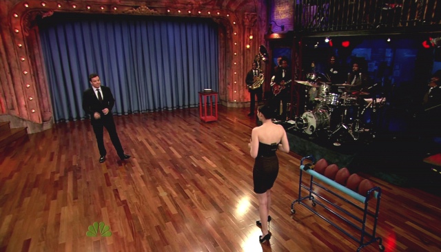 Kristen Stewart was on Jimmy Fallon last night. I like the dark smudgy look on her. And my girl can throw.