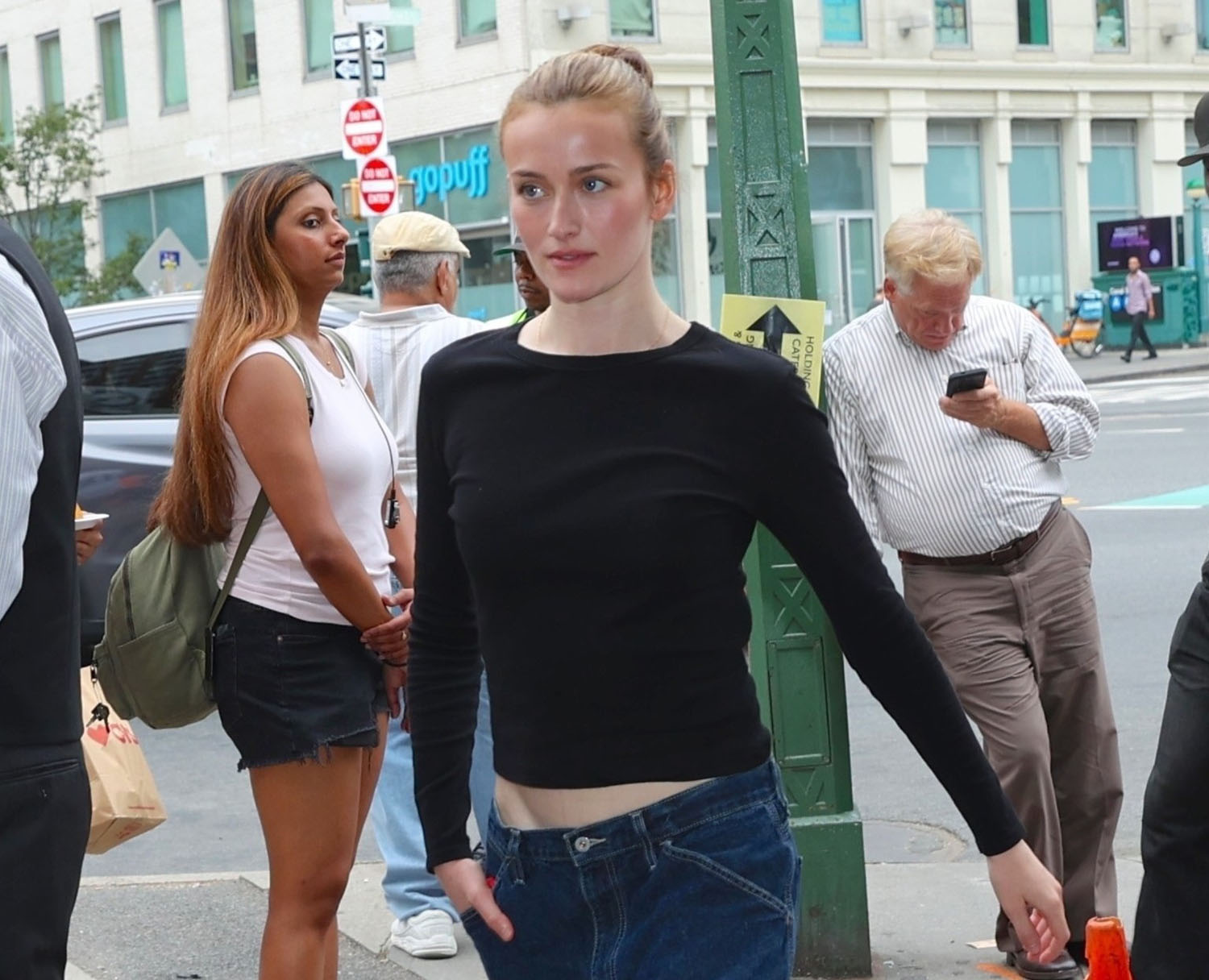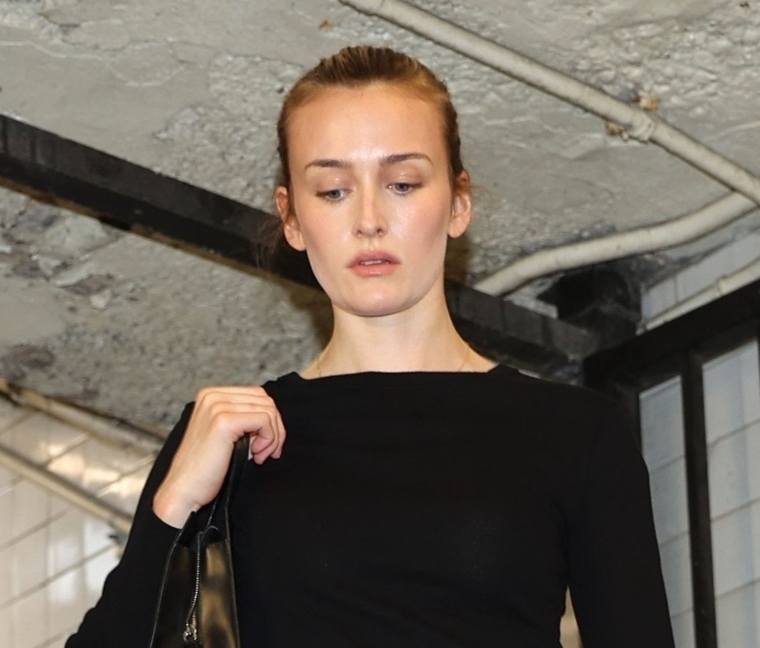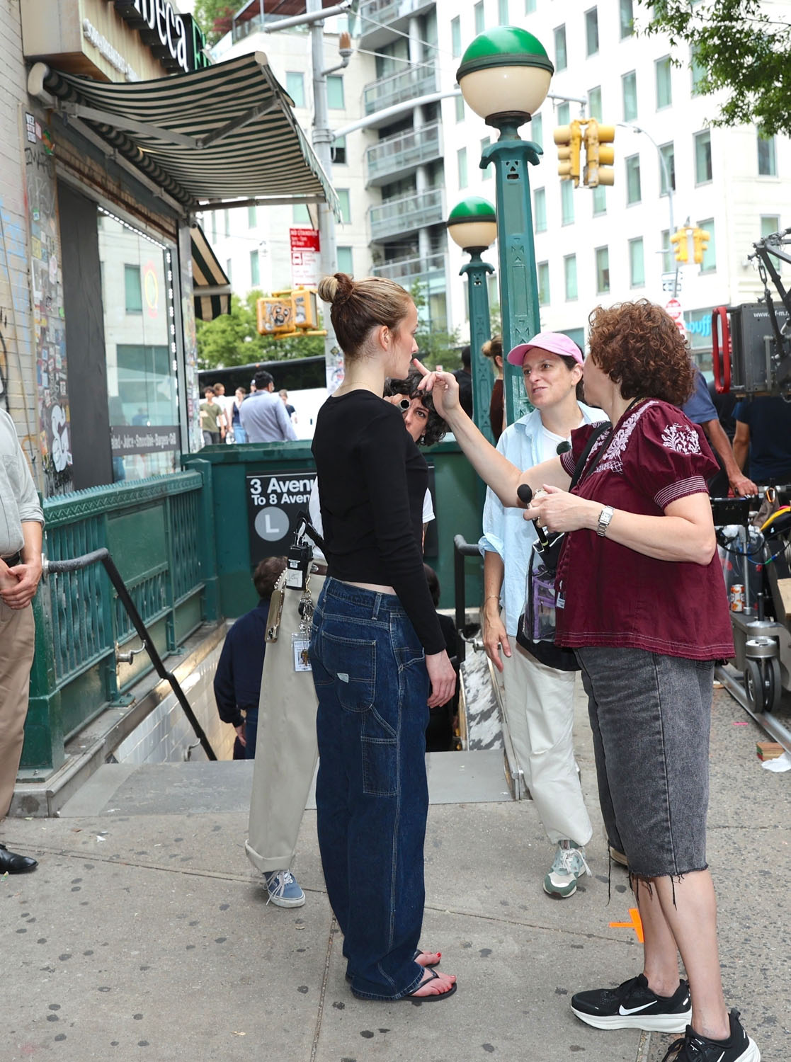 Sarah Pidgeon was photographed in New York yesterday as production continues on Ryan Murphy’s American Love Story. Sarah looks so pretty with her hair pulled back like this and her face made up to look like she’s barely wearing any. Though her hair is more honey blonde than how Carolyn Bessette Kennedy wore hers (as you’ll see in a second), we actually have a lock on what the reference is. And those of us who are familiar with the Carolyn paparazzi catalogue can clock it right away.