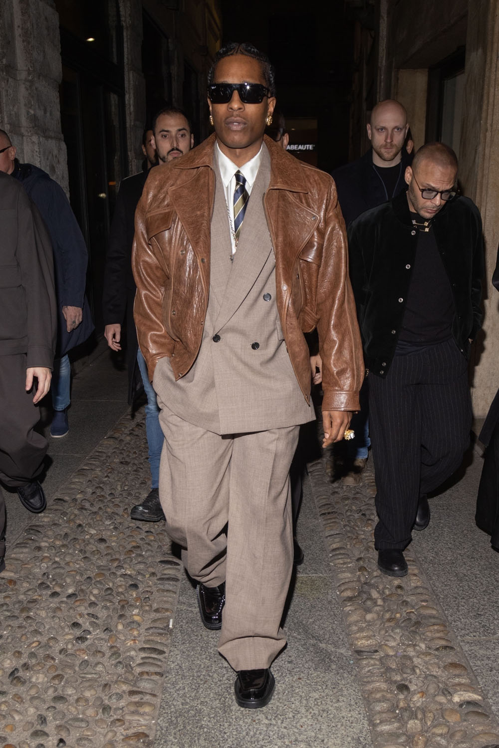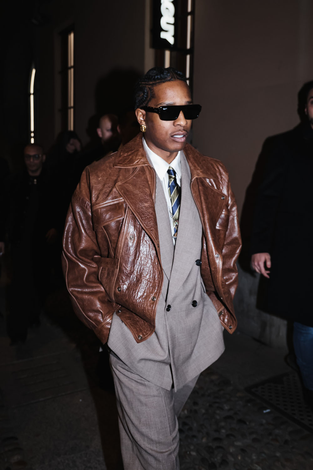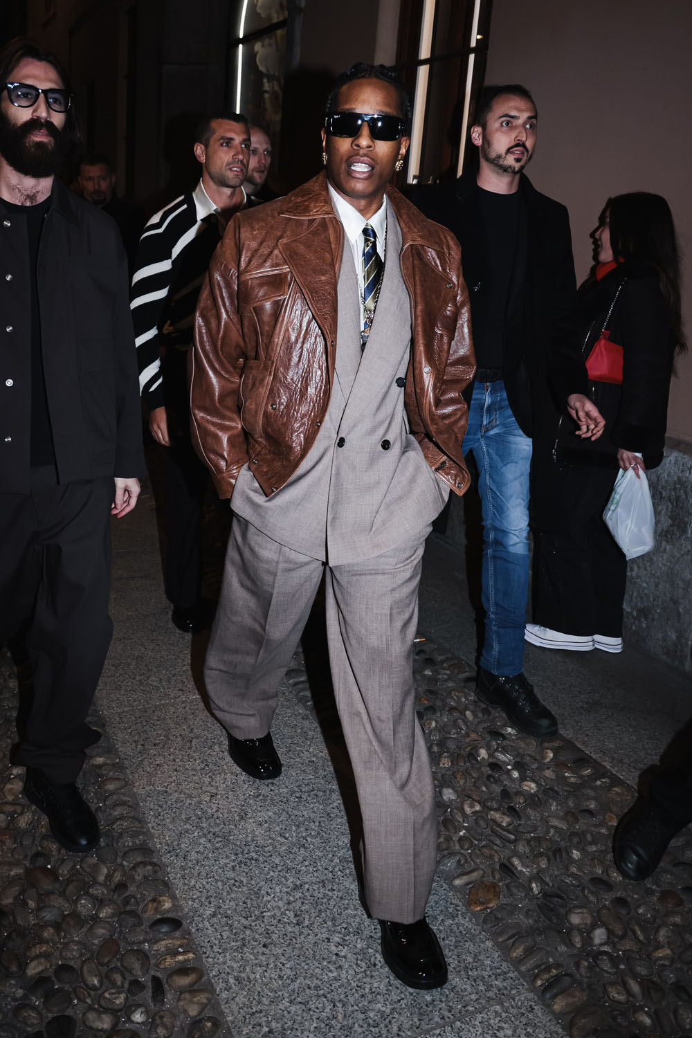 Here is Rocky last night leaving the Ray-Ban party in Milan. As you can see, his court style continues, but now it is more “make it fashion”. The suit is oversized, the pants wide-legged; I do enjoy that Eighties relaxed fit coming back in menswear. The tiny suits of the last twenty years didn’t flatter a lot of men, even very fit men didn’t look great in those super slim suits. But the Eighties power suit silhouette can work in so many ways. Here, for instance, Rocky paired it with a leather jacket, for a touch of Americana. He looks like a banker…if that banker was a glamorous vampire.