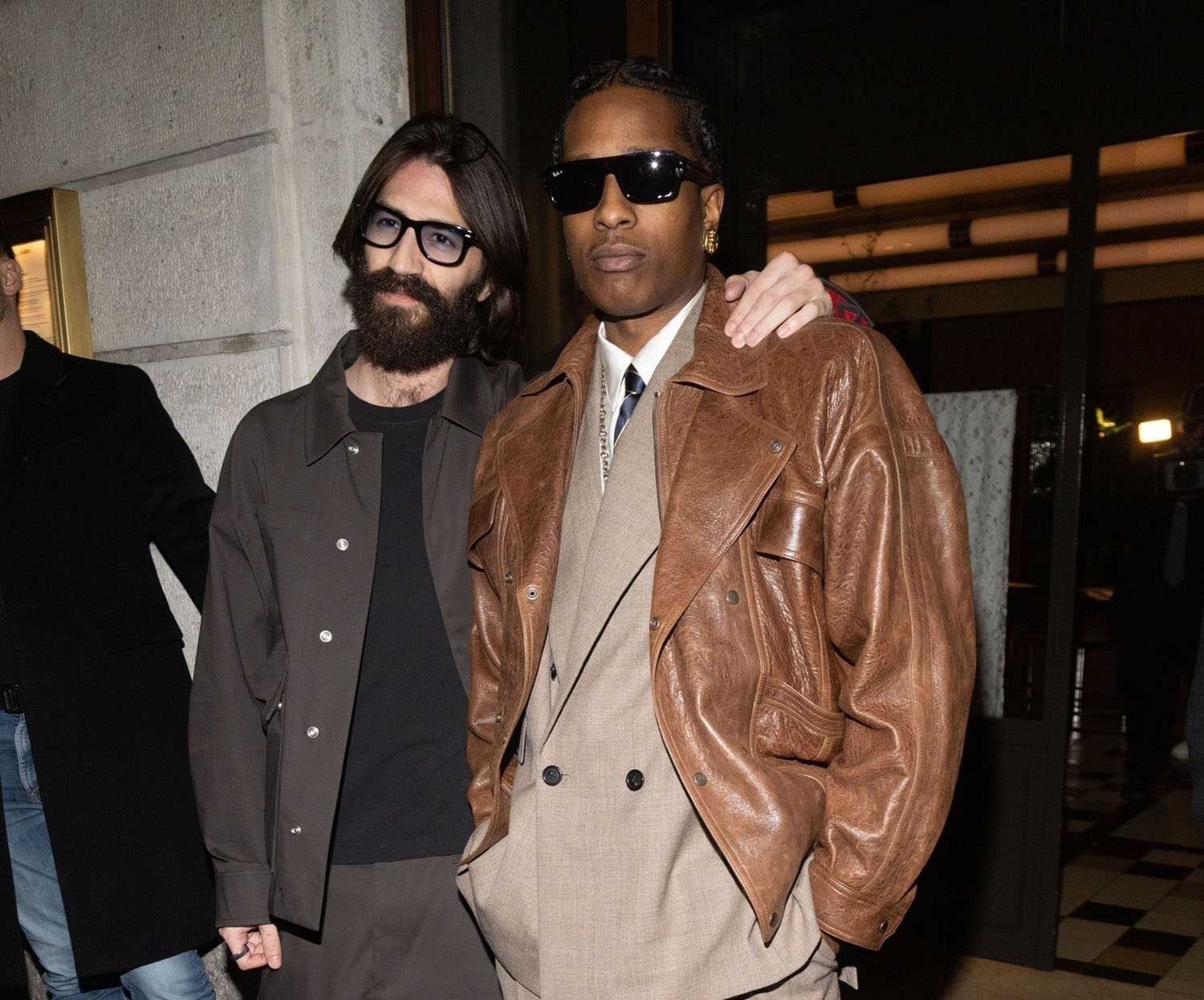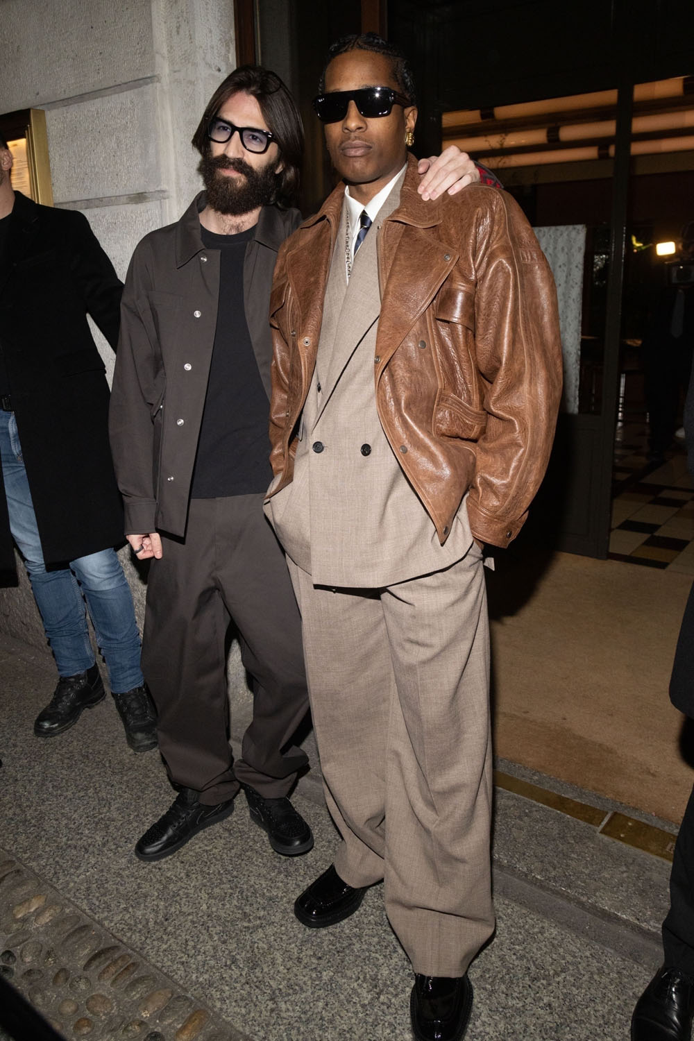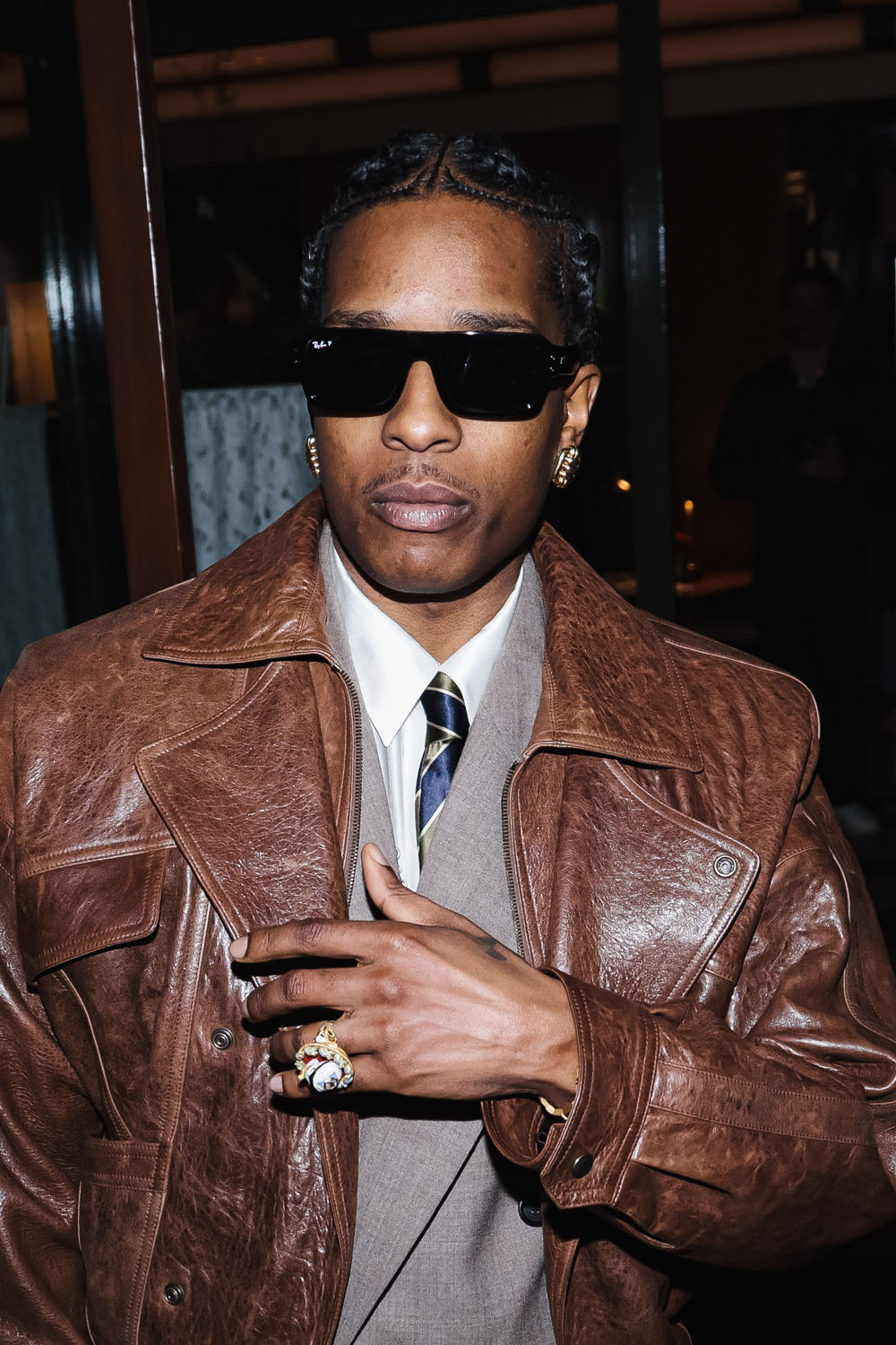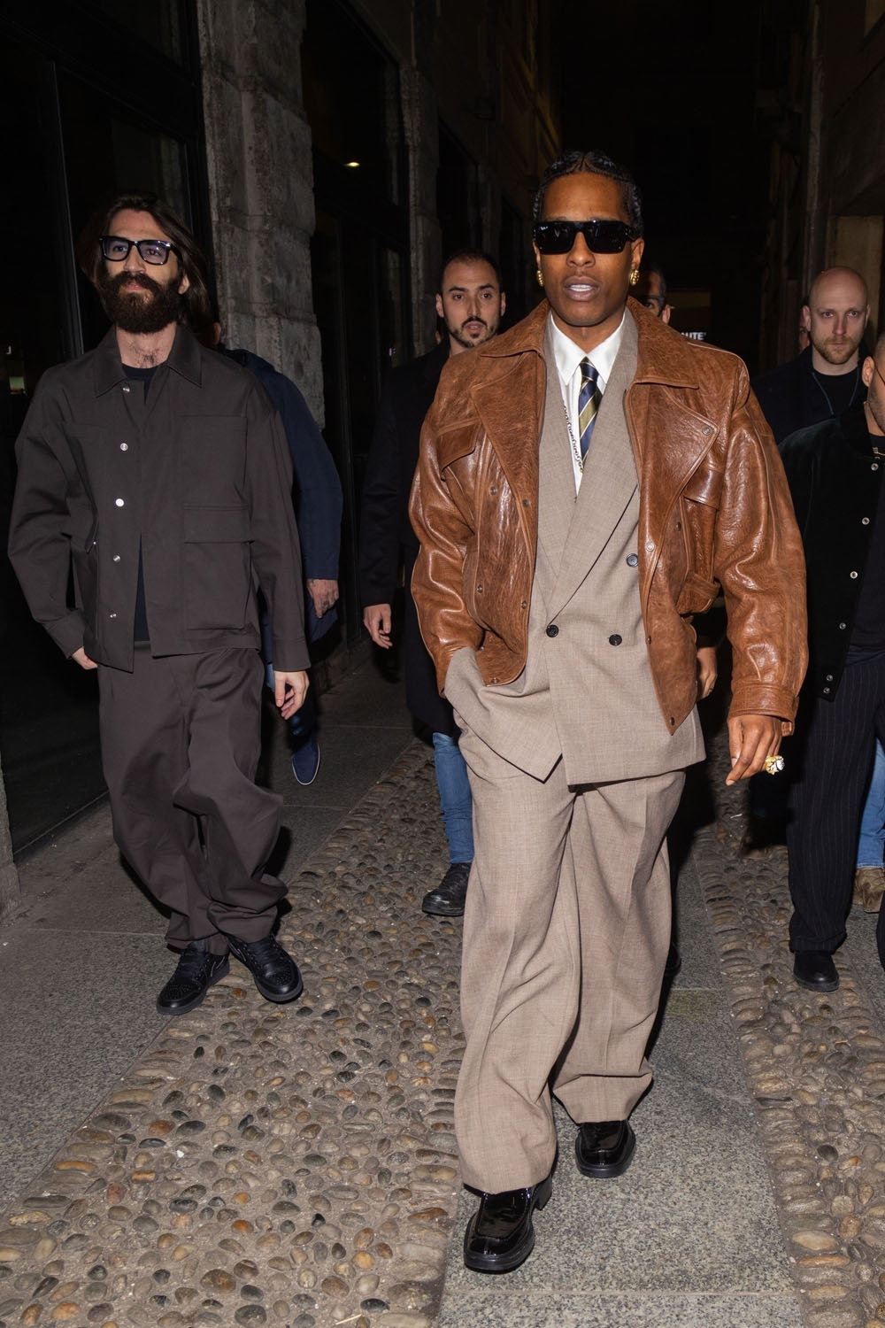 Here is Rocky last night leaving the Ray-Ban party in Milan. As you can see, his court style continues, but now it is more “make it fashion”. The suit is oversized, the pants wide-legged; I do enjoy that Eighties relaxed fit coming back in menswear. The tiny suits of the last twenty years didn’t flatter a lot of men, even very fit men didn’t look great in those super slim suits. But the Eighties power suit silhouette can work in so many ways. Here, for instance, Rocky paired it with a leather jacket, for a touch of Americana. He looks like a banker…if that banker was a glamorous vampire.