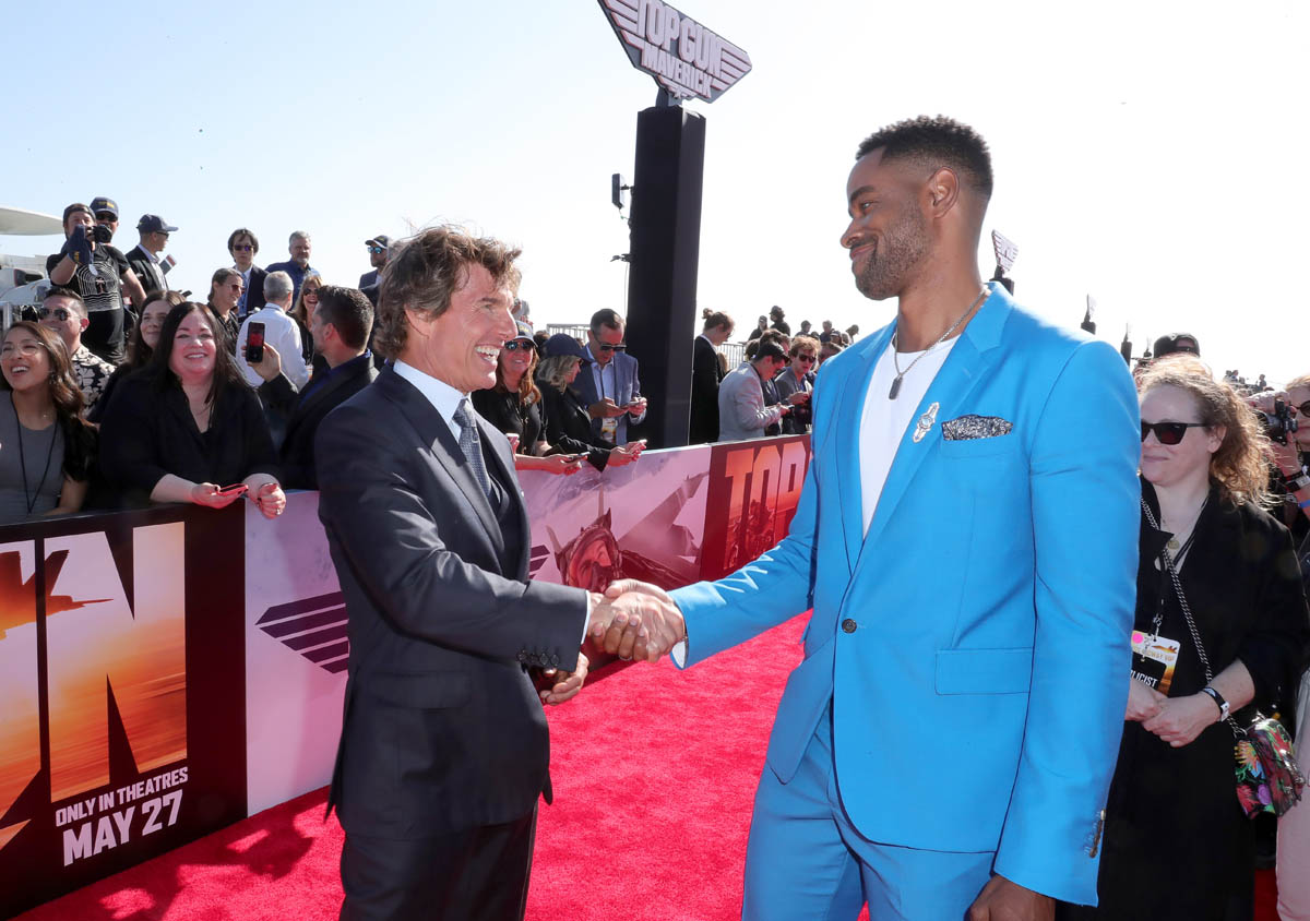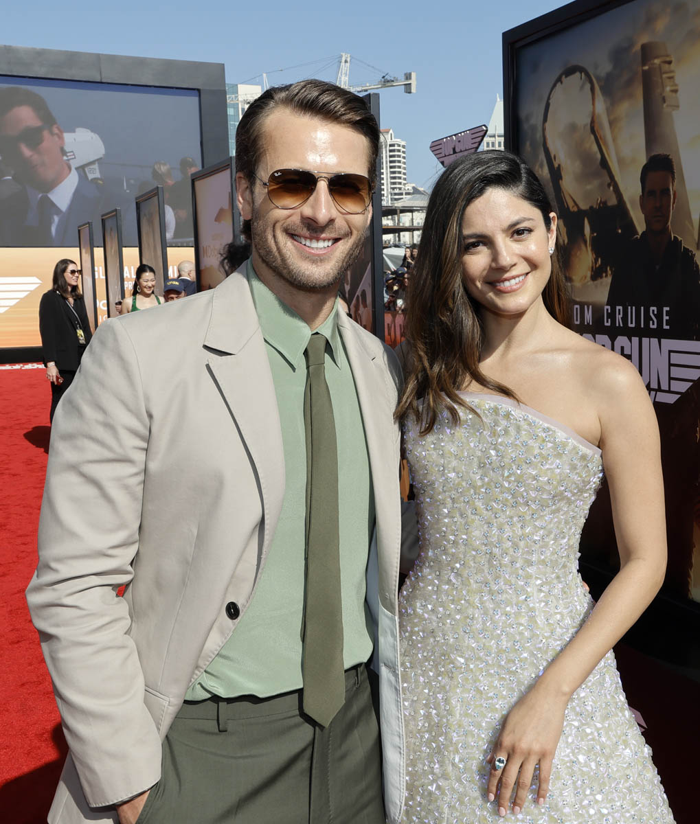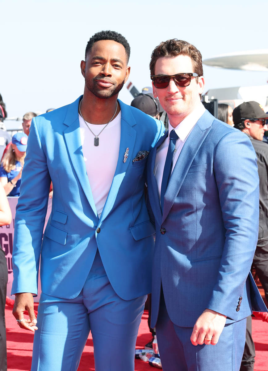 My point is, then, for the sequel, another team had to be assembled for Tom Cruise to show us, again, that he is indeed the “best of the best”. So here are some of the new Top Gun recruits: Miles Teller (who’s playing Goose’s son, call sign Rooster), Glen Powell (call sign Hangman), Monica Barbaro (call sign Phoenix), Jay Ellis (call sign Payback), and Greg Tarzan David (call sign Coyote). They were all at the premiere yesterday in San Diego.