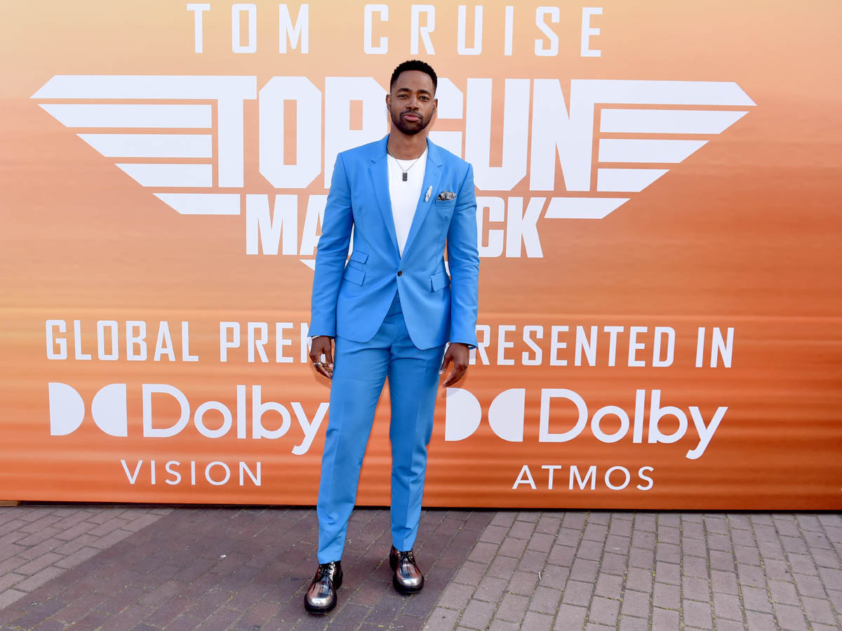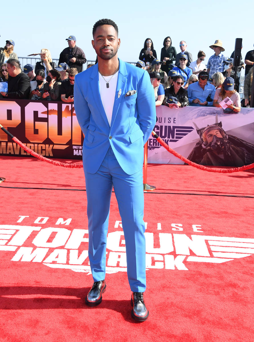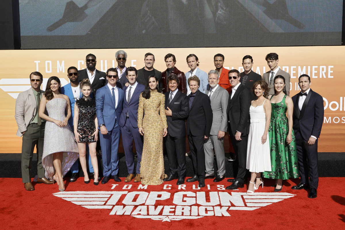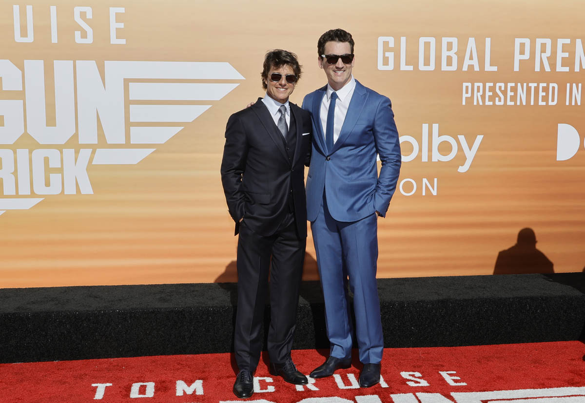 My point is, then, for the sequel, another team had to be assembled for Tom Cruise to show us, again, that he is indeed the “best of the best”. So here are some of the new Top Gun recruits: Miles Teller (who’s playing Goose’s son, call sign Rooster), Glen Powell (call sign Hangman), Monica Barbaro (call sign Phoenix), Jay Ellis (call sign Payback), and Greg Tarzan David (call sign Coyote). They were all at the premiere yesterday in San Diego.