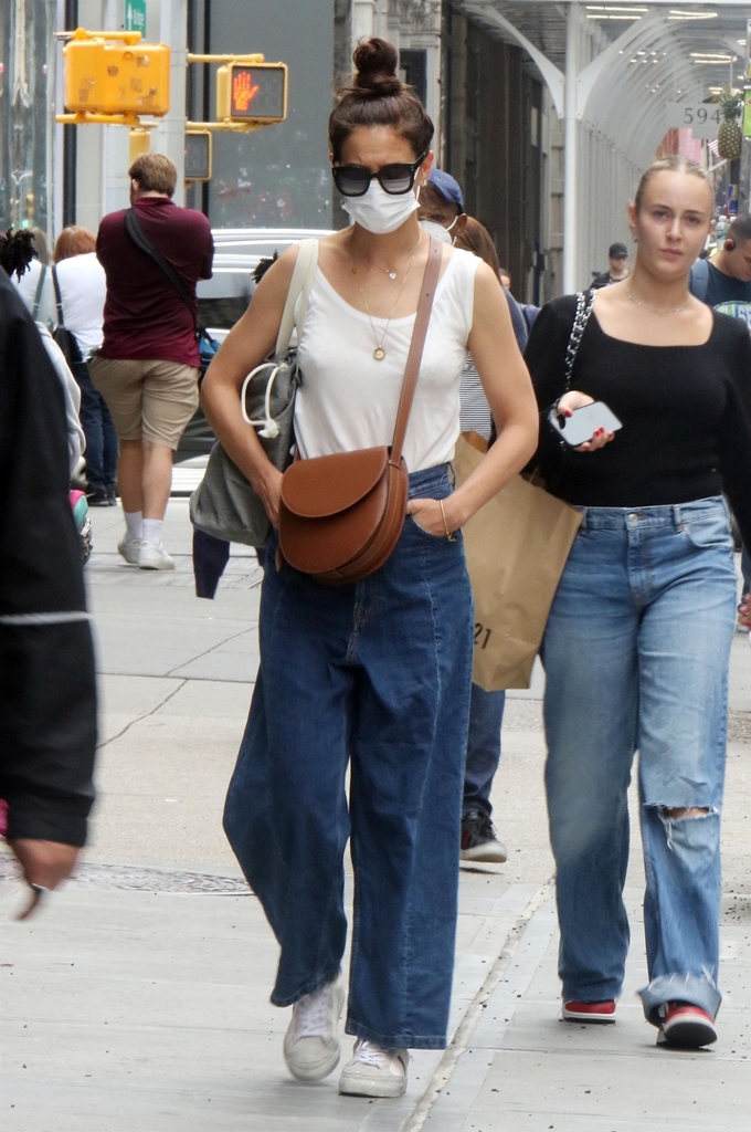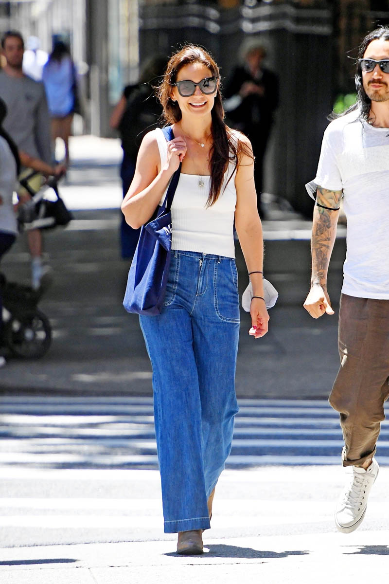 Katie is a celebrity so she can have as many pairs of jeans as she wants to. But for civilians, if you have the pair I just showed you, you don’t need the ones she’s wearing in the photos below. I hate those pockets. I don’t love how they fall and they don’t look as comfortable either. The denim in the current pair doesn’t look like there’s much give. Whereas the way the ones from earlier last week are cut, it allows more room for movement – and air flow! That’s another thing about the jeans Katie was wearing yesterday. It’s hot in New York right now. Nobody needs all that material hugging the skin!