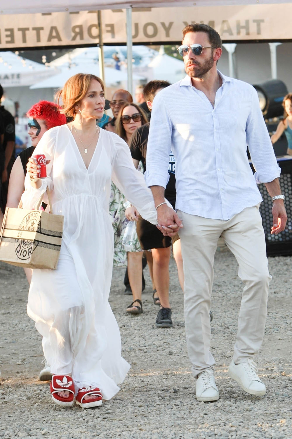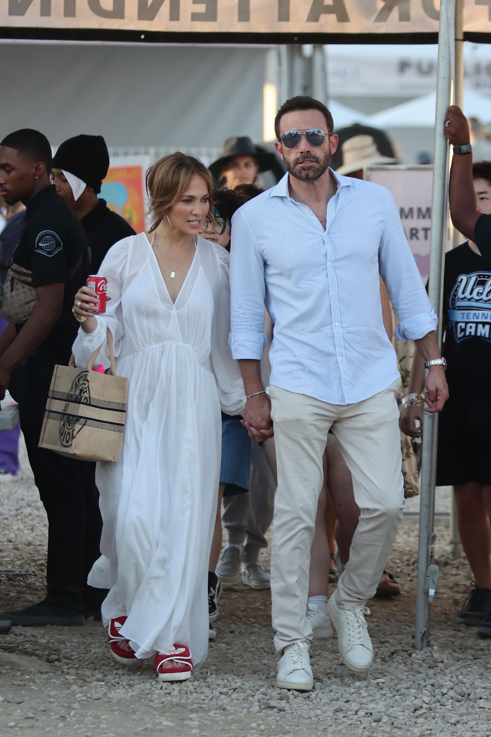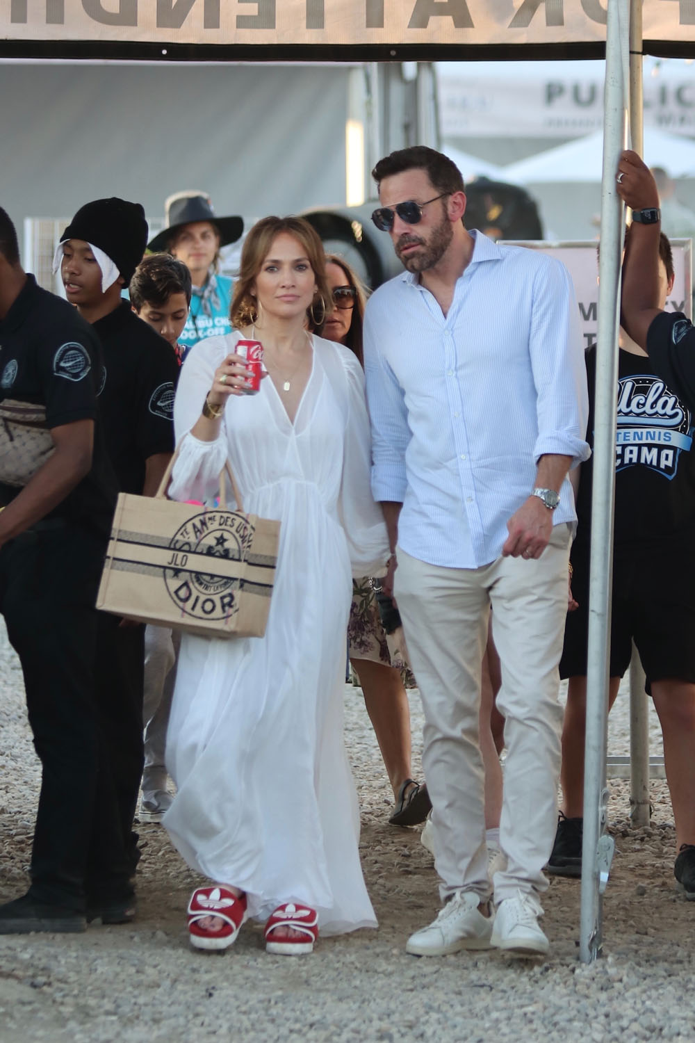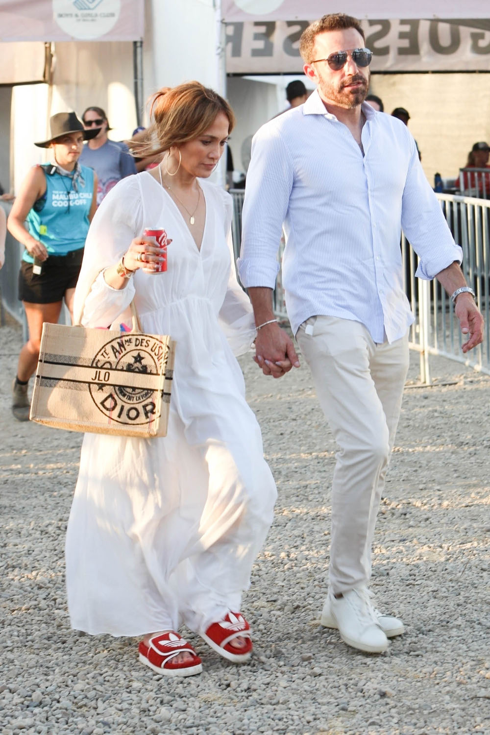 Still, JLo kept it venue appropriate with her footwear. Nobody needs to be walking around the Chili Cookoff in heels. So she went with slides… only designer. Plus a can of Coca-Cola! And I don’t even see a straw! JLo, she’s “just like us!”