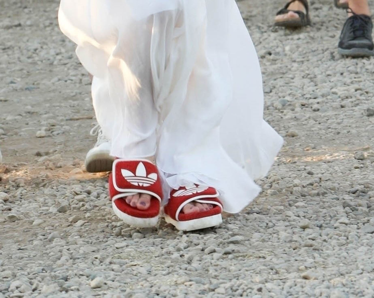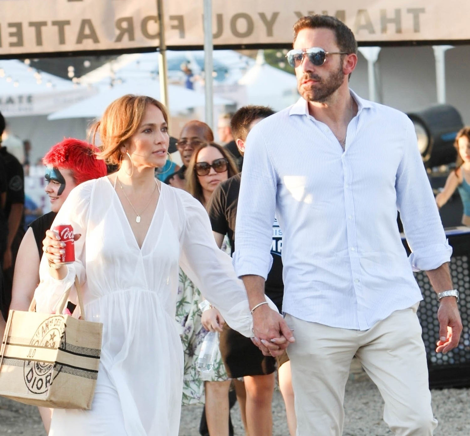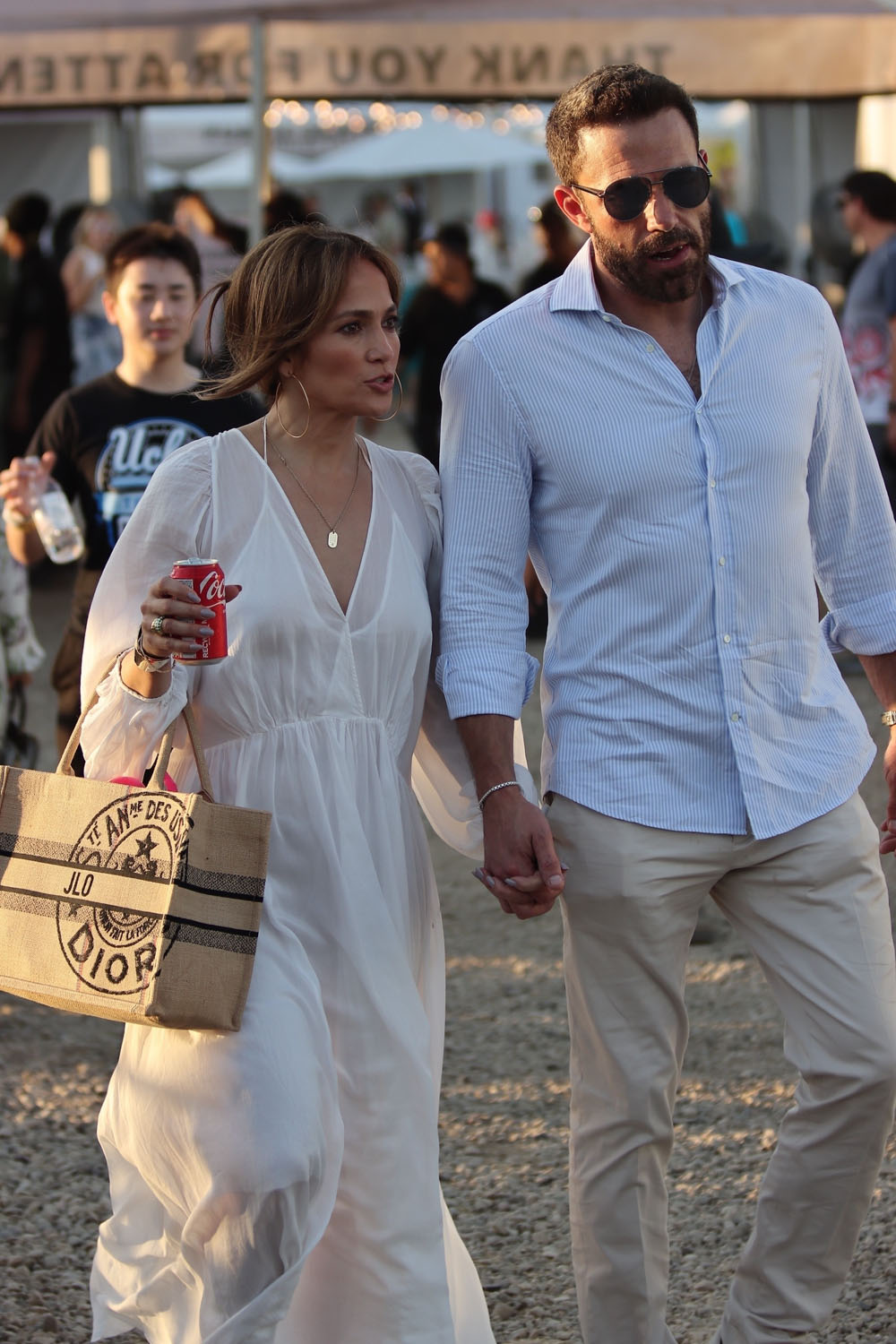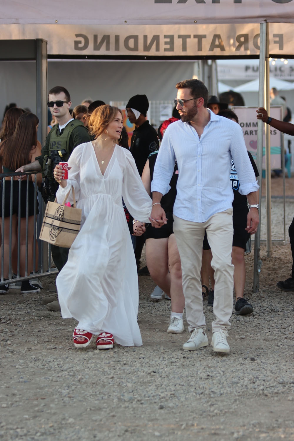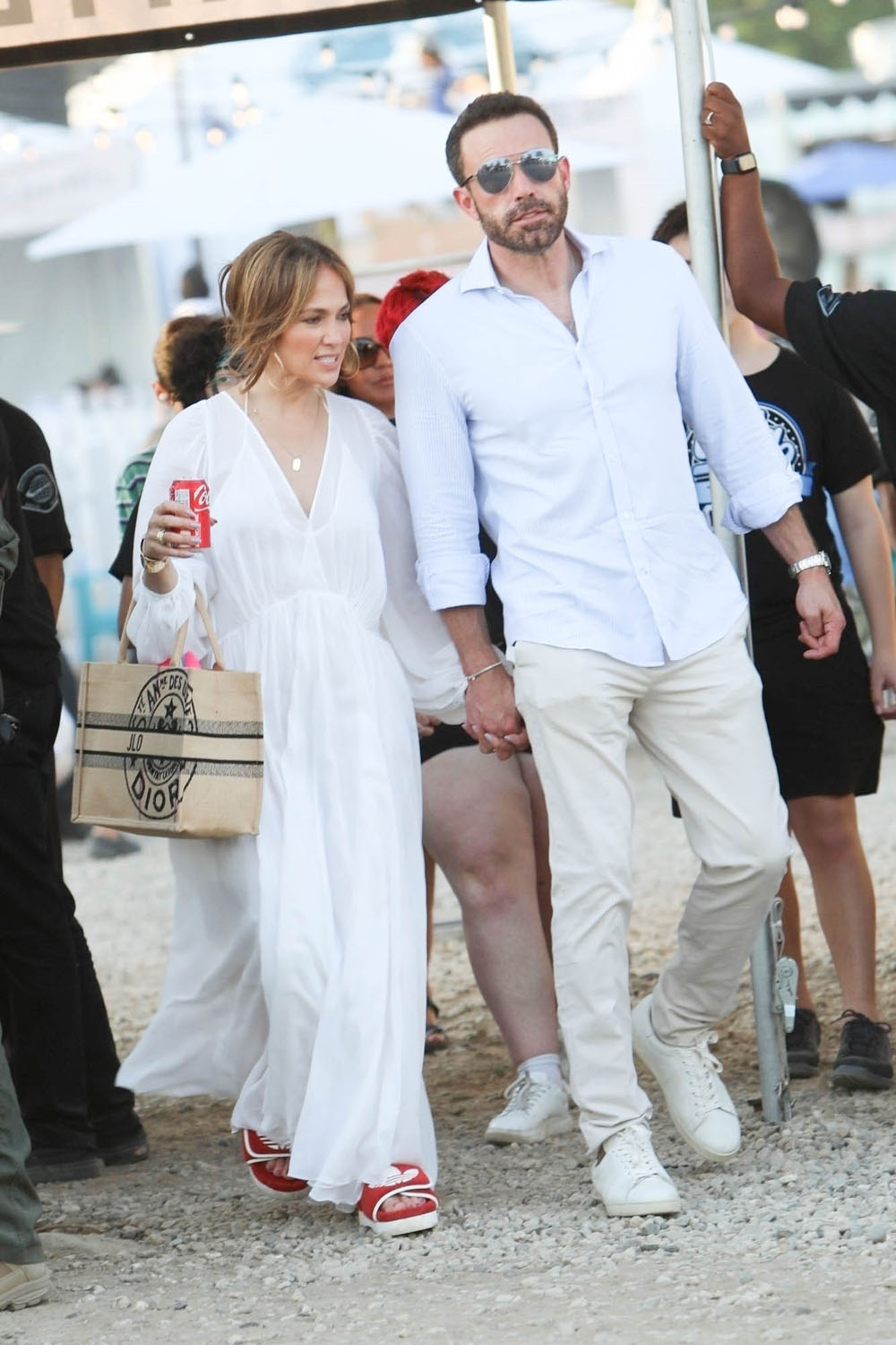 Still, JLo kept it venue appropriate with her footwear. Nobody needs to be walking around the Chili Cookoff in heels. So she went with slides… only designer. Plus a can of Coca-Cola! And I don’t even see a straw! JLo, she’s “just like us!”