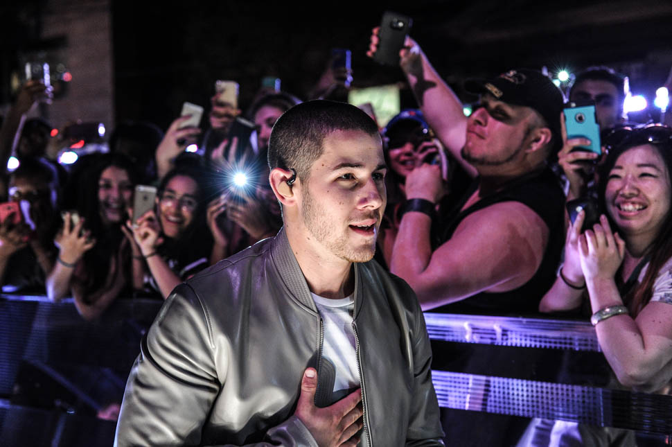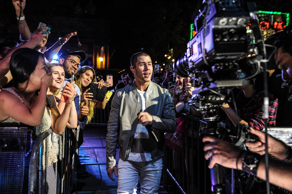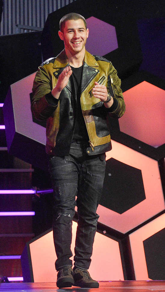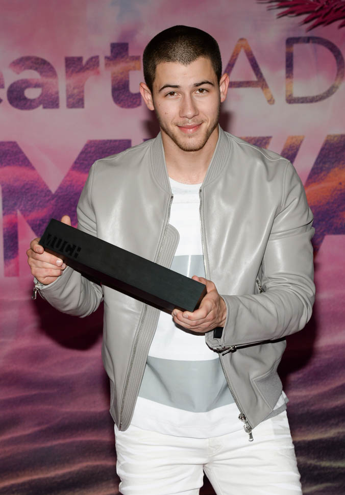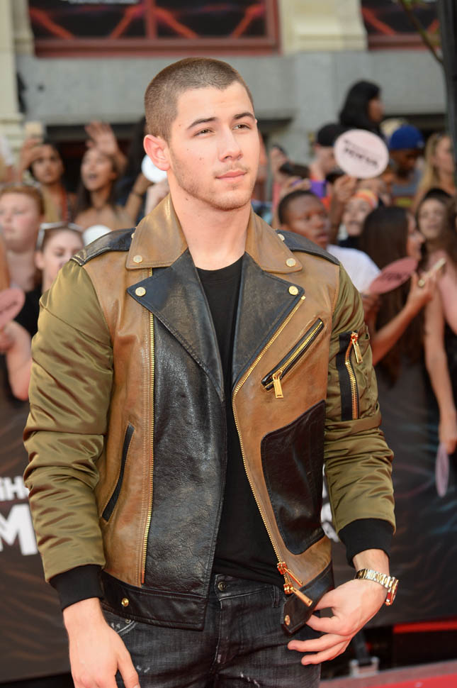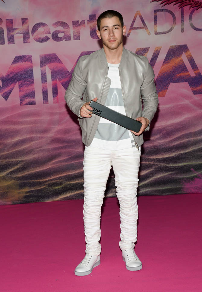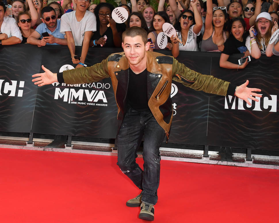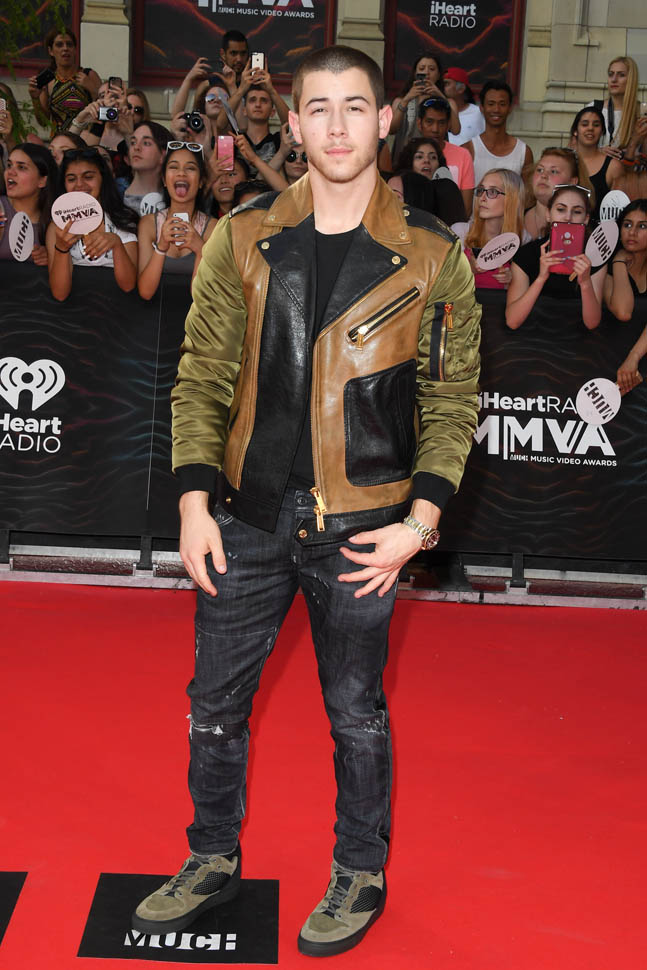 At the iHeart Radio MMVAs, they pull the arrival vehicles right onto the carpet so that the transportation becomes part of the act. Nick Jonas drove himself in a convertible; I looked over at him as he was waiting for the cameras to get in position to pick him up for the live broadcast and he had his right arm slung over the passenger seat, a total pose, sure, but also totally natural, totally comfortable. This is what I was thinking the whole time, watching him navigate that carpet. This kid is SO comfortable. When his bodyguard crowded him before the photo wall, he gently nudged the man aside, turned around to face the media wall, and gave this gift to photographers: