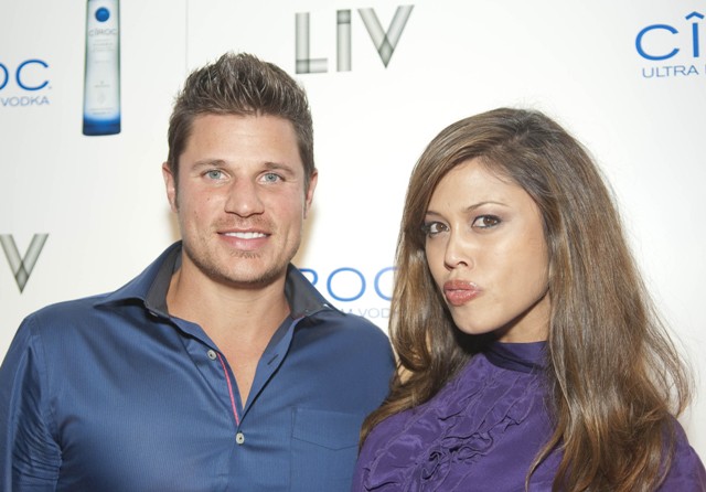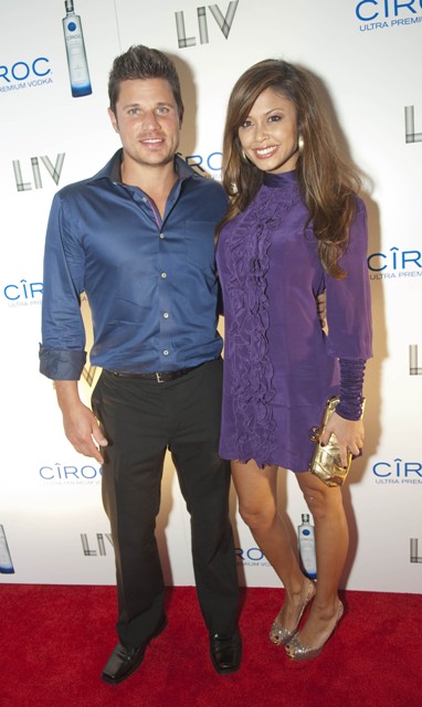 In Miami at LIV at the Fountainebleau – Nick and Nessa in matching shiny sheen delight. But not really. Vanessa Minnillo is such a beautiful girl in real life. But her persistent pageant styles are for sh-t. And not sure what she’s doing with that hair.