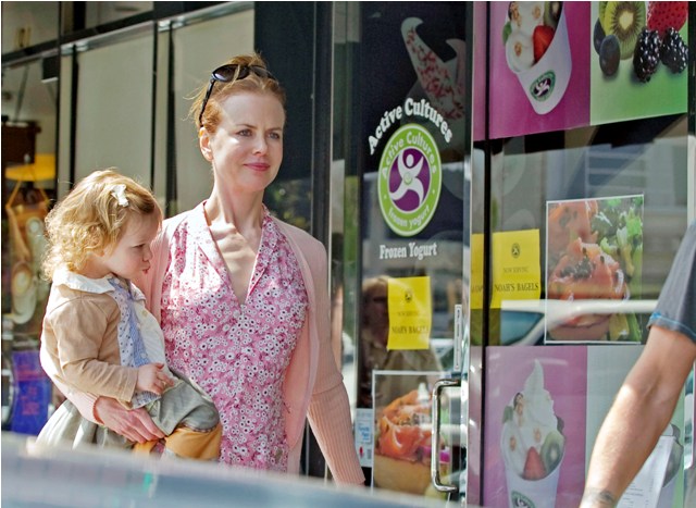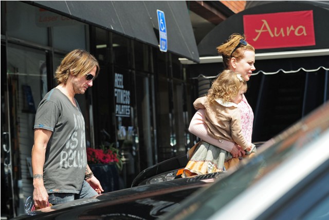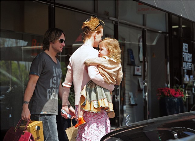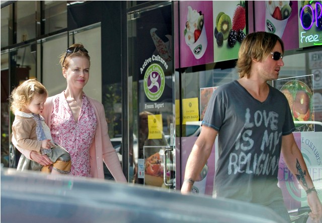 She and Keith Urban were photographed out for froyo yesterday with Sunday Rose in Studio City. Gran is currently shooting Just Go With It with Adam Sandler and Jennifer Aniston. Weird, non? Of course Nicole would never, ever be living in Hollywood it not for the work. What? Of course not. She’s so down home Nashville. Those are, like, her People, you know? And totally prefers their company to flying private on Rupert Murdoch’s private jet.