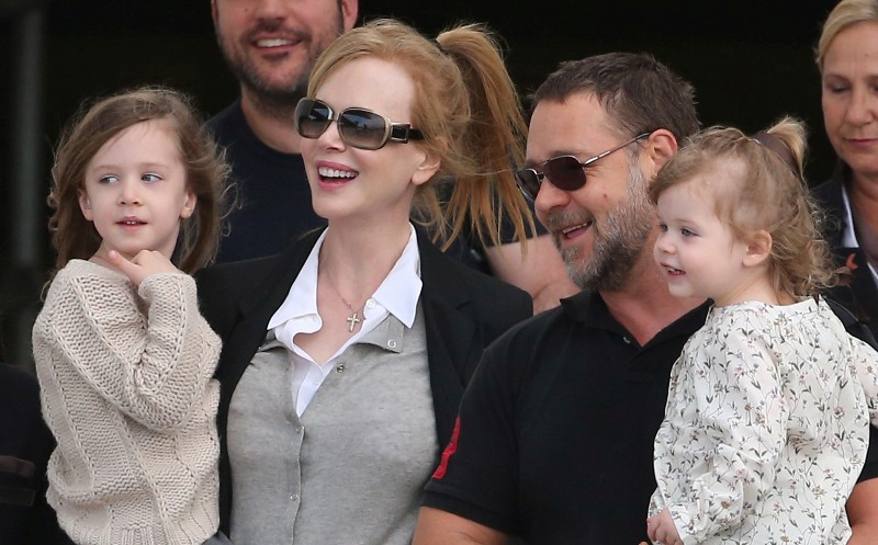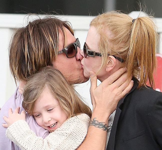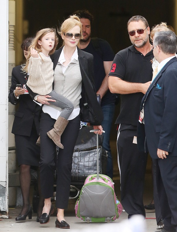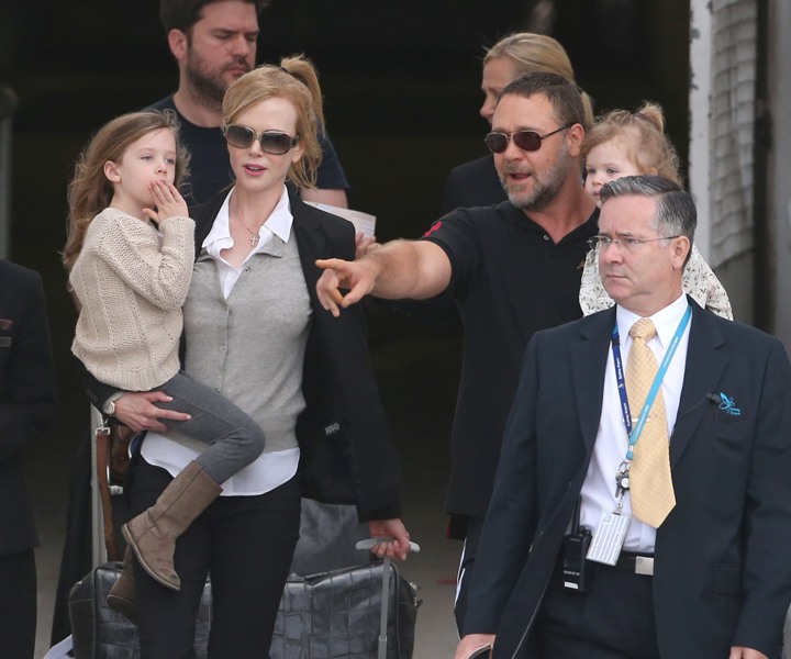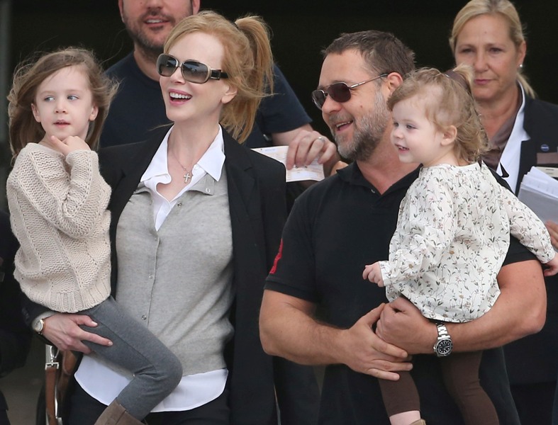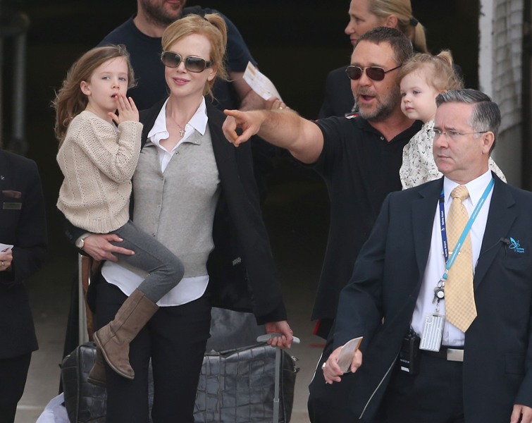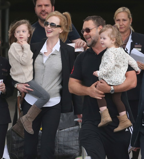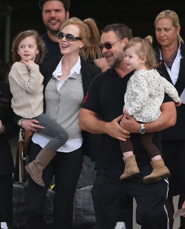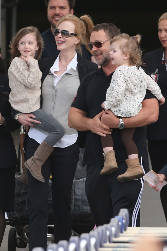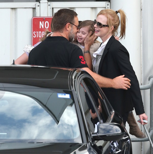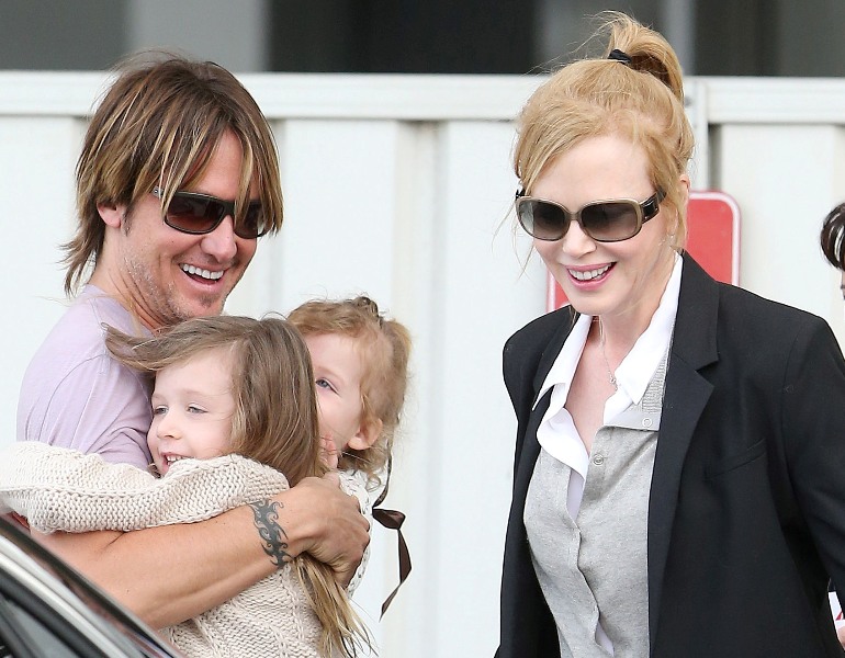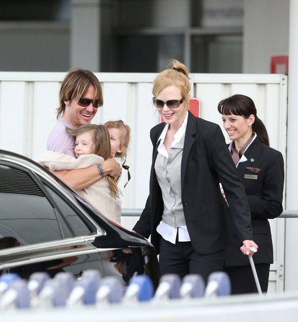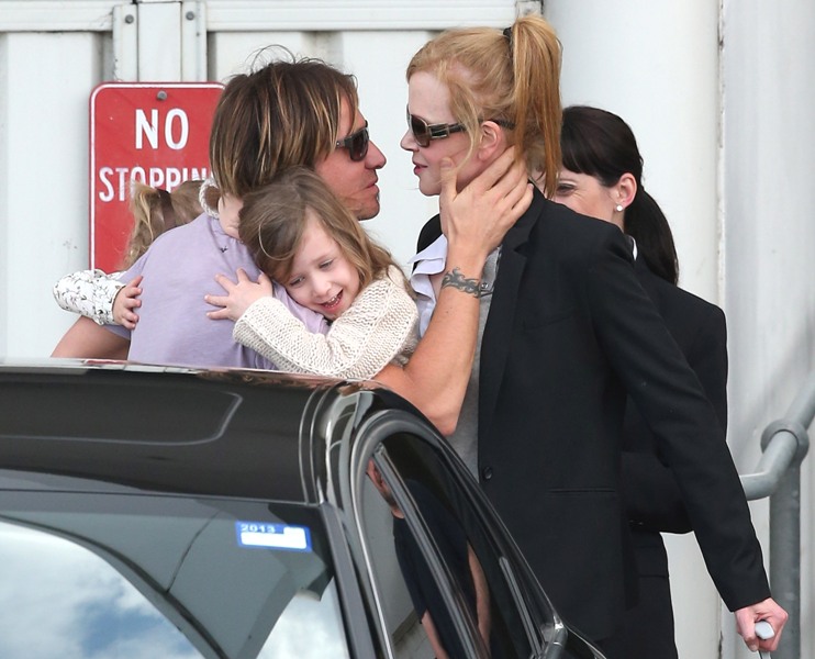 Nicole Kidman arrived in Sydney today with daughters Sunday and Faith. Evidently she was on the same flight as Russell Crowe as they exited the airport together, each carrying one of the girls, and if you didn’t know about gossip and celebrities, you’d think they were the parents, only Keith Urban was there to meet them and, well, you can see that happy reunion below.