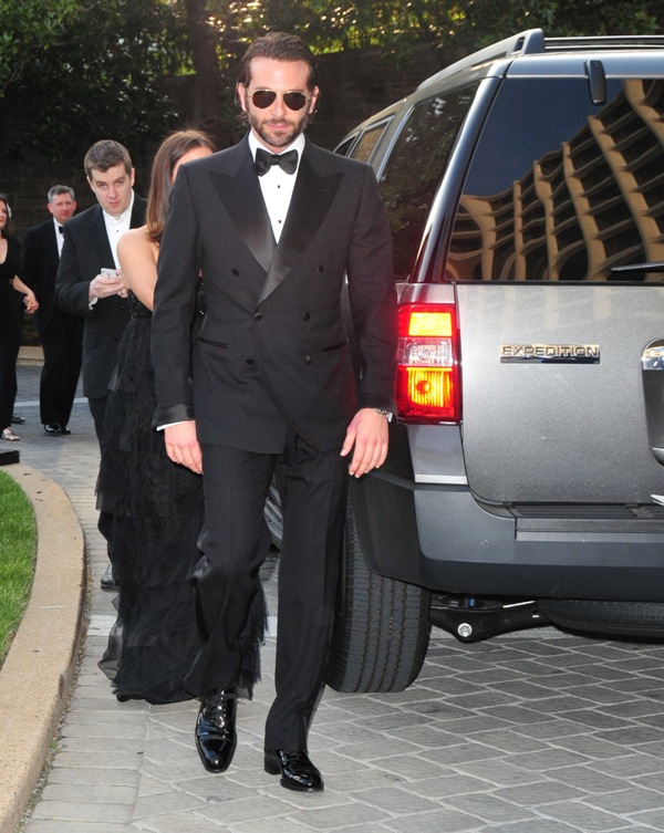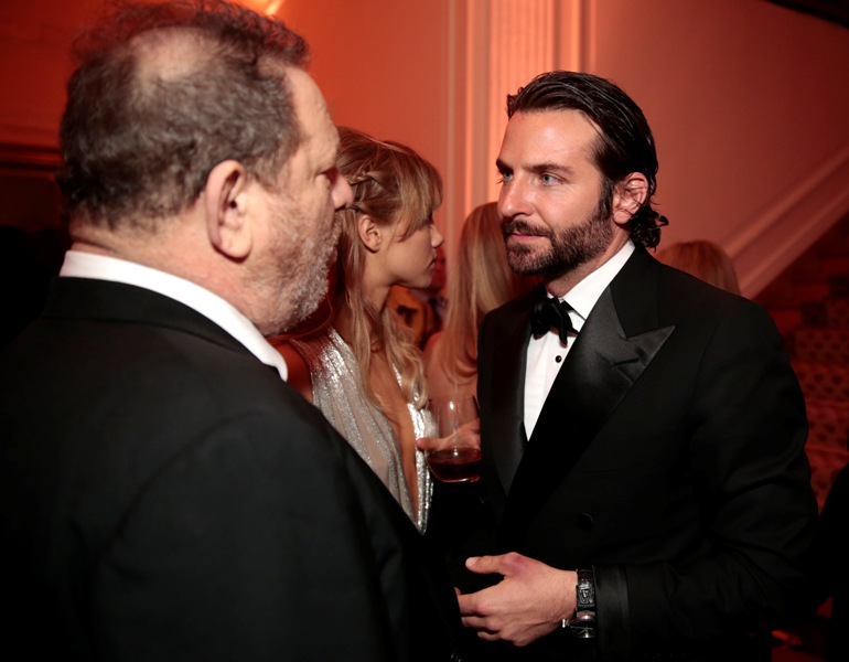 Bradley Cooper didn’t. He was shot getting out of the car and heading into the venue but did not stop for photographs. He was photographed however at the Bloomberg Vanity Fair after-party talking to his boss, Harvey Weinstein, but barely. And look closely -- I think that might be Suki Waterhouse just behind him in silver.