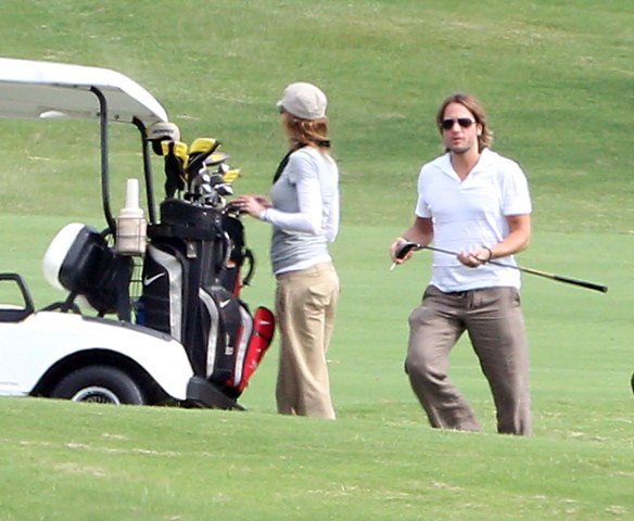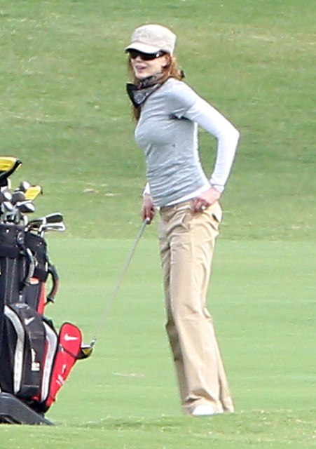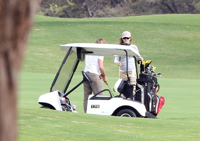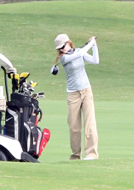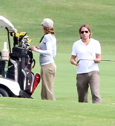 Anyway, check out Granny Freeze Nicole Kidman and Third Lip with Keith Urban playing golf in Maui this weekend. Is Granny wearing a collar? It looks like a double tee to me. If that were me I’d be thrown off the course. Gran is past parallel. Overswing.