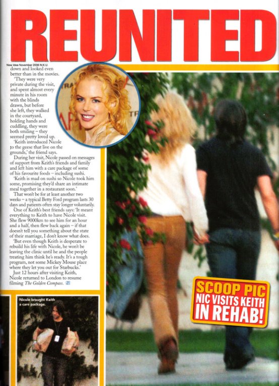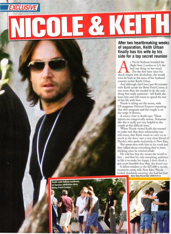 Check out these scans from an Australian magazine called New Idea – exclusive photos of Keith Urban at Betty Ford with a few other patients and enjoying some personal time with his wife. Quite intimate, non? In’it amazing the pappies were able to get so close? And still no recent photos of her with her children? I’m telling you gossips…wonders in Hollywood never cease. Further evidence of staging? You will note that ONLY Keith’s face is visible among the others at the treatment centre. Selective editorializing could be a factor, of course, but how opportune to find one great shot while everyone else is looking away, don’t you think? Not surprisingly, the article sings Nicole’s praises – how devoted she is to his recovery, how committed she was by flying far, far, far to be by his side during his ordeal. Standing By Her Man - the MiniVan Majority, along with the amateur gossip, is totally in love. Interesting little tidbit though – guess who works at New Idea Magazine? Well…none other than Antonia Kidman, her sister. Coincidence or conspiracy??? Oh and by the way? Who"s getting married this weekend? Thanks to Claude for the scans.