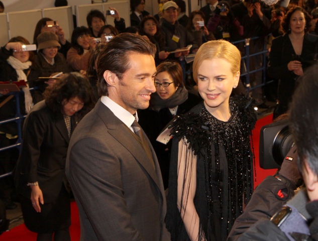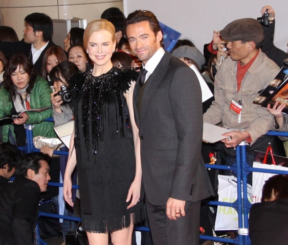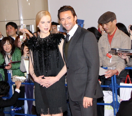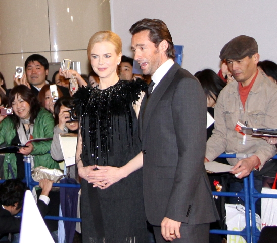 In Tokyo today at the Japan premiere of Australia – Hugh Jackman and Granny Freeze Nicole Kidman posing for photos. Apparently Gran did not linger long but wore a black baby doll making sure to cover her hands over her stomach constantly. She didn’t seem bump-ish to me on Sunday at the Oscars but then again, never doubt the magic of Spanx.