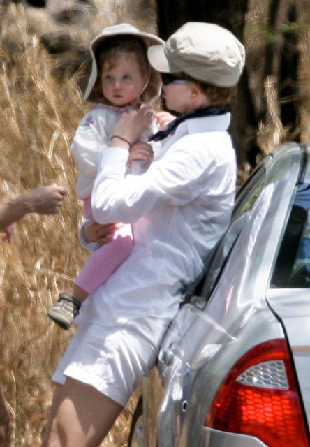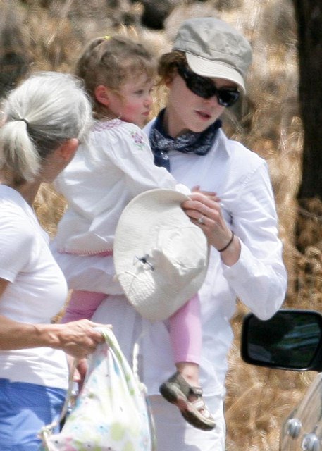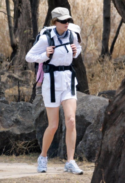 Gran is in Hawaii shooting Just Go With It with Jennifer Aniston and Adam Sandler. This weekend she went for a hike with her staff and Sunday Rose strapped to her back. From this distance, without perfect resolution on the pictures, and therefore no zoom on Third Lip, it’s almost like the old days again. Squint and you can almost pretend it’s her from Days of Thunder.