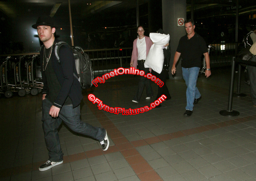 Nicole Richie behind a giant pillow on her way from LAX to Calgary with Joel Madden. Good Charlotte is scheduled to take the stage at Stampede tonight – yee hawwww!!! Of course you know tomorrow was supposed to be the start of her DUI trial though her attorneys have now asked for an extension and there will be a hearing tomorrow to determine whether or not the extension is granted. As such, Nicole is reportedly not expected to be in court tomorrow though the “cosmetics” of the situation can’t be good.