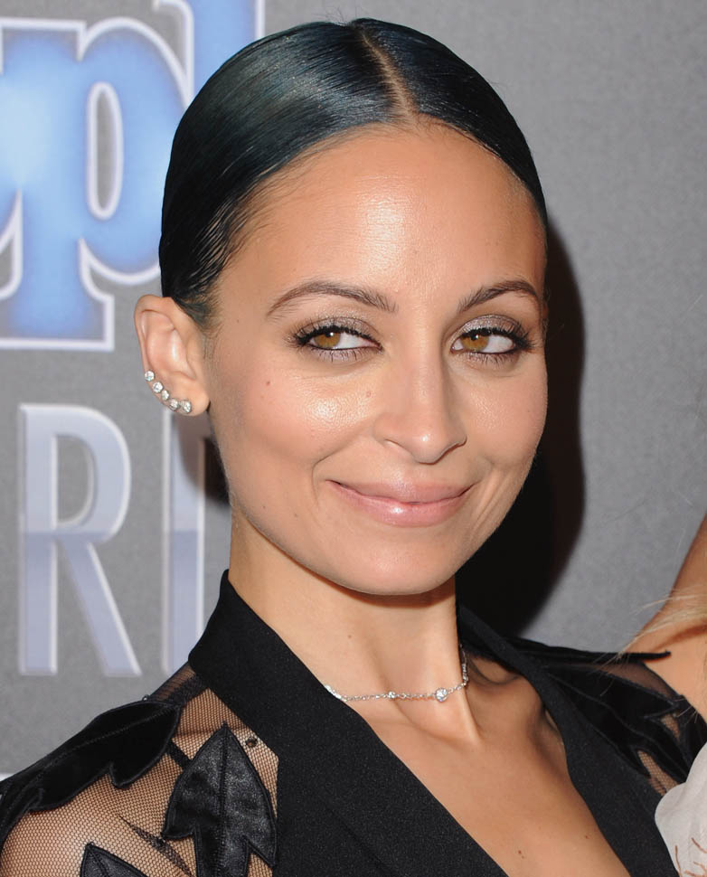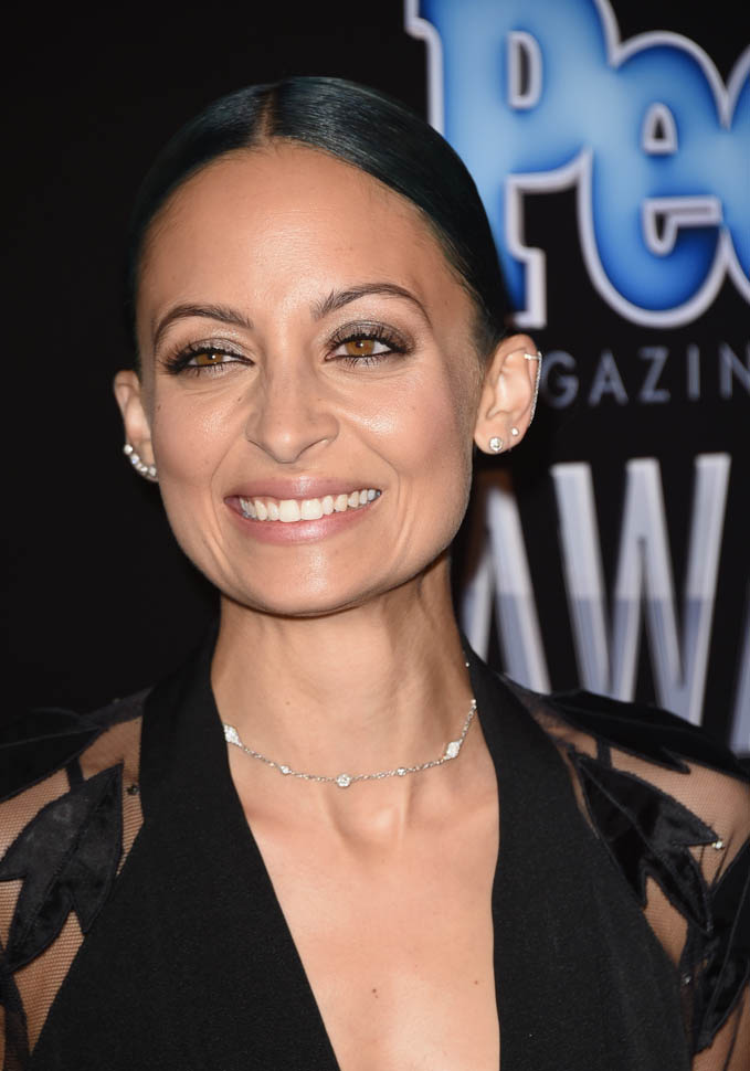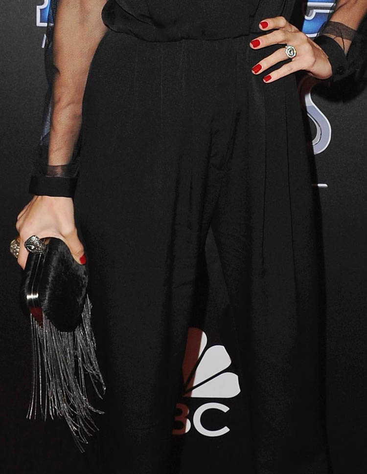 First Nicole Richie in a black jumpsuit with sheer sleeves and leaves delicately weaved on the shoulders. And the fringed clutch. So well done, on every detail.
