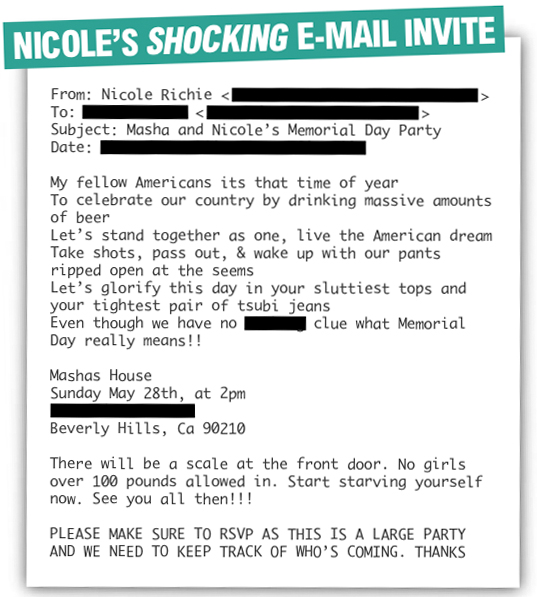 Nicole Richie’s Memorial Day BBQ invitation – her rep says she was being sarcastic. I actually believe this.