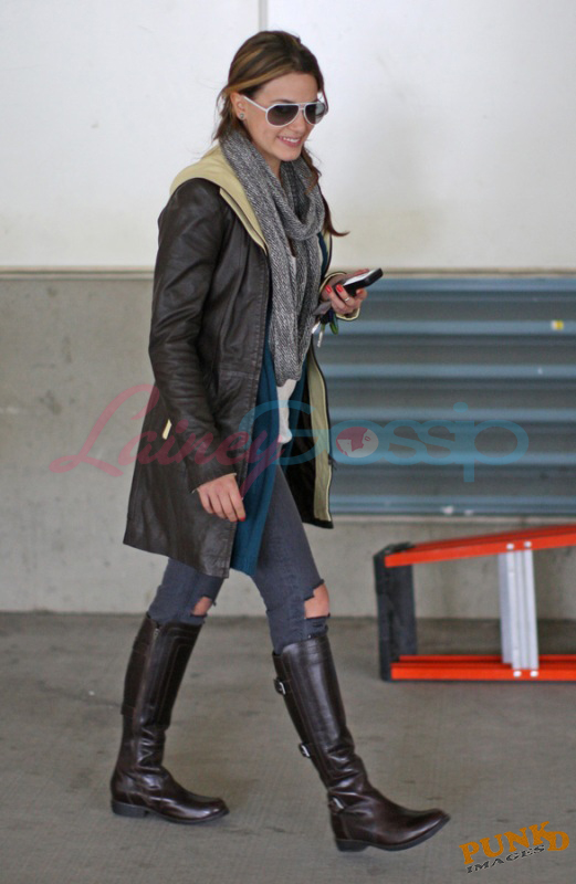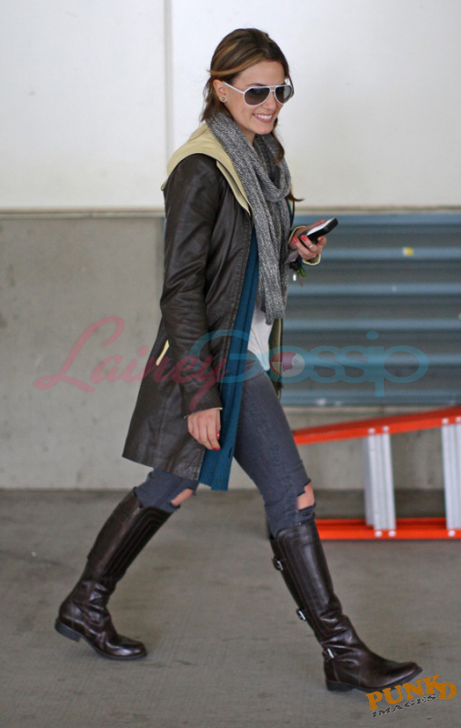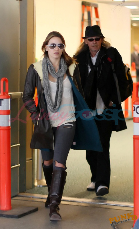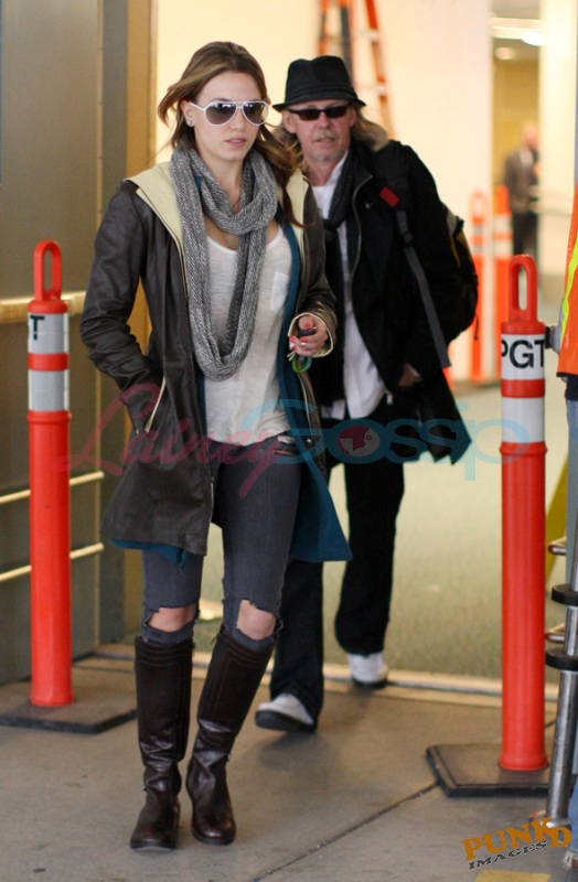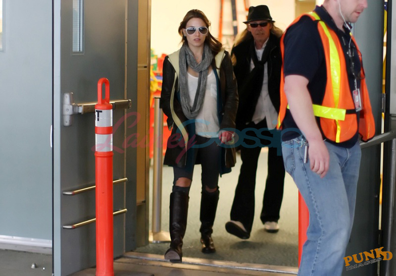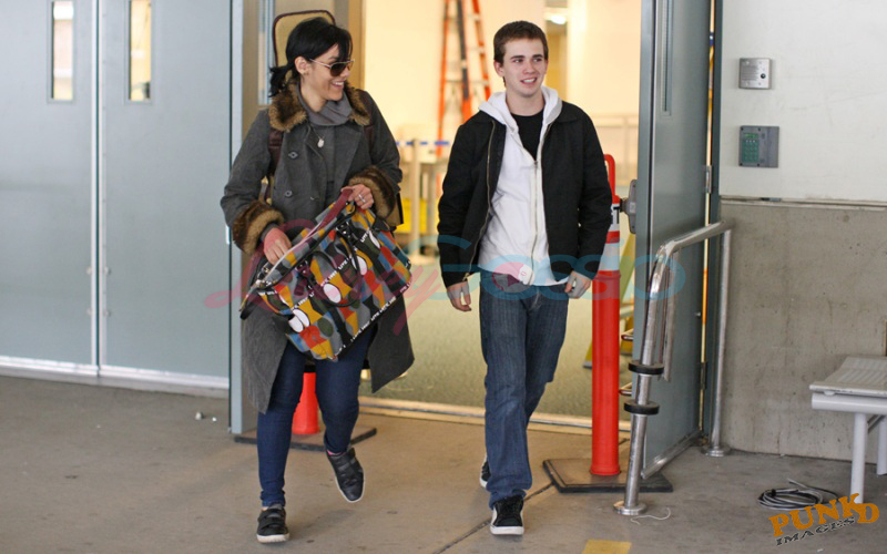 She came back yesterday and will start shooting her scenes soon. Here she is at the airport with a friend, an older man, and a teenaged boy.