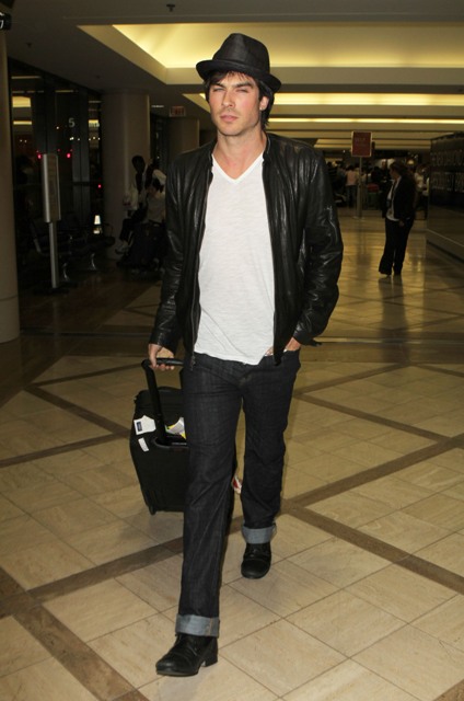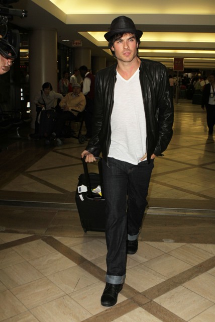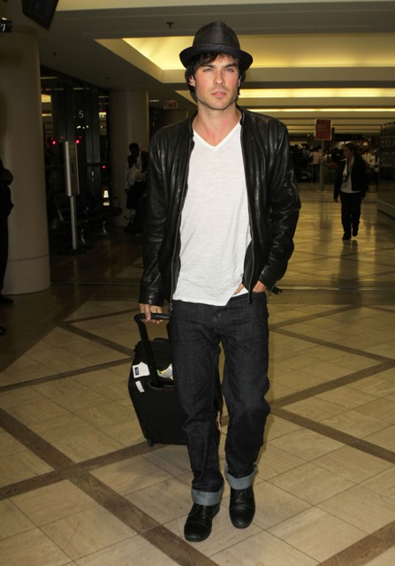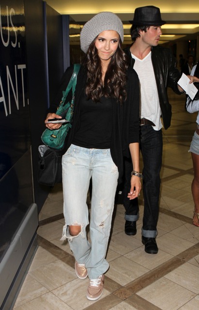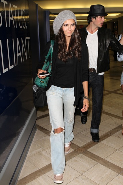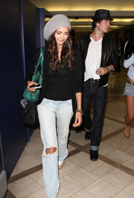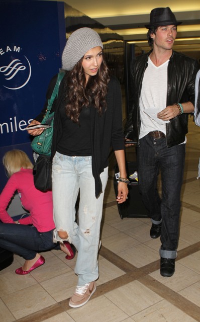 Here are Nina Dobrev and Ian Somerhalder, rumoured to be dating, at LAX after the TCAs probably heading back to resume shooting the new season in Georgia. True? No clue. All I know is that at the end of February, Ian was loving up another girl called Megan – photos are here. And these pictures were taken AFTER speculation about Nina and Ian gained momentum.