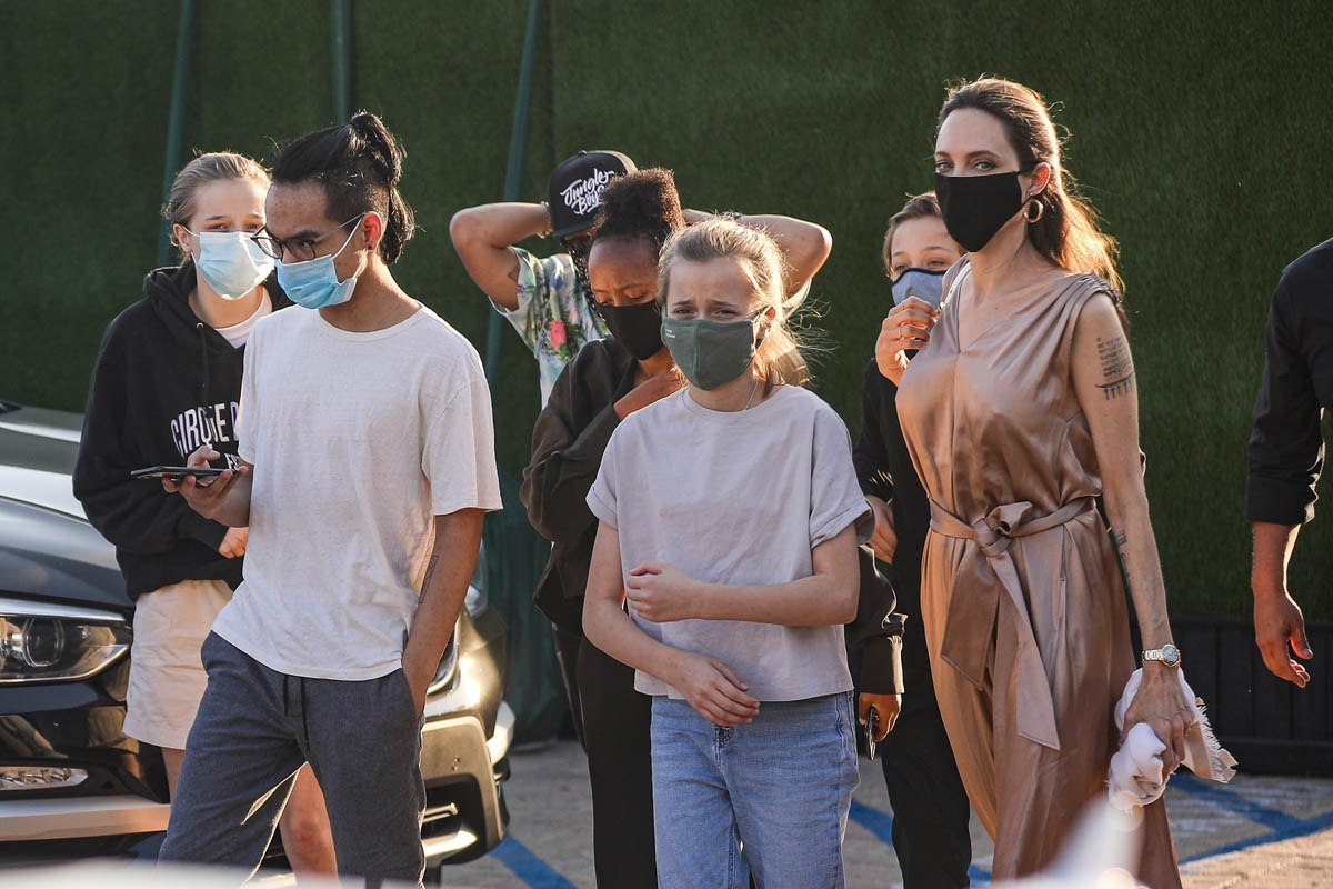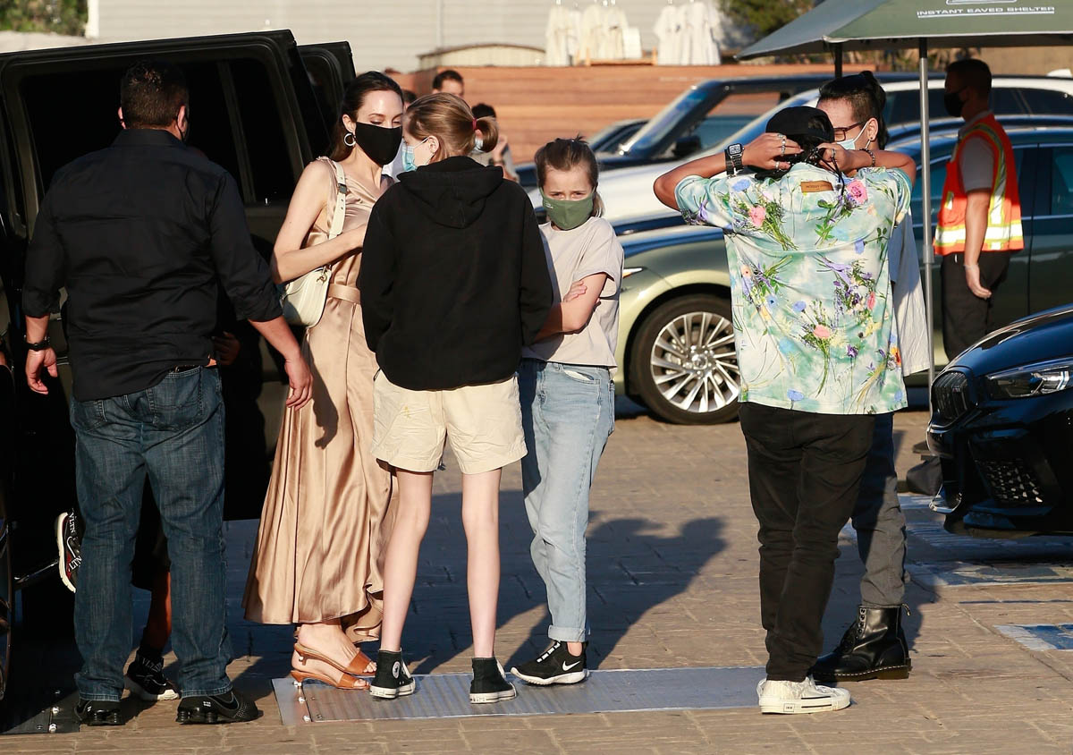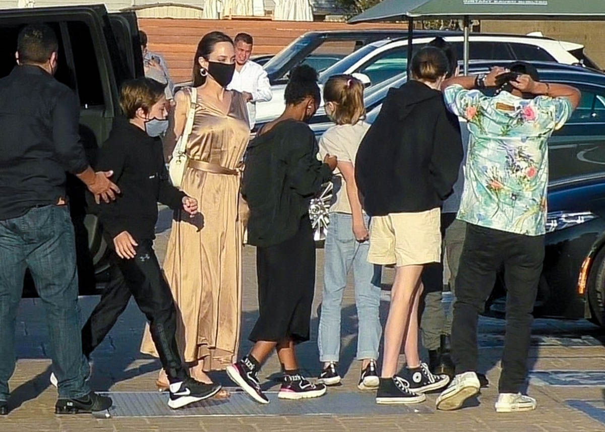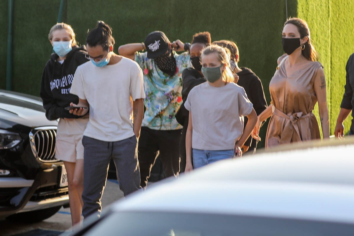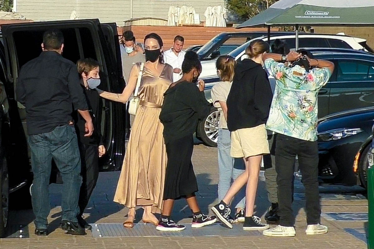Now it’s Angelina Jolie, yesterday, on her own with those six kids, all of them – Maddox, Pax, Zahara, Shiloh, Vivienne, and Knox – out at Nobu in Malibu. It’s the first time in a while that they’ve been photographed all of them together.
