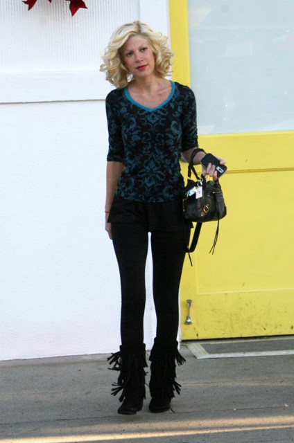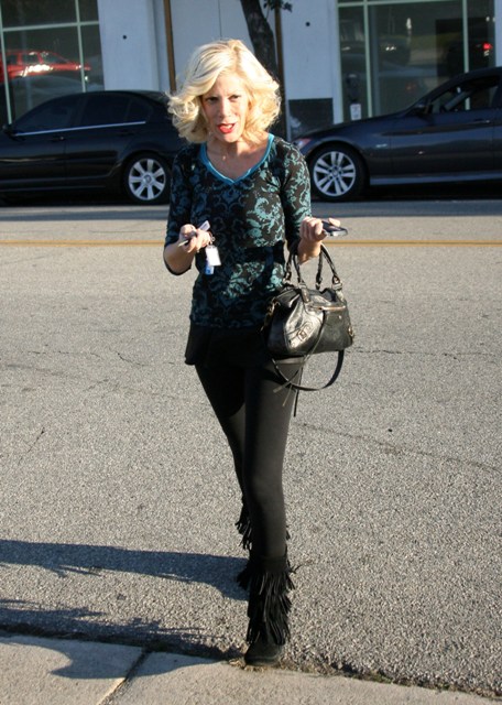 This is Tori yesterday leaving a hair appointment offending Balenciaga with her wannabe Nicole Richie imitation.