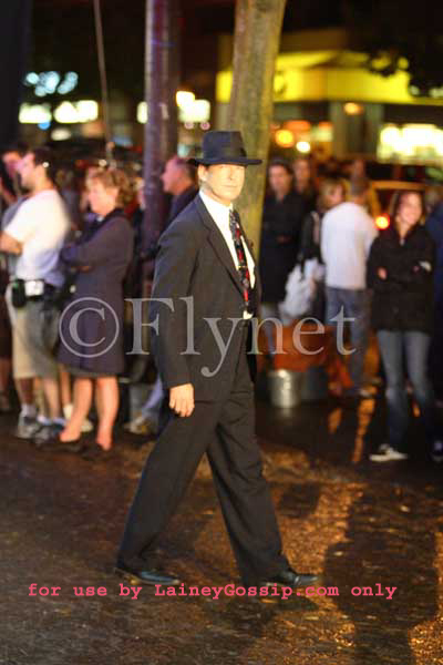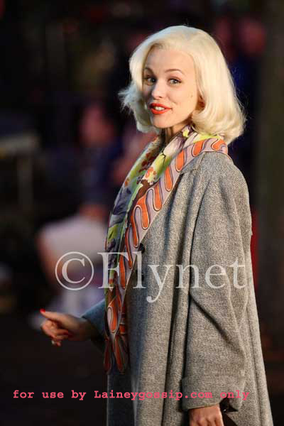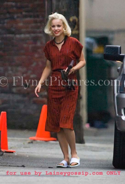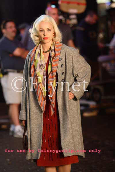 Images for use exclusively on Laineygossip.com courtesy FLYNET Images. August 8th. She went to yoga in Vancouver. Then reported to work. Practically an open set on Broadway at the Hollywood Theatre in Vancouver. Fans, extras, two pubs nearby - a frickin" spectacle. Rachel was shy but lit up when a fan shouted out her name. Very sweet. Not sure if you want to know this but you said you wanted all the details here goes. She also smokes on occasion. Was seen a few times in the car over the course of the last few days with a ciggie in hand. But also endearing, especially when she gamely walked out in slippers along a needle infested alley off Hastings. See attached. Total gorgessity, non? Look at that face! And then Pierce. A true rock star by all accounts. Playing it up for the crowd, take after take, cheekily asking for feedback, undeterred by the rowdy Irish hootin" away at the bar next door. And interestingly enough, when he was begged by onlookers to do a little "Bond", his response was: "Never again, those days are over."