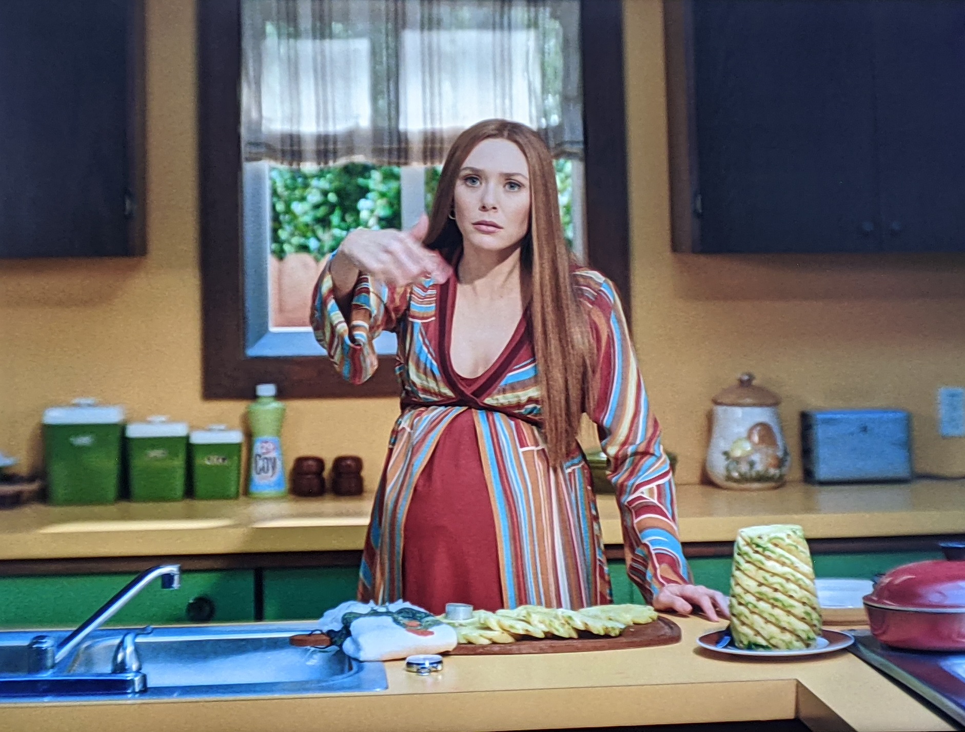 The change to technicolor at the end of episode two teased us with a barely-there glimpse of a powder blue kitchen, but I was crushed when episode three, “Now In Color”, revealed a hideous 1970s kitchen of avocado and mustard, with laminate countertops and no charming mid-century appliances. I get it, the show is evolving with the period-accurate sitcom styles, but nothing will drive home the aesthetic drought in home goods during the 1970s like going from Wanda’s beautiful blue 1960s kitchen to the hideous laminate eyesore of The Brady Bunch. We barely spend any time at all in the 1970s kitchen, and no wonder. It is puke. It is puke colored, and it makes me want to puke. There has been a major resurgence in mid-century home style, but NO ONE is asking to revisit the 1970s FOR A REASON. The only cool thing in that kitchen is the spiral-cut pineapple.