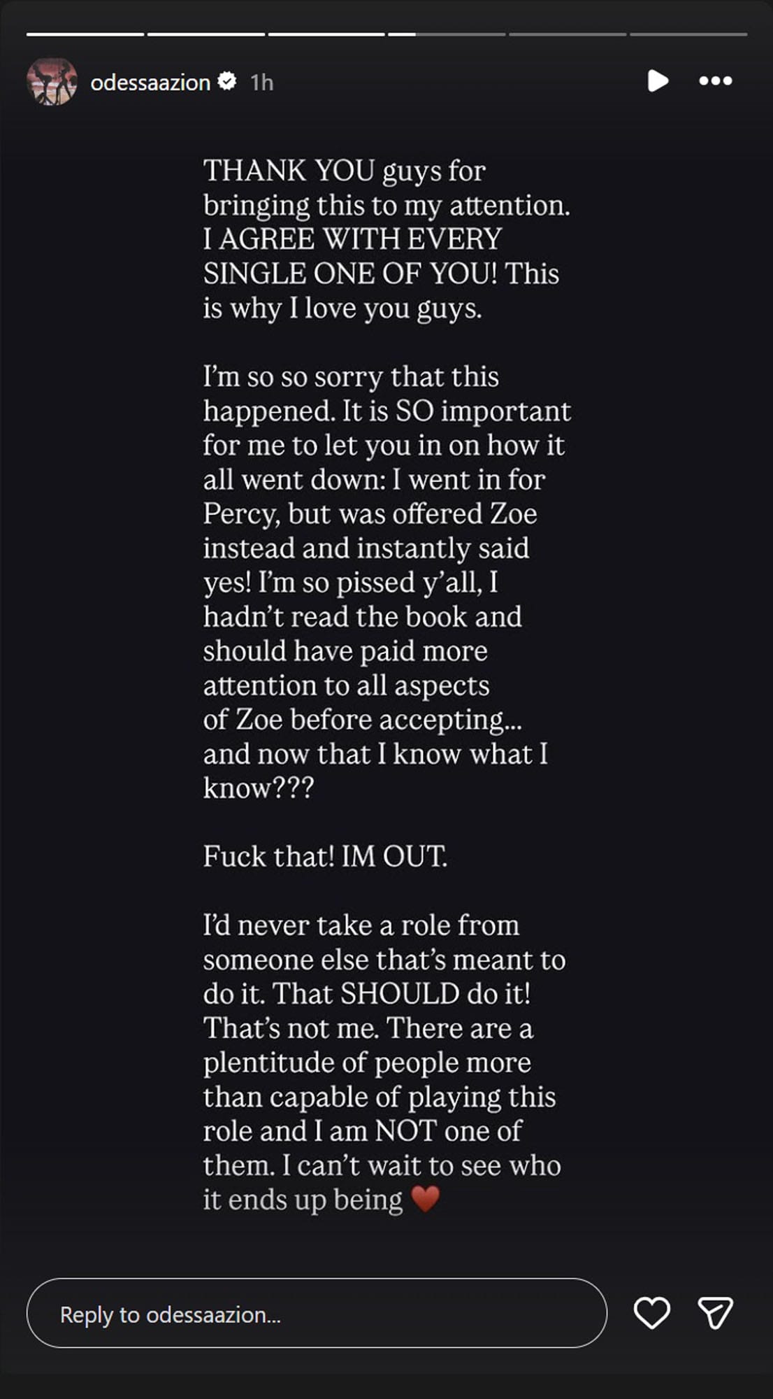 I 100% believe she has not read the novel and that there is limited or no description of Zoe in the script (not unusual), and that A’zion probably didn’t do a deep dive on the script and really didn’t notice the last name implying the character of Zoe has specific roots. A’zion is having a hot moment, I can buy young and excited to work with certain people and not really doing her homework led to her agreeing to something she was bound to hear opinions about. I don’t think she was trying to screw anyone over, just I like bet the producers/director were thinking getting an up-and-comer to play a supporting role would help boost their film’s chances in the marketplace.