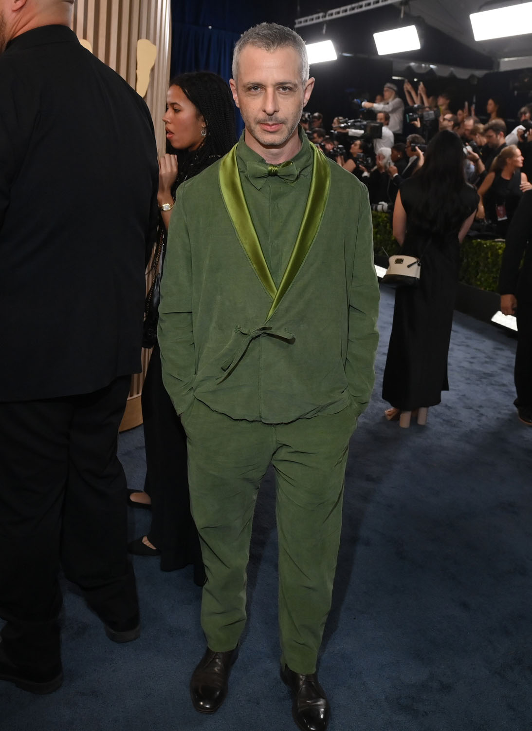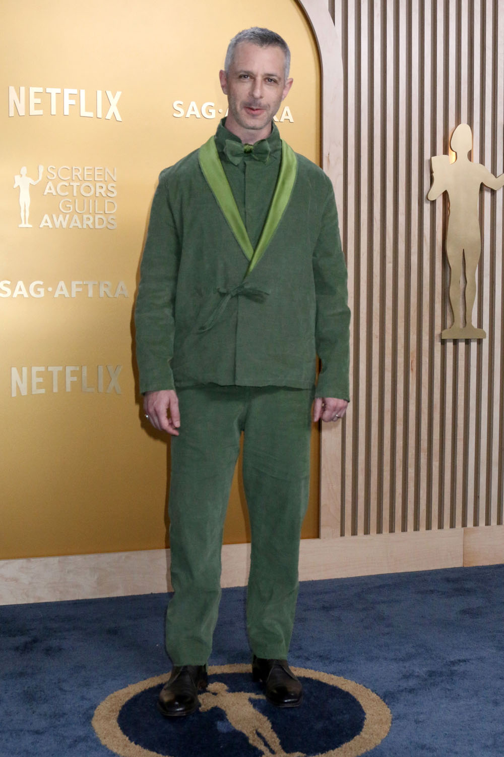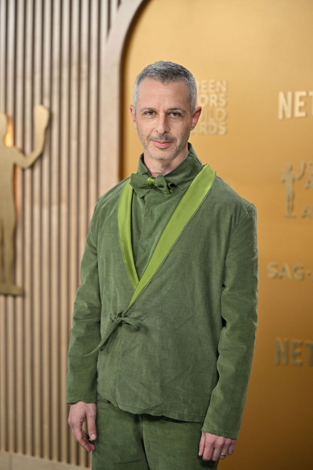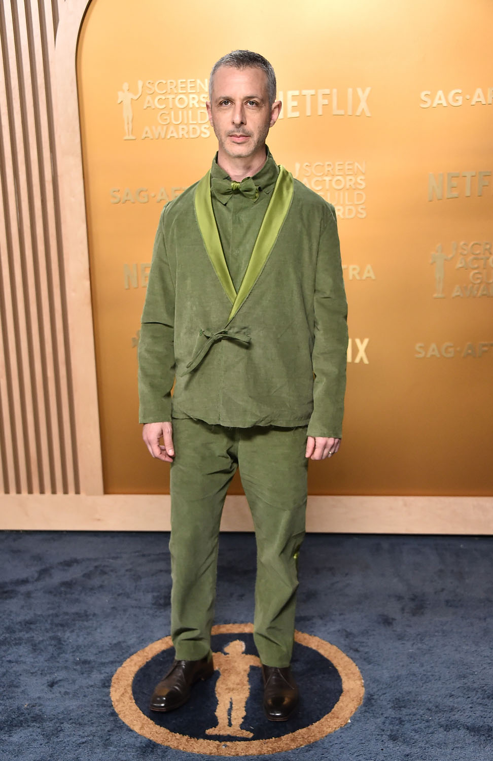 I’m never going to be mad at the fact that, when he can, Jeremy will pass over black and go with a colour. In the past his go-to has been brown; this year he seems to be leaning green. Mint green at the Golden Globes and now olive-ish for the SAGs with Kermit green on the lapels – the overall effect is kinda… pukey. Which, LOL, like I said part of this is for the comedy. And the disruption. Like the bow tie with the ribbon tie at the waist on the jacket is insane, an intentionally defiant breach of fashion rules. As is the material – lightweight and unstructured, moves like linen, considered inappropriate for a red carpet. This is well outside of the prescription, and requires someone as offbeat as Jeremy to be in on the chaos.