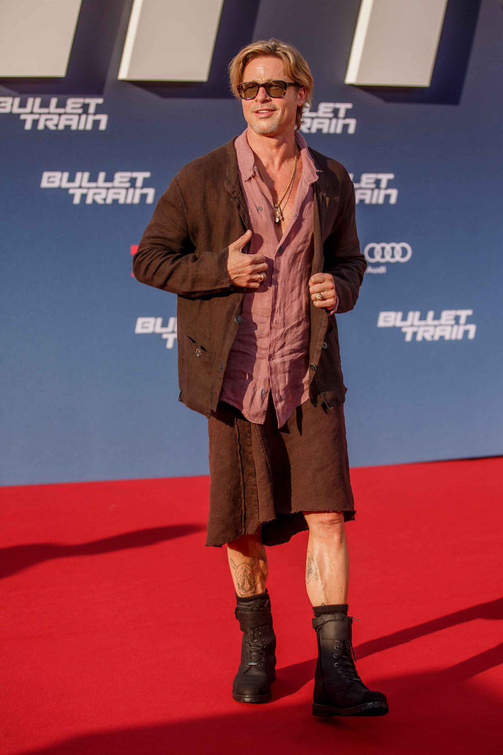 Brad Pitt. And the reason I’m bringing him into this is because Jeremy’s suit is custom Haans Nicholas Mott who also designed Brad’s linen wardrobe a couple of years ago when he was promoting Bullet Train. Here’s a reminder.