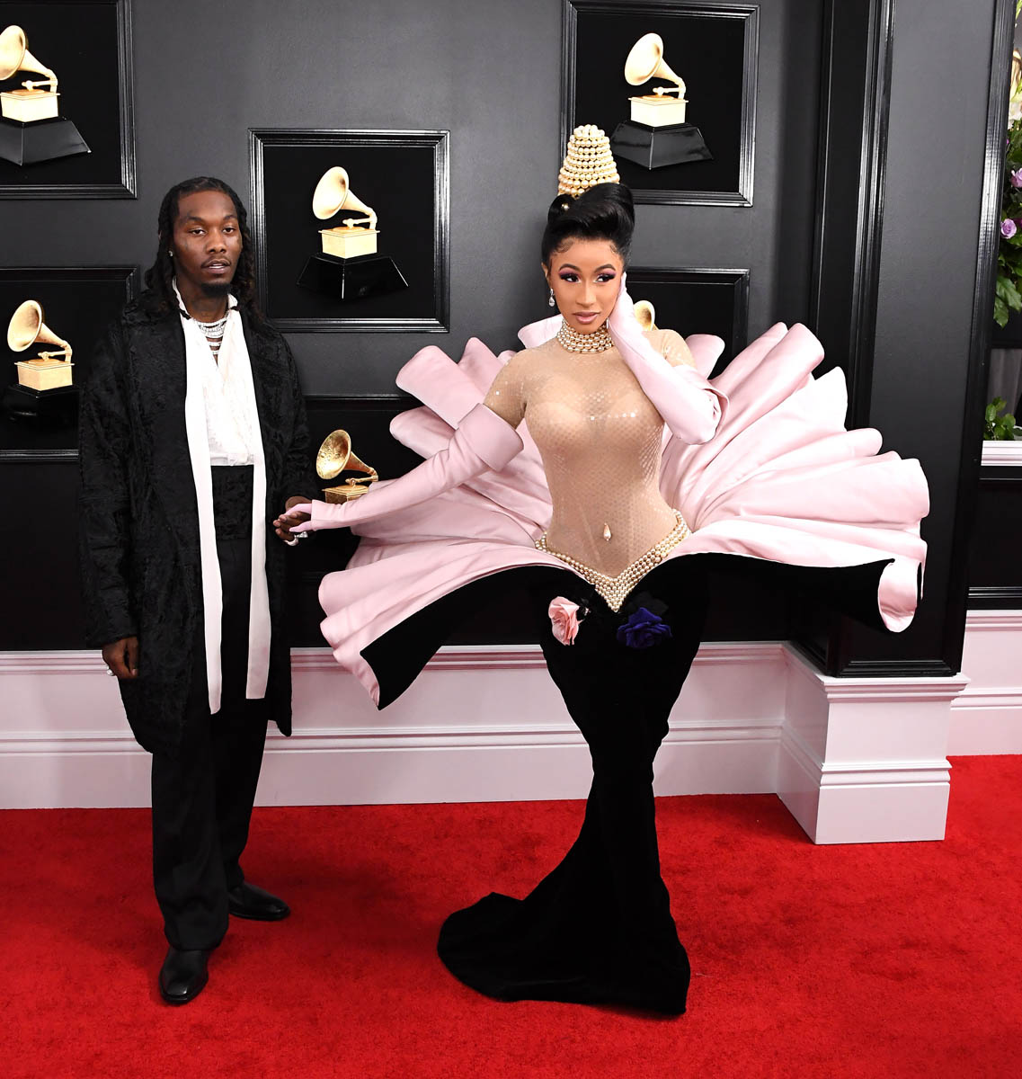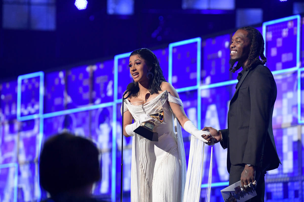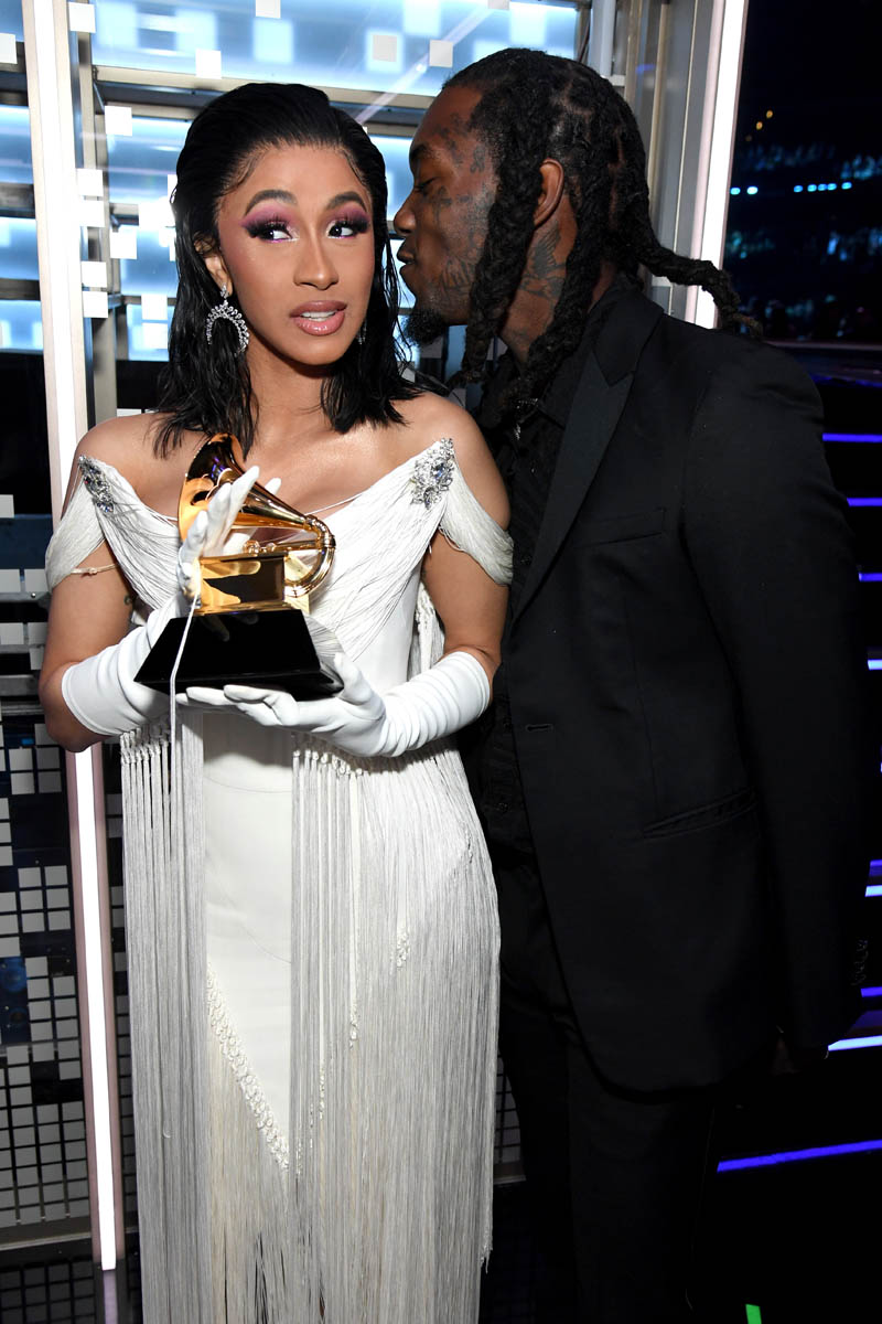 Last night was a moment in Cardi B’s career— no matter where it goes next—that she’ll look back on and remember for the rest of her life. Cardi B made music history. If we, as purveyors of pop culture, ever revisit Cardi B’s history win, we’re not going to be able to disassociate it from Cardi’s trifling ass husband because the man WAS IN EVERY FRAME. As Cardi went up to accept her award, she was holding Offset’s hand. Some may say that she pulled Offset up on stage with her, or that she wanted him there because by her own admission, she was “shaking.”