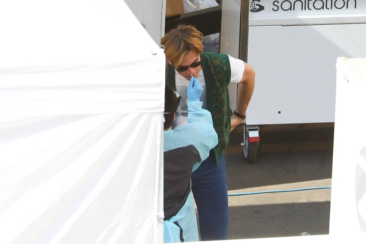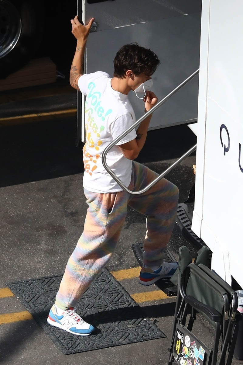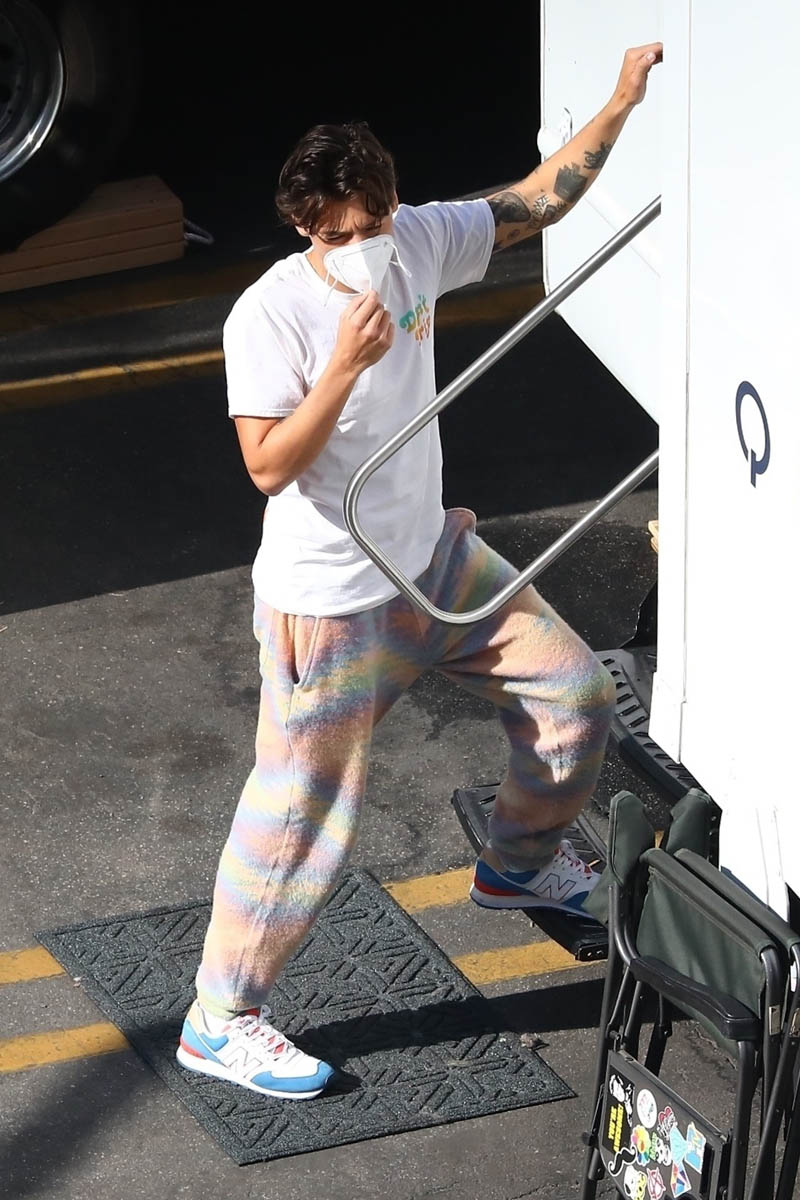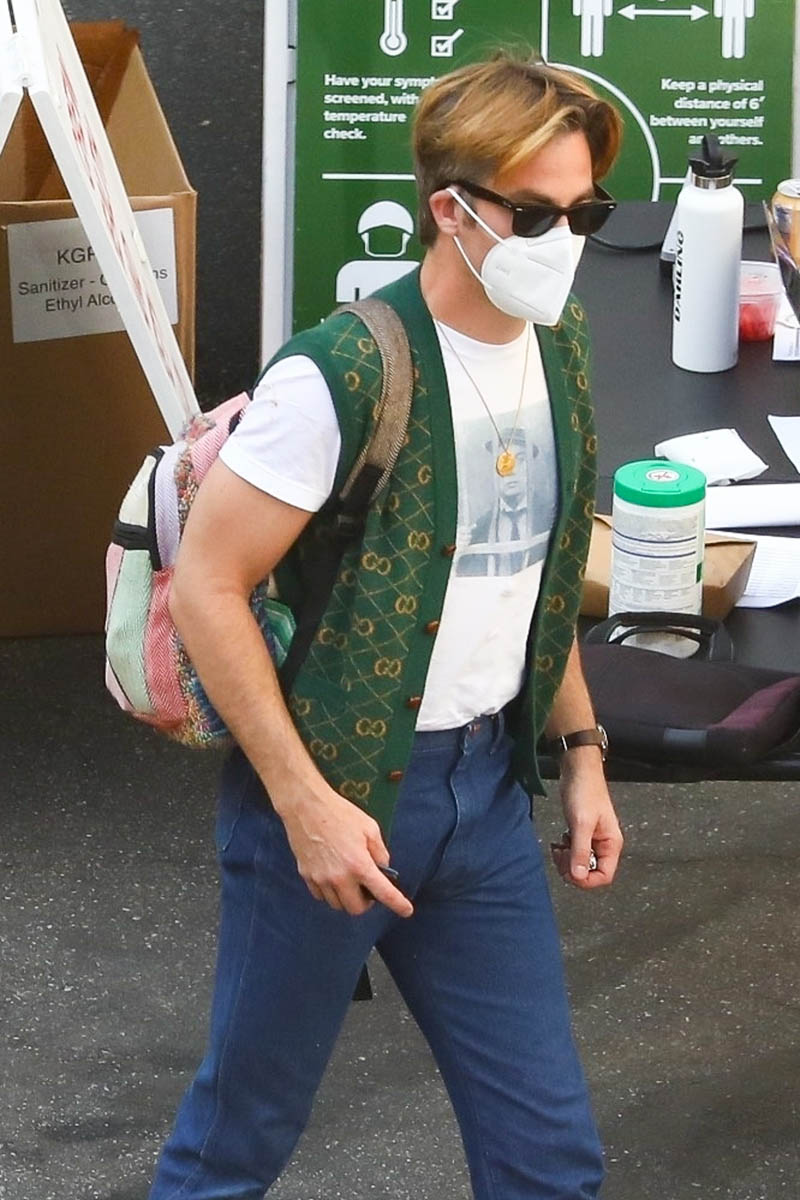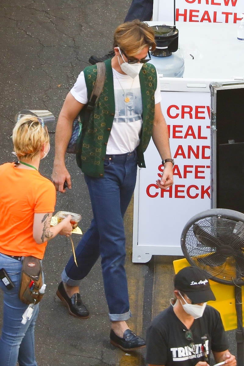 As for these set photos – these are good shots of how productions have incorporated safety protocols. People are masked and gowned and health check stations. And Chris Pine is in one of the trends of the season, wearing a sweater vest. I could see Harry Styles wearing the outfit Chris is wearing too. Harry, however, is wearing a t-shirt with a message so I wonder if he knew he’d be papped. Nick Kroll chose to send the message with his mask.