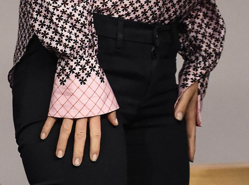 It’s a muted pink. Dusty, even? And it’s so lovely with black. I love this print, and I love the collar, and I LOVE the cuff detail like it’s a crown around her wrists.