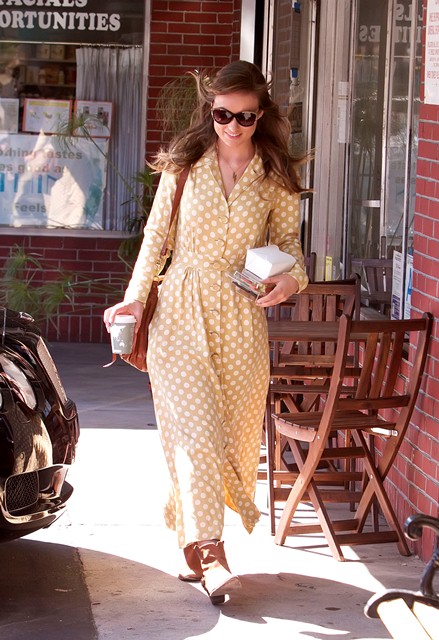 Olivia Wilde was photographed leaving an organic coffee shop in LA yesterday. What do you think of the frontier prairie dress happening here? I’m sure it’s super expensive and designery and whatever but it could also totally be part of her costume from Cowboy & Aliens too, especially with those boots. And I actually can’t decide if I like it. Wait, no. I think I do. Only I would wear this with black and white brogues. Or lace-up Repettos.