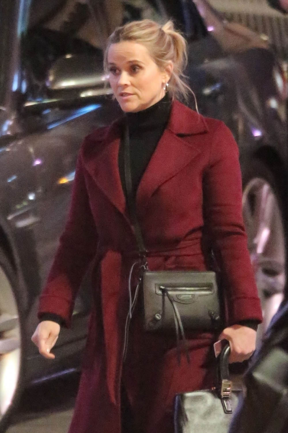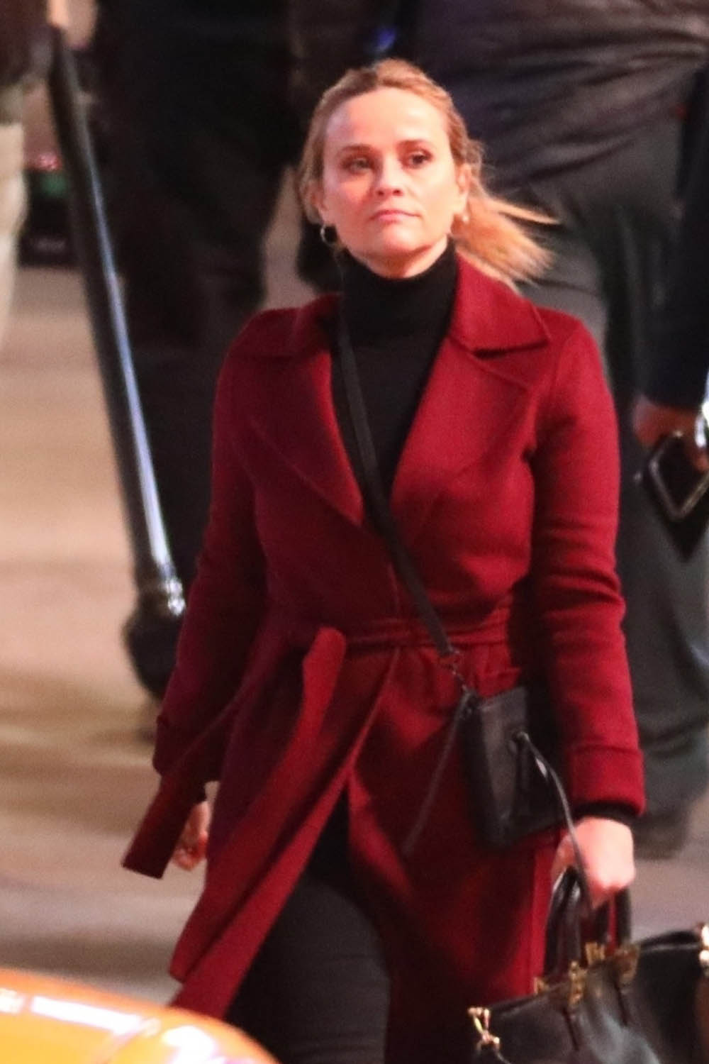 It was winter, from what I recall, when we left off and judging from their wardrobe, it is still winter on The Morning Show now, whatever they’re doing, wherever they’re going, in their news anchor vibes. Alex Levy’s got on her neutral tones, her turtleneck, and the cashmere coat. And then there’s Reese’s Bradley Jackson, who had brown hair in season one, but in all the shots I’ve seen of her on set for season two, Bradley is blonde.