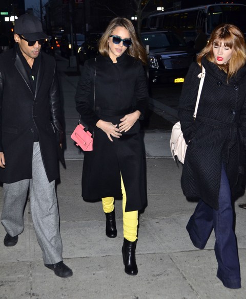 Here's Alba looking great in a pair of yellow jeans yesterday. You know what though? For some reason, yellow jeans, maybe because of the colour, and especially if it's a particularly stretchy brand, they're no good about showing ass dimples and ridges. In fact, they might even accentuate them. Obviously Alba doesn't have this problem. But you have to be careful with the pair that you get. Definitely do an ass test from several angles in every kind of lighting you can find.