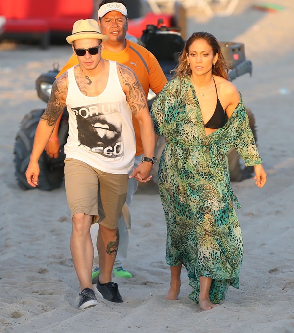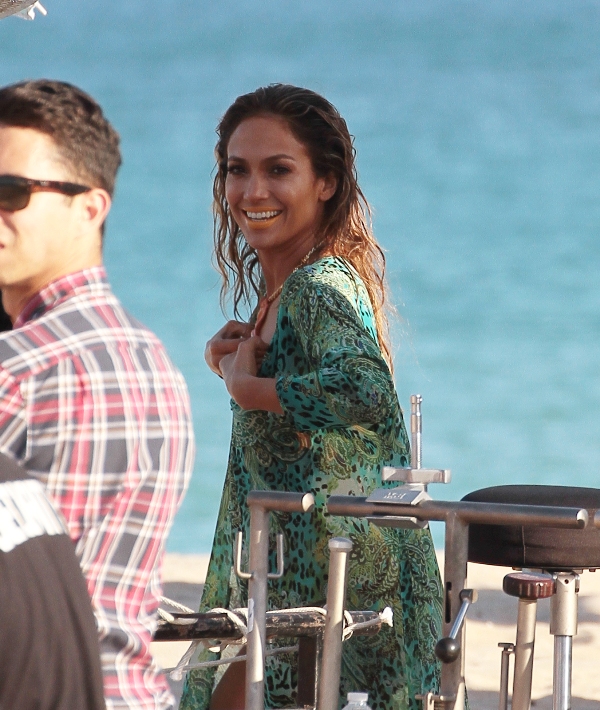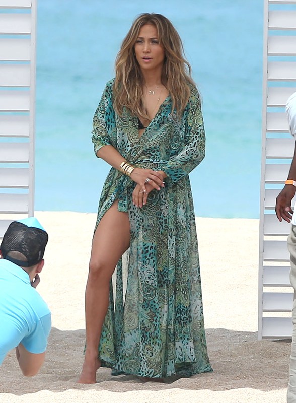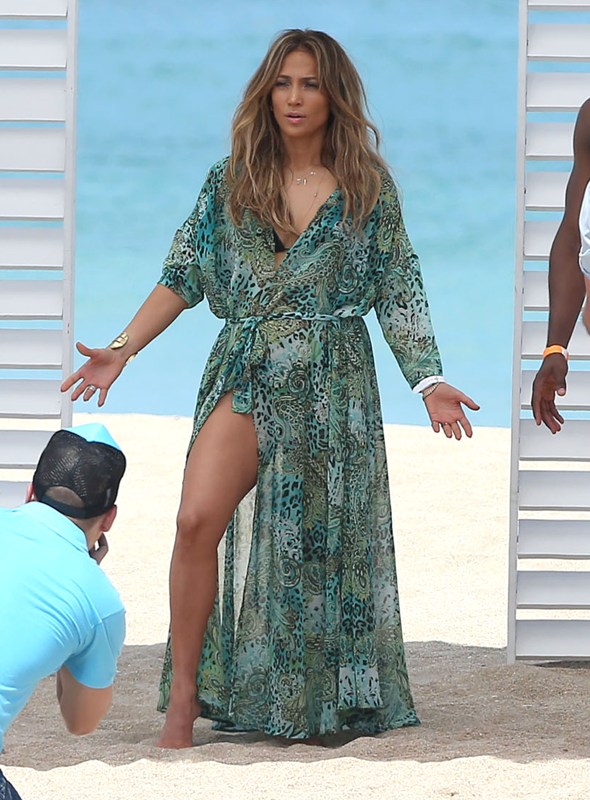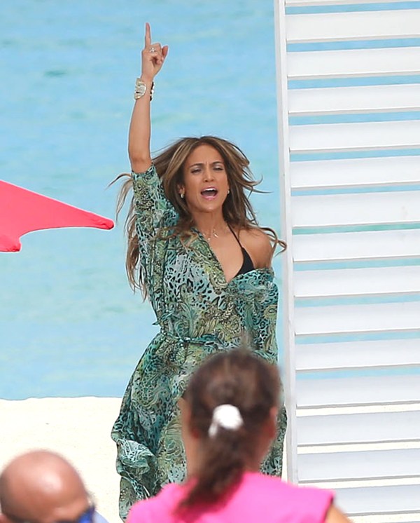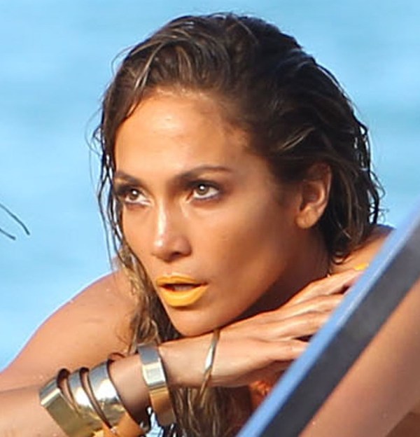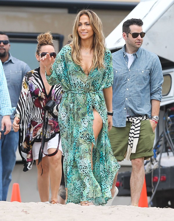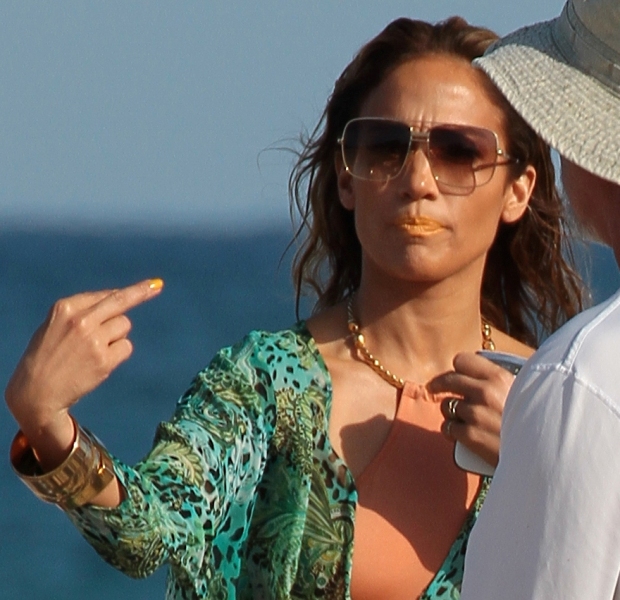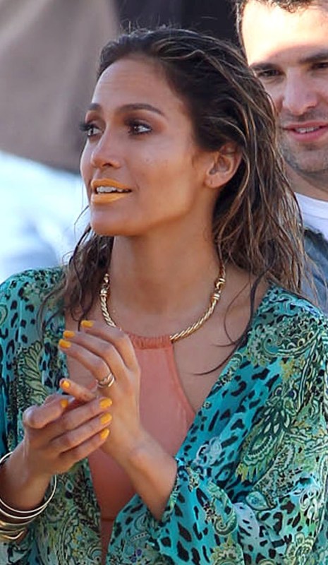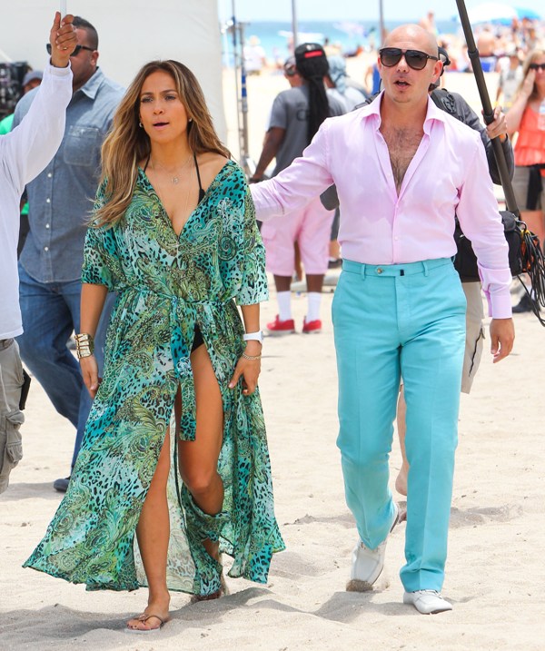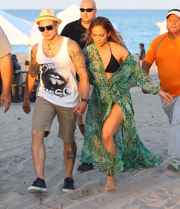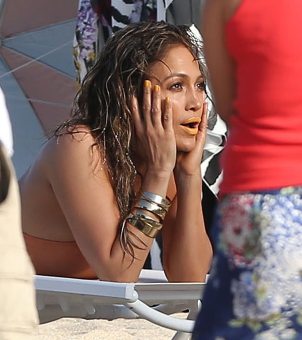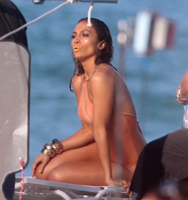 She was orange in Miami, Jennifer Lopez. An orange one-piece and orange lips. Also a green wrap dress that sorta kinda reminds me of the famous, famous one from the Grammys. And then she had to ruin it by holding hands with her Slum Bear and tenderly rubbing his neck. Check him out, thinking he’s so boss with his shirt off, running the shoot.