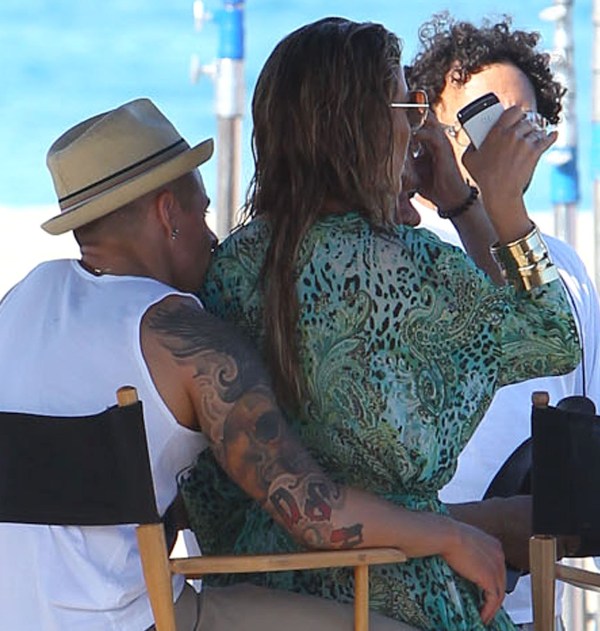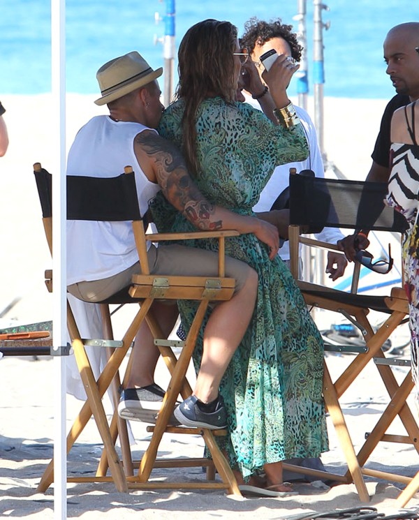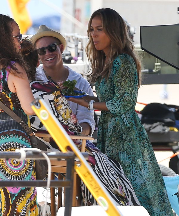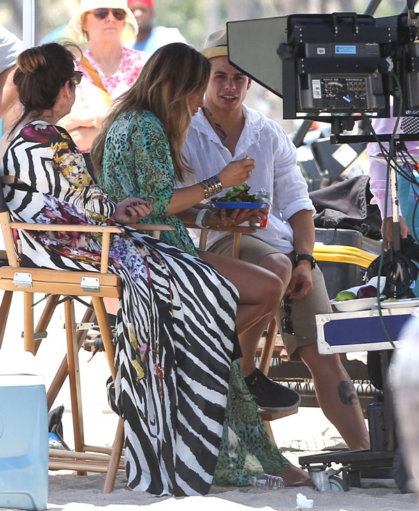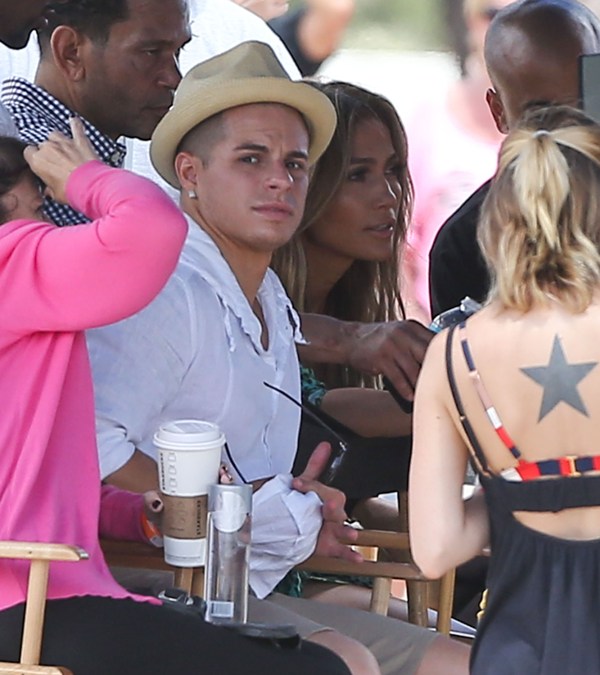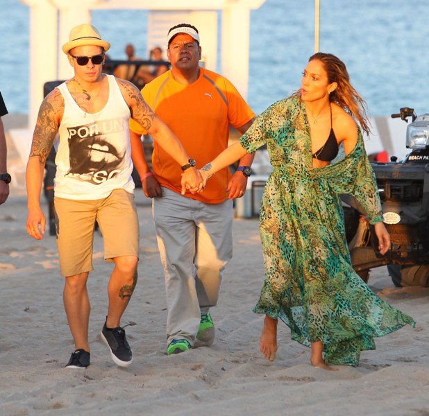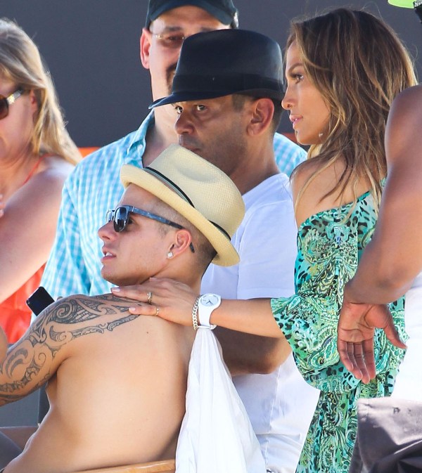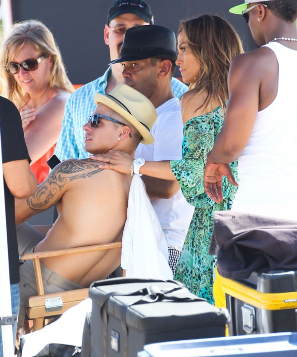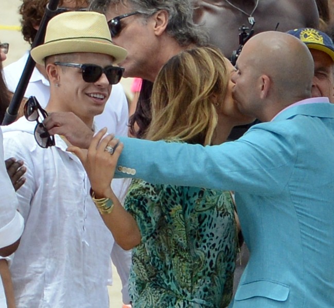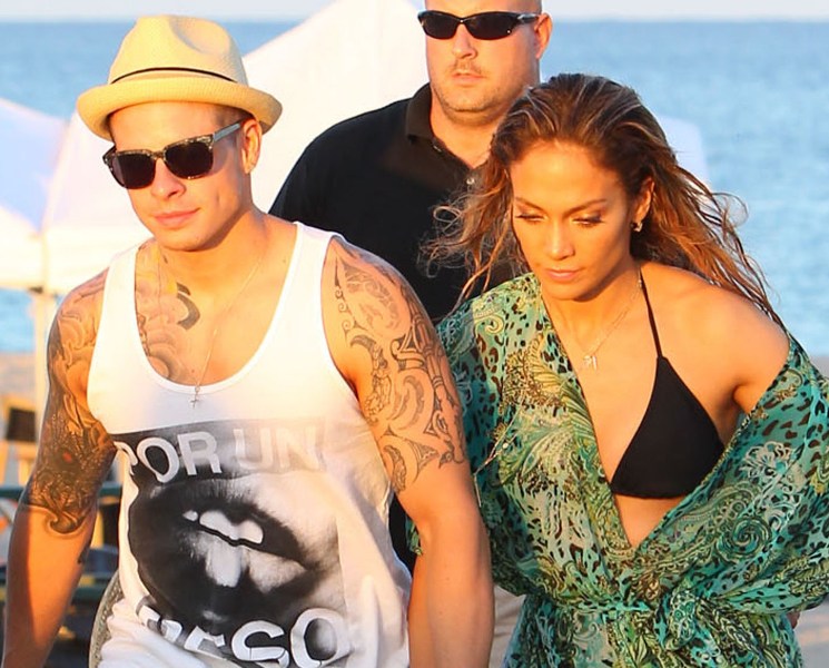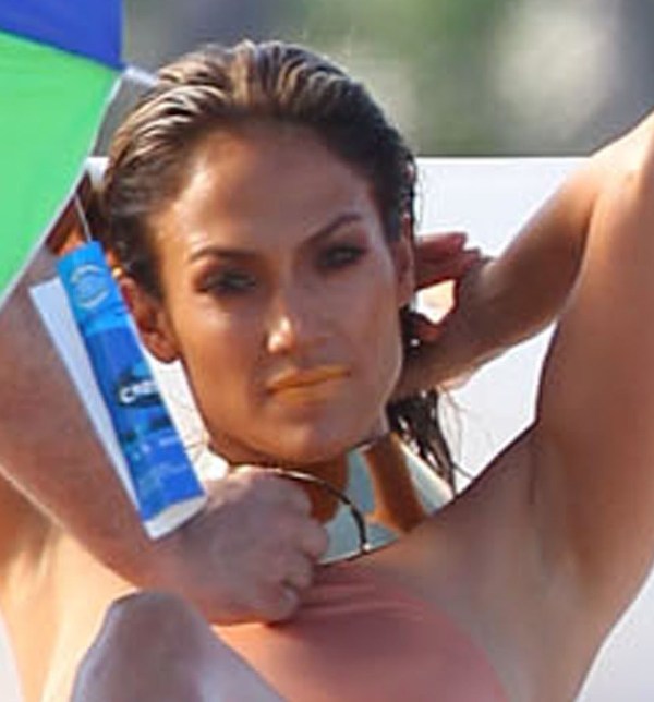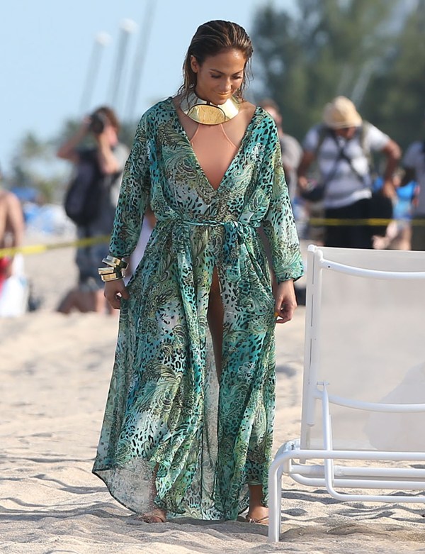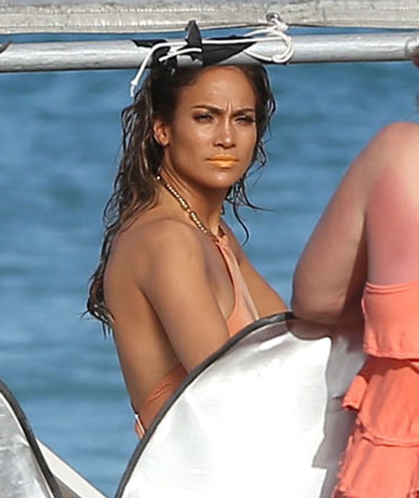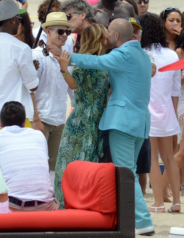 She was orange in Miami, Jennifer Lopez. An orange one-piece and orange lips. Also a green wrap dress that sorta kinda reminds me of the famous, famous one from the Grammys. And then she had to ruin it by holding hands with her Slum Bear and tenderly rubbing his neck. Check him out, thinking he’s so boss with his shirt off, running the shoot.