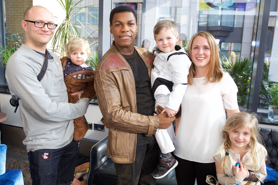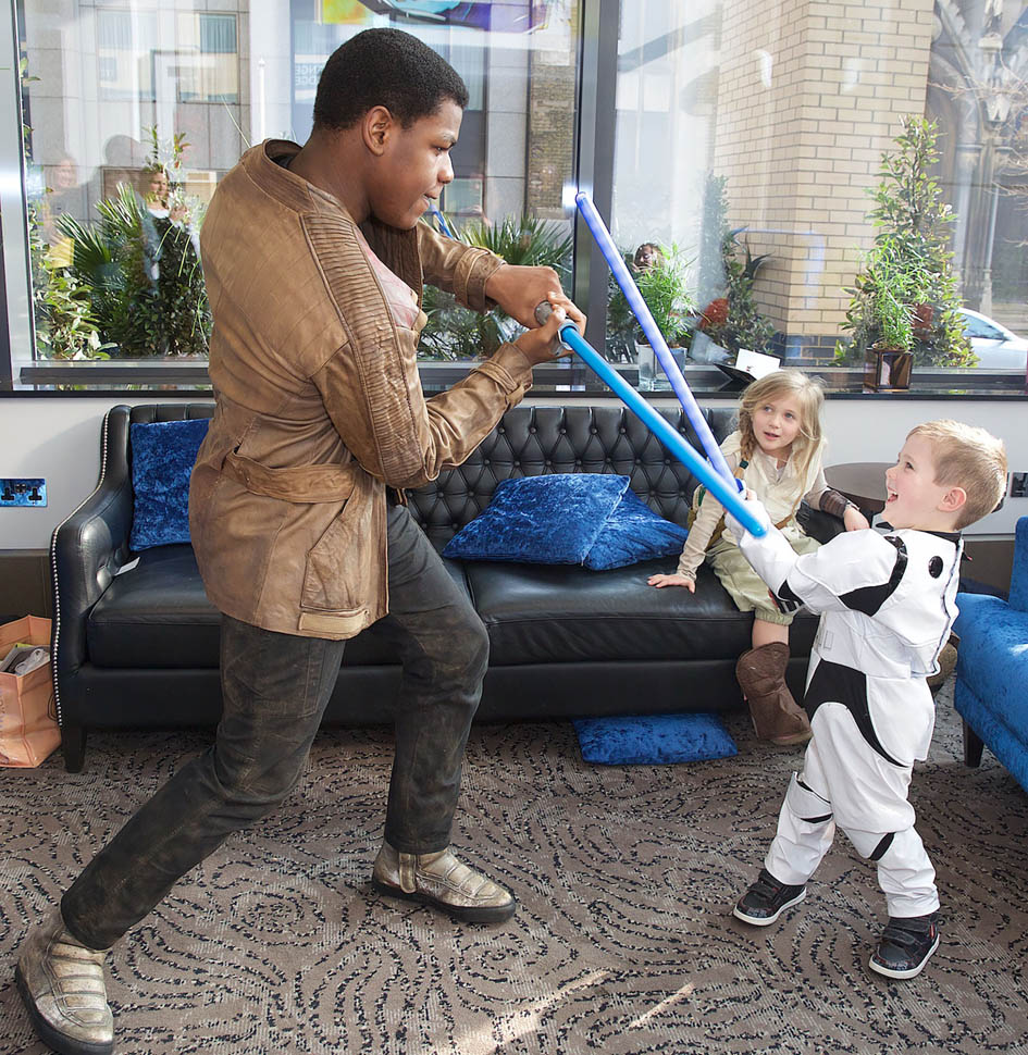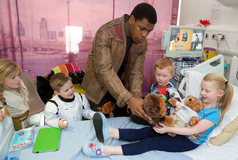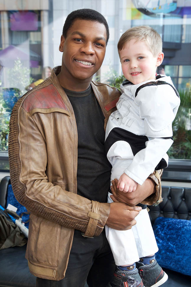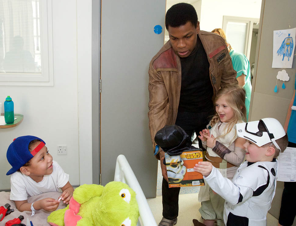 Also attached – John Boyega being awesome with kids during a visit to the Royal London Hospital. Little Daniel has a brain tumour. And his wish was to meet Finn. So he put on his Stormtrooper outfit and they had a lightsabre fight.
