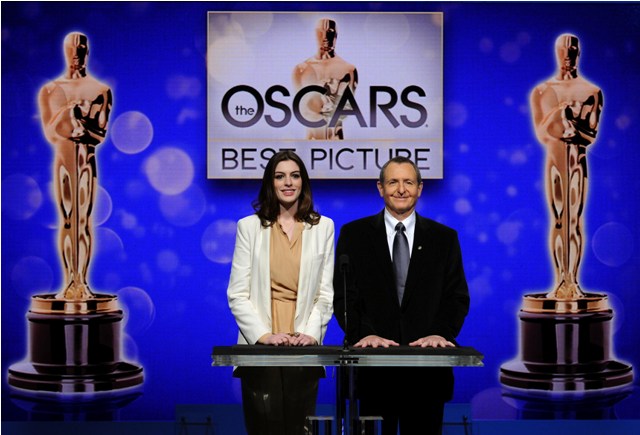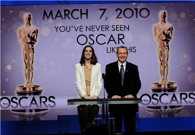 Here’s Anne Hathaway, beautifully and appropriately attired, at this morning’s announcement.