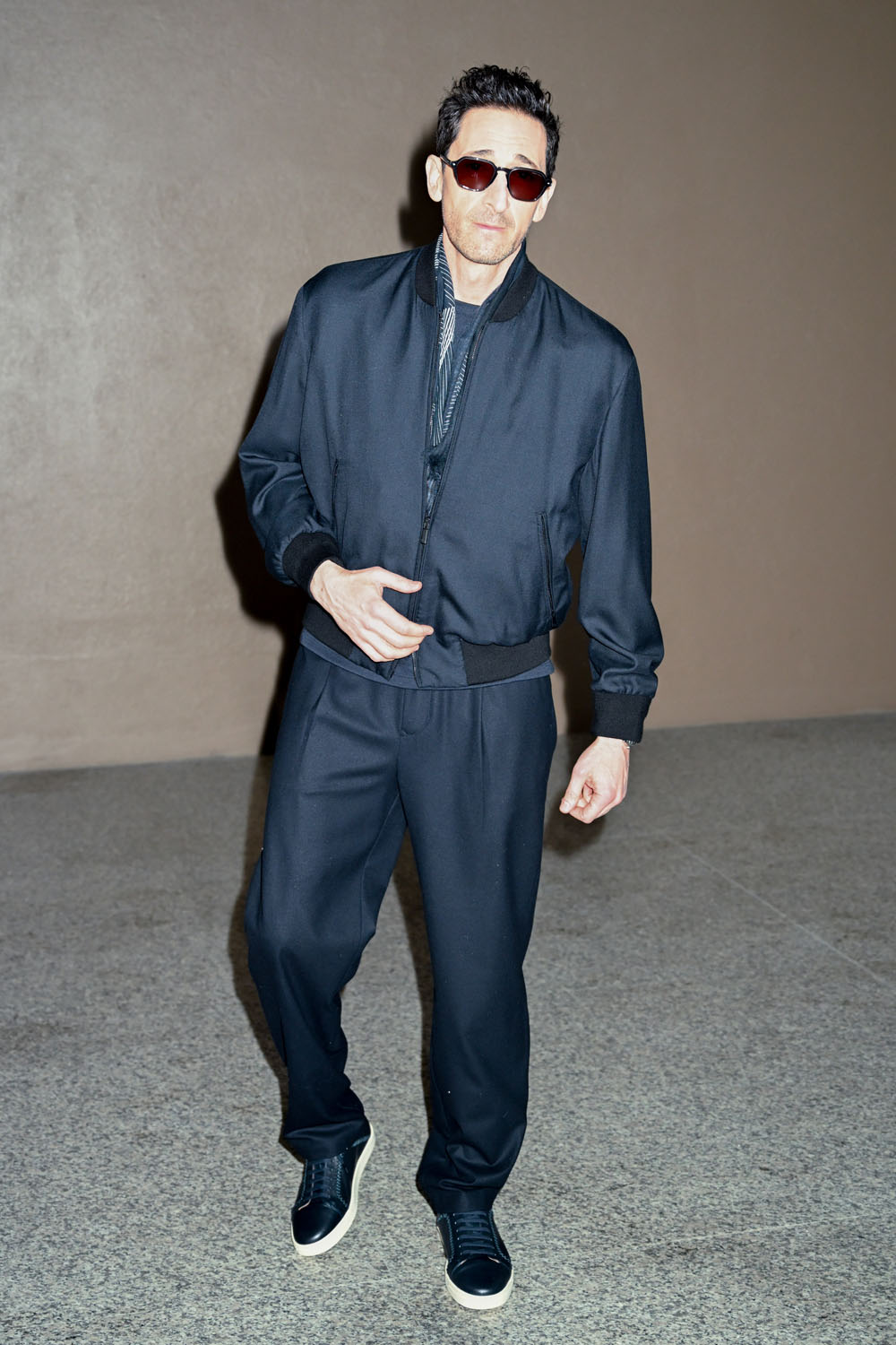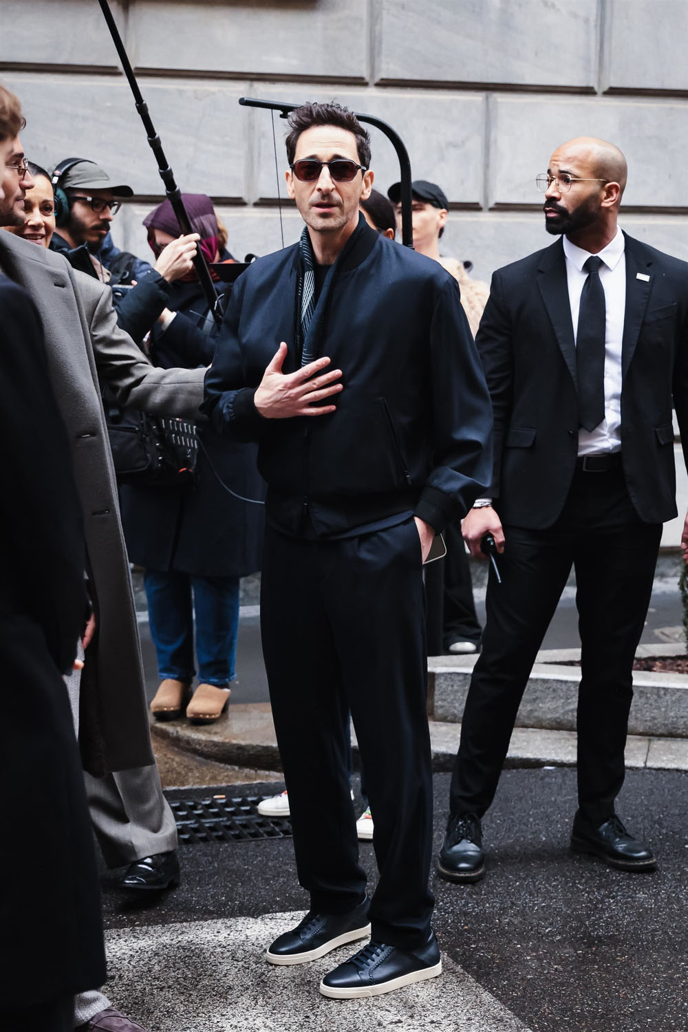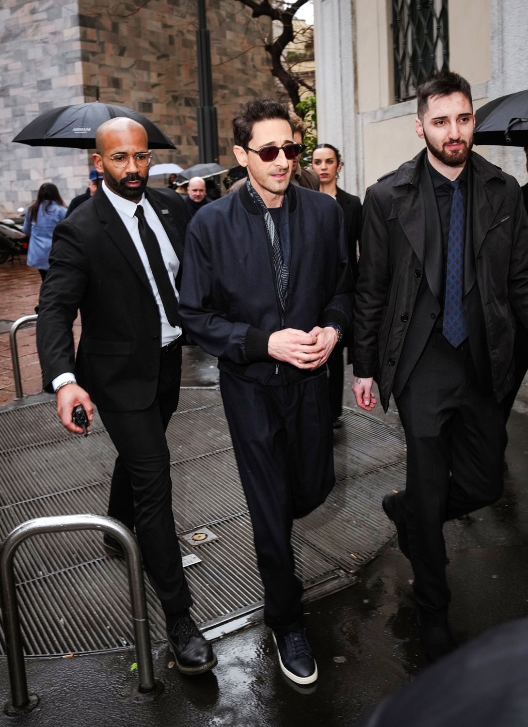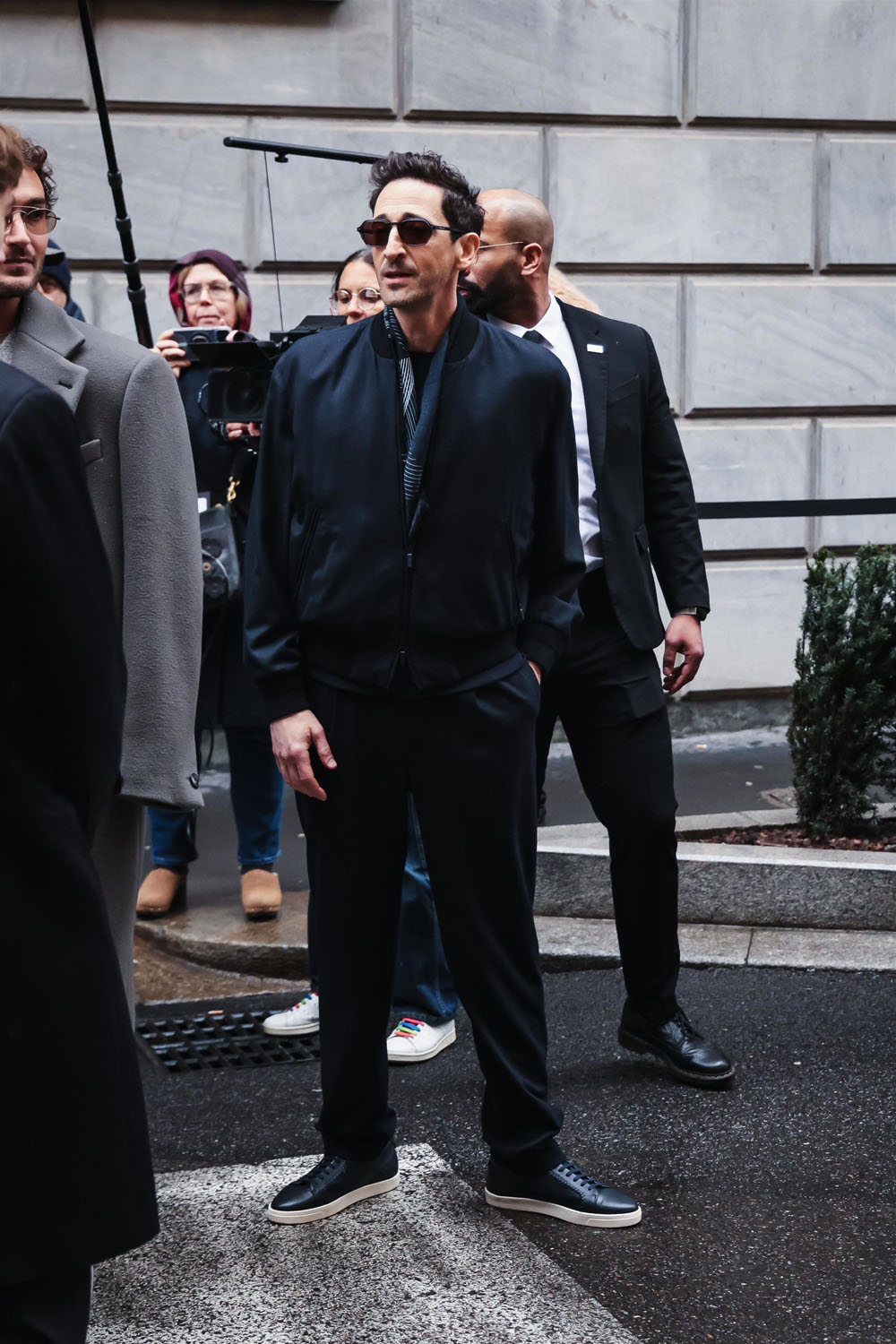 Attached – Adrien Brody at Milan Fashion Week yesterday attending the Giorgio Armani show.