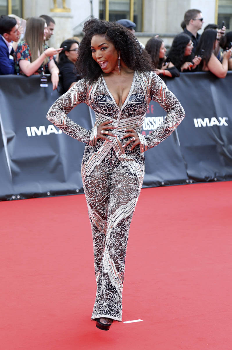 This jumpsuit on Angela Bassett? I would never. But then again, why would anyone ever after seeing it on her? It is SO totally her. She is glorious. It is glorious on her. Somehow, even though it doesn’t seem like it should be comfortable, it looks comfortable on her. Somehow it looks like a red carpet outfit AND something you might be able to wear to the gym? Right? There are for sure workout leggings that are made in this pattern and the point here is that it still gives her so much movement.