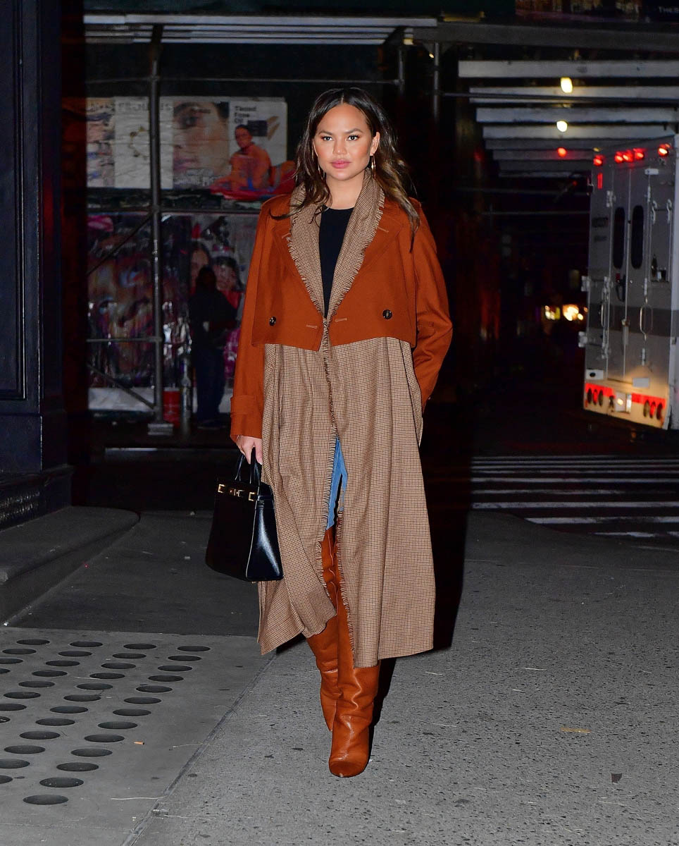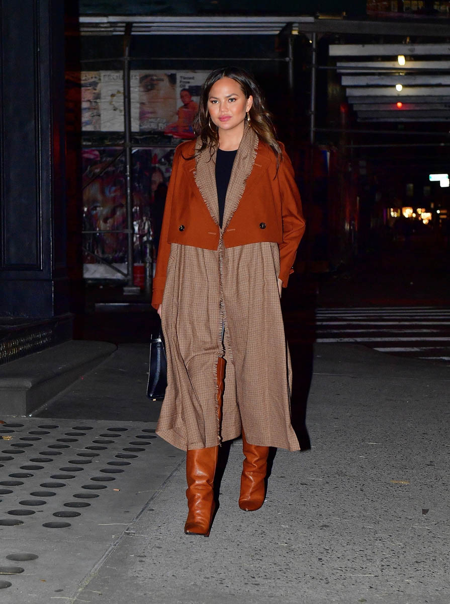 You know what? Maybe Chrissy is really good at coats. Because she was out again in New York in this olive trench worn with a cross-body bag: