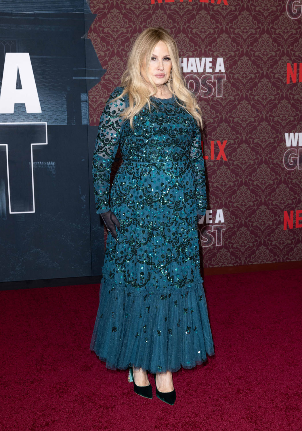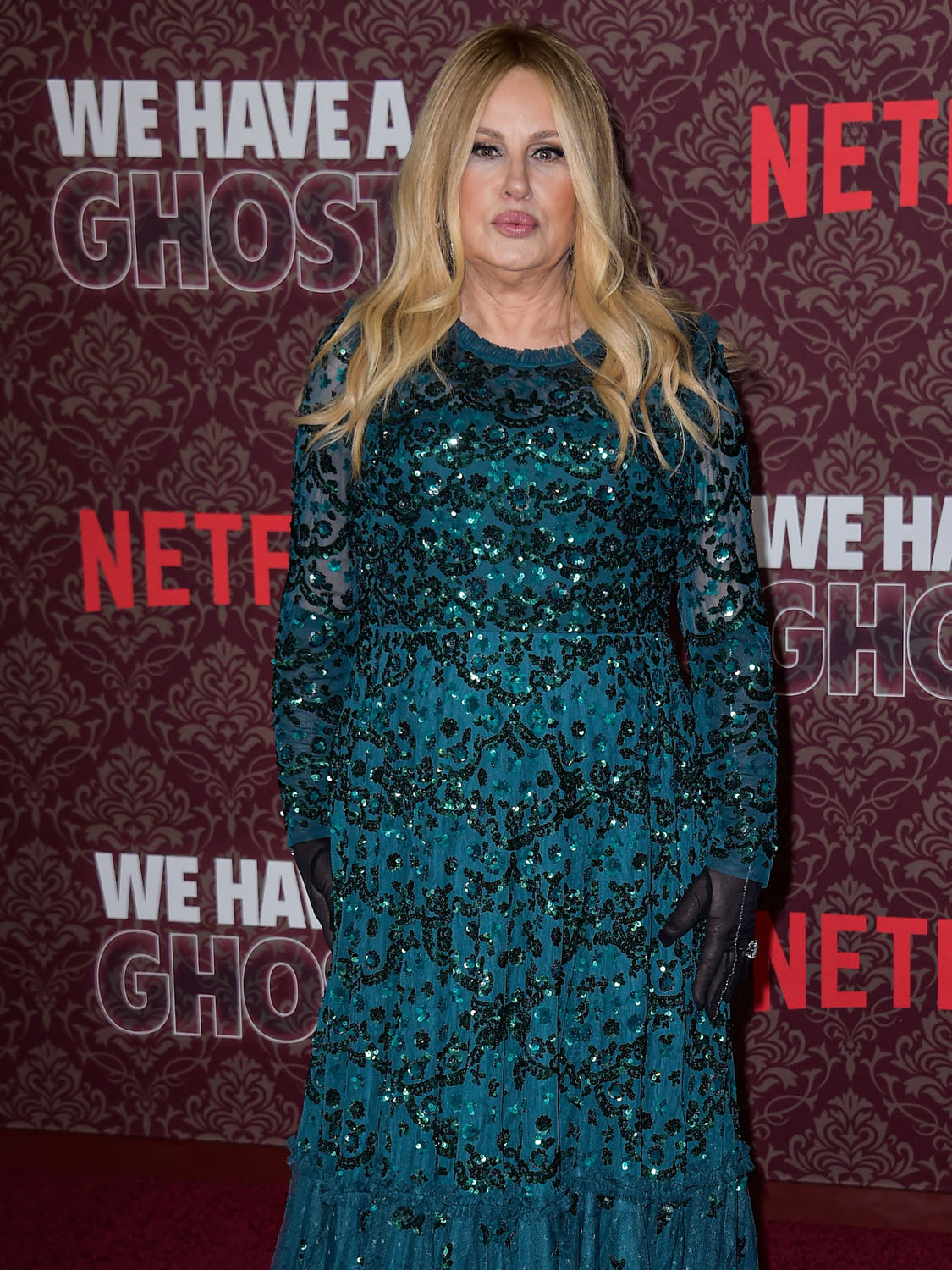As for Jennifer, she was at the We Have a Ghost premiere, wearing what in my opinion is the best dress she’s ever worn. This green sparkly gown is SO GOOD on her. Am also into the styling choice to wear the sheer gloves.