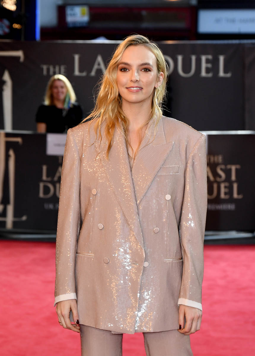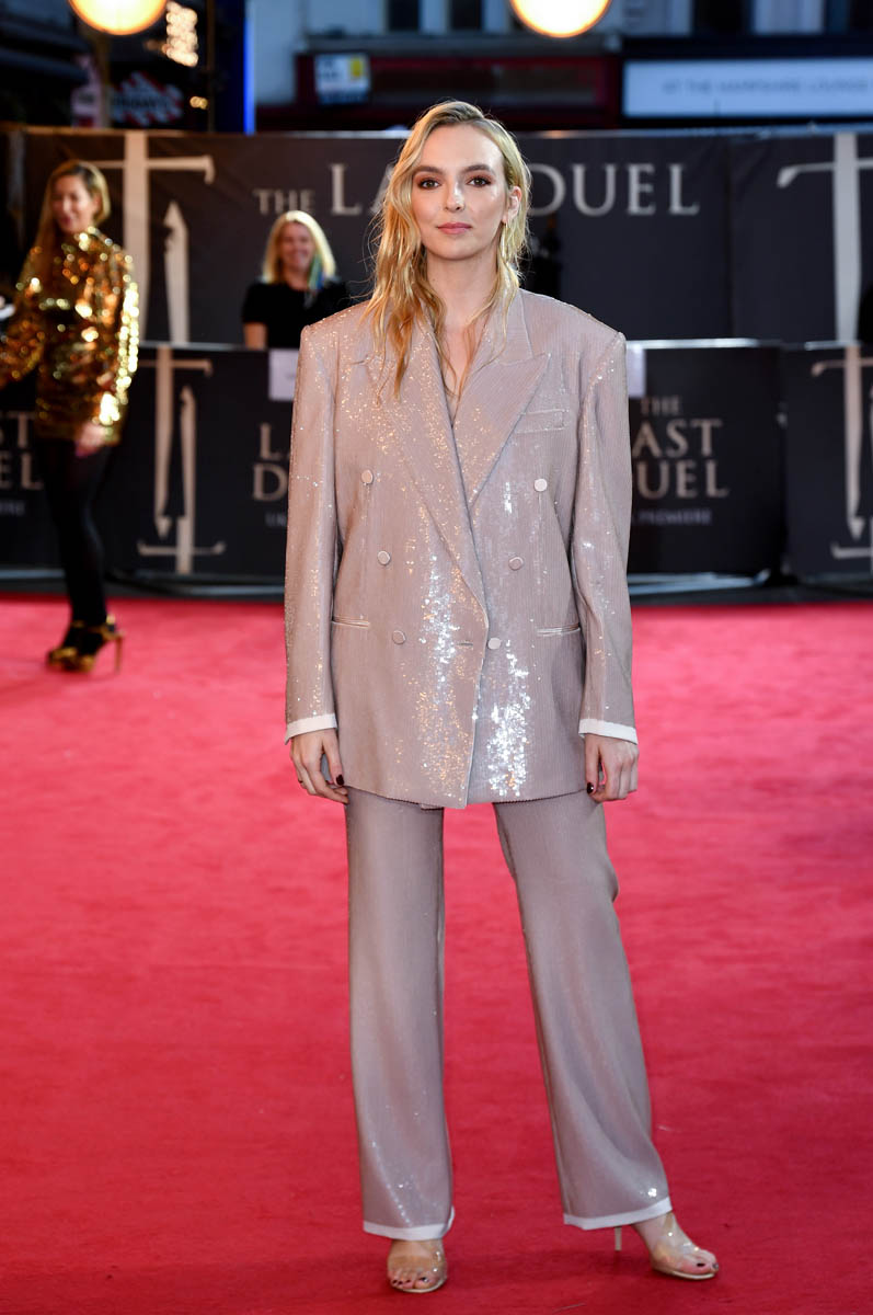 Jodie Comer was at the London premiere of The Last Duel last night in a glorious pale pink sequin suit. It’s Gucci. But it’s also Liza.