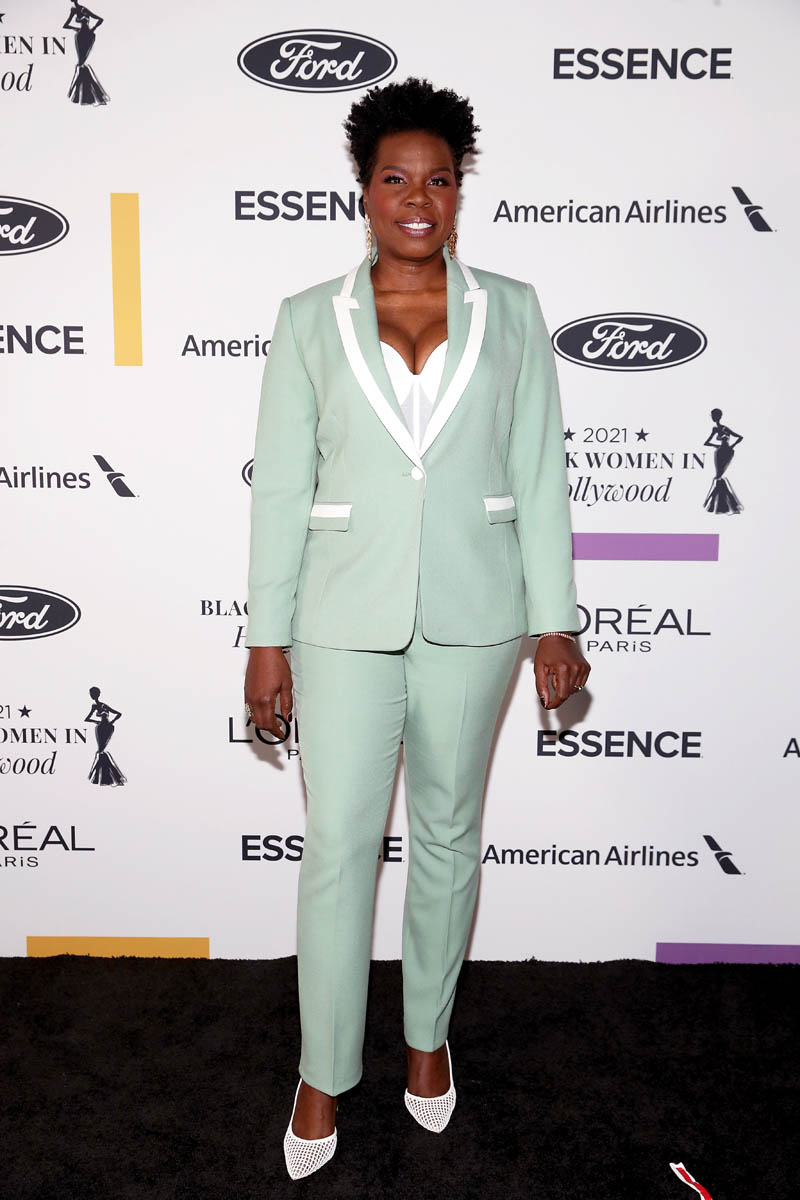 Leslie Jones presented at the ESSENCE Black Women in Hollywood event last night and the outfit she wore may be my favourite of all the outfits she’s ever worn. This is a GREAT suit. The colour is great on her, this muted mint green, so fresh, so pretty. Also the white trim is so sharp and there’s just enough of it – along the lapels and the strips over the pockets are a nice touch too.