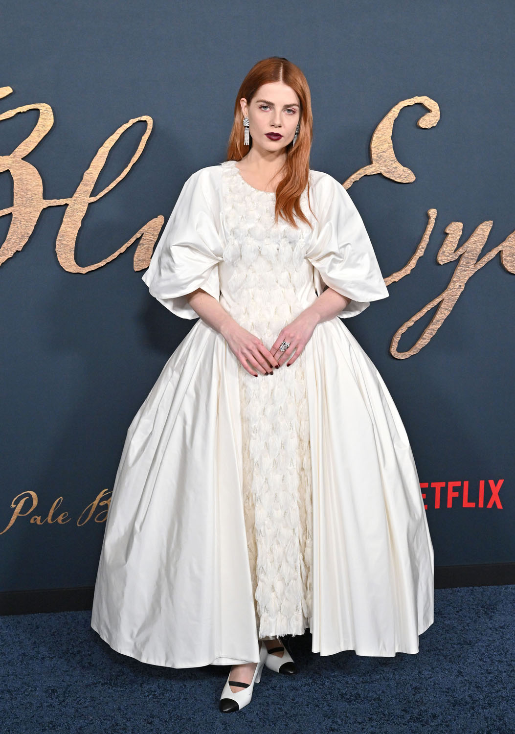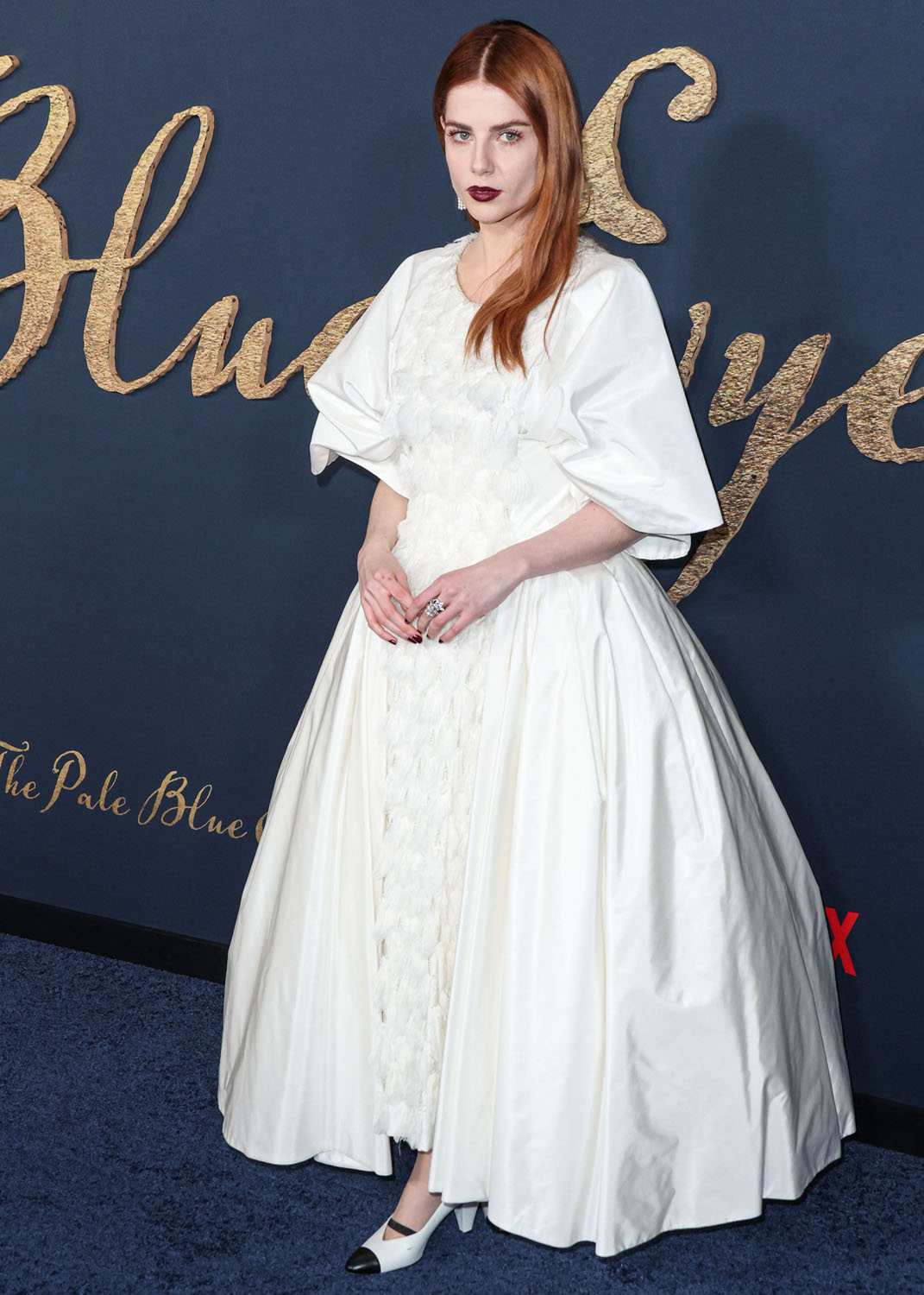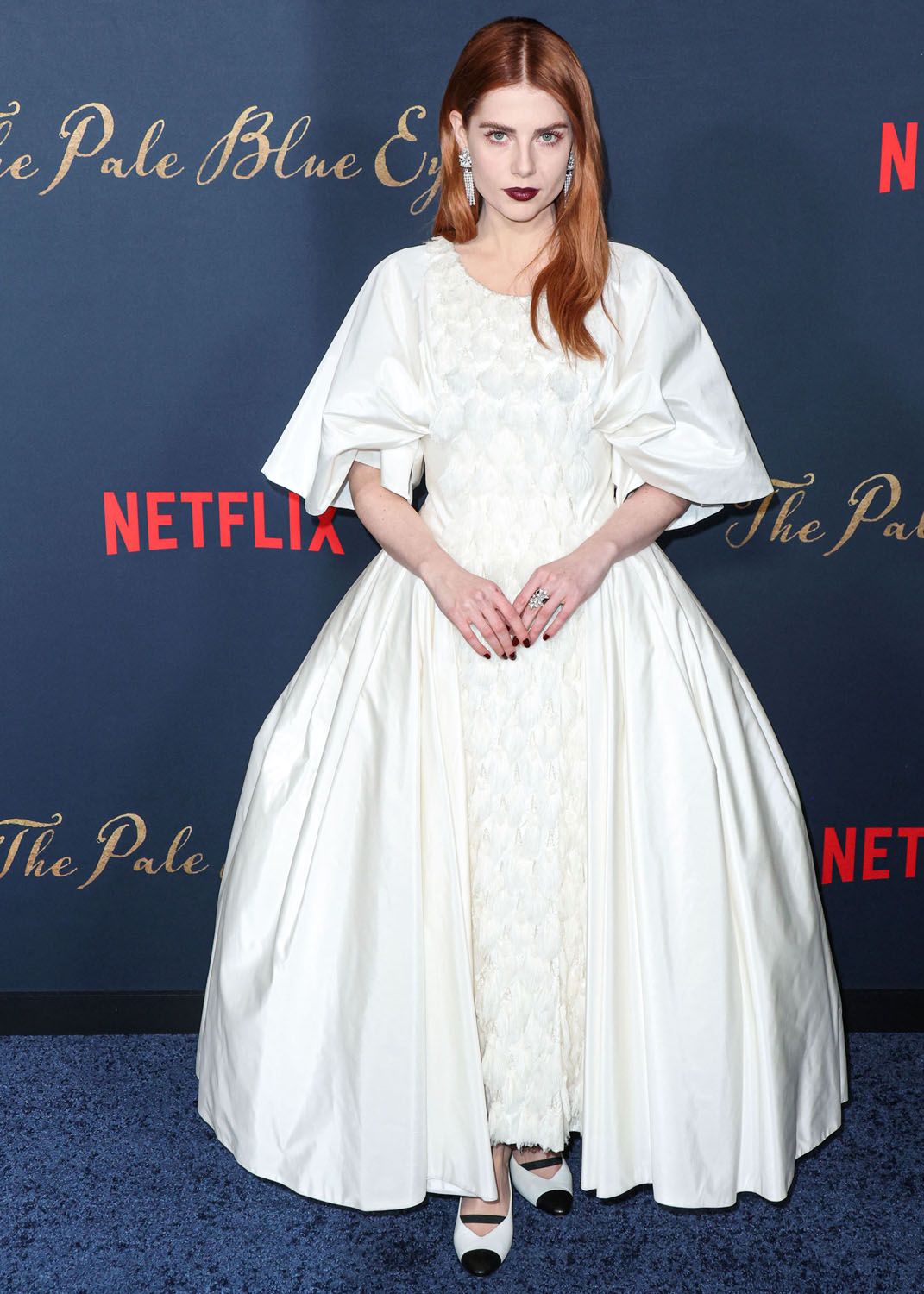 Lucy is also nodding to the film with her makeup. The Pale Blue Eye is a murder mystery and there’s an Edgar Allen Poe connection so we’re talking Gothic literature and with her red hair and the dark lip, very little blush, in combination with the white dress, Lucy’s kinda playing up the creepy doll energy. The girl in the white dress is not all innocent, this girl in this white dress has secrets, she is moody and mysterious, melancholy follows wherever she goes…