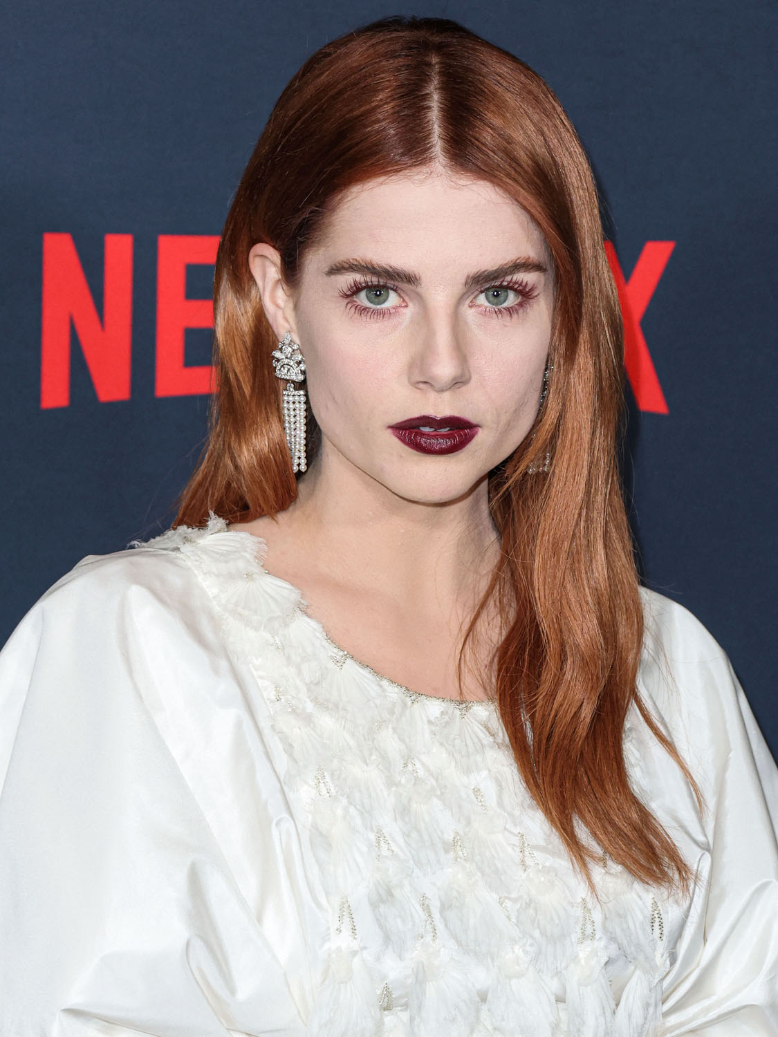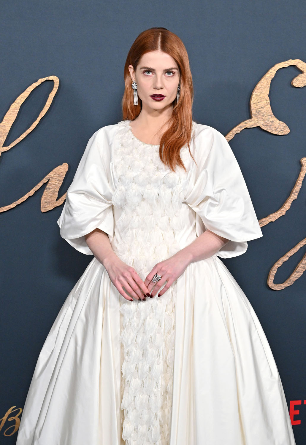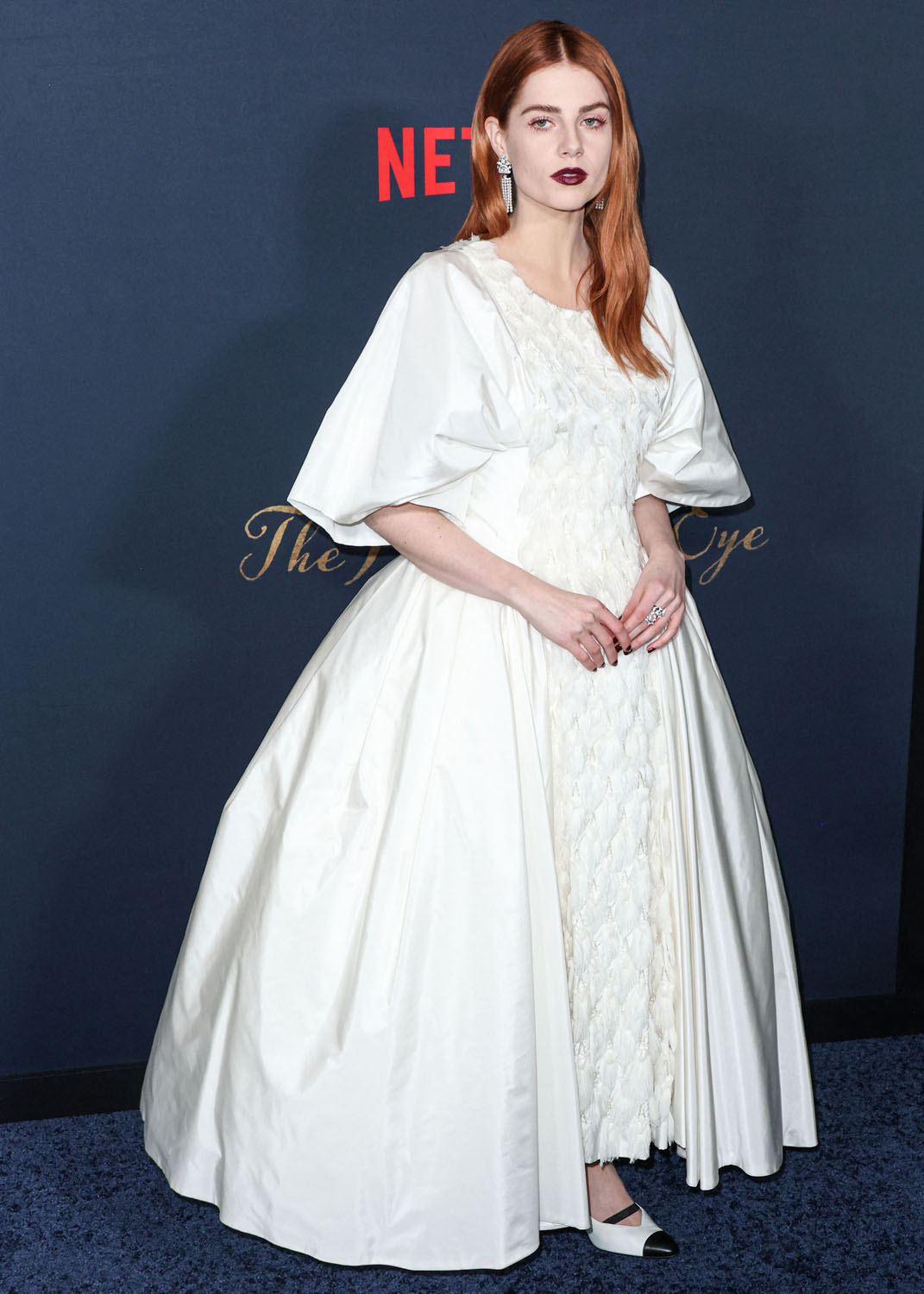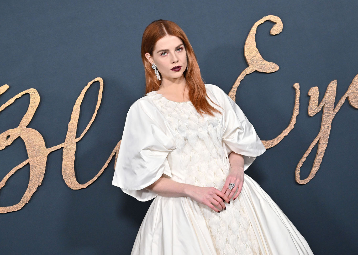 Lucy is also nodding to the film with her makeup. The Pale Blue Eye is a murder mystery and there’s an Edgar Allen Poe connection so we’re talking Gothic literature and with her red hair and the dark lip, very little blush, in combination with the white dress, Lucy’s kinda playing up the creepy doll energy. The girl in the white dress is not all innocent, this girl in this white dress has secrets, she is moody and mysterious, melancholy follows wherever she goes…