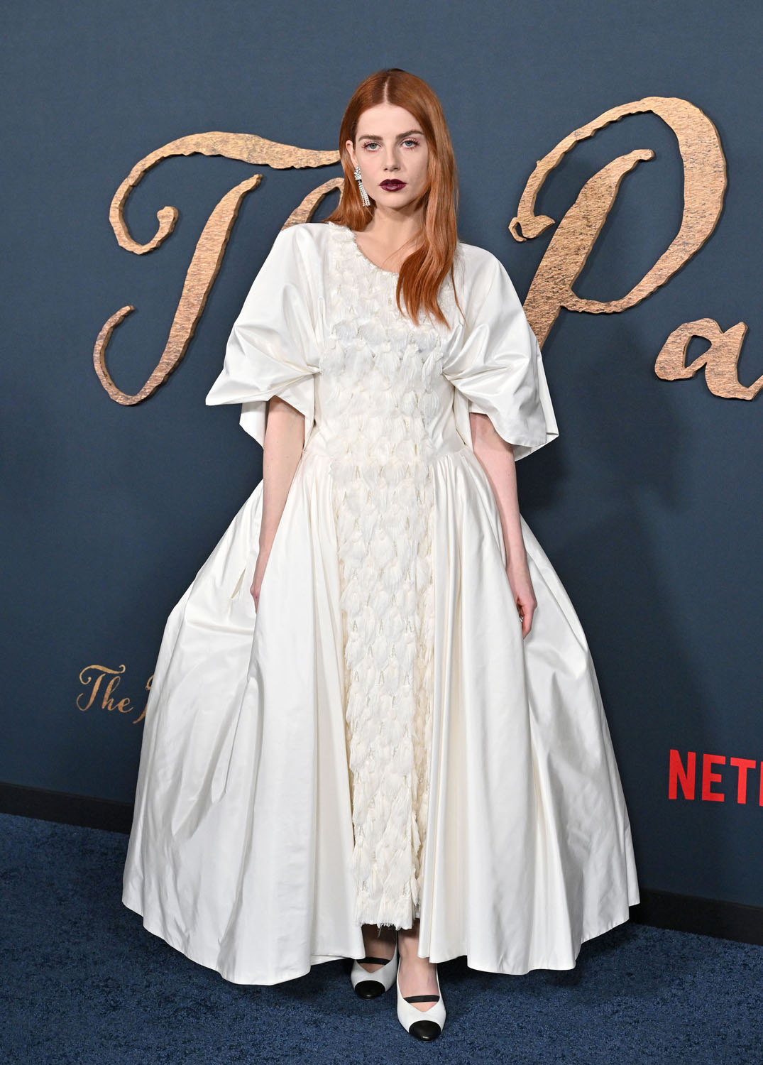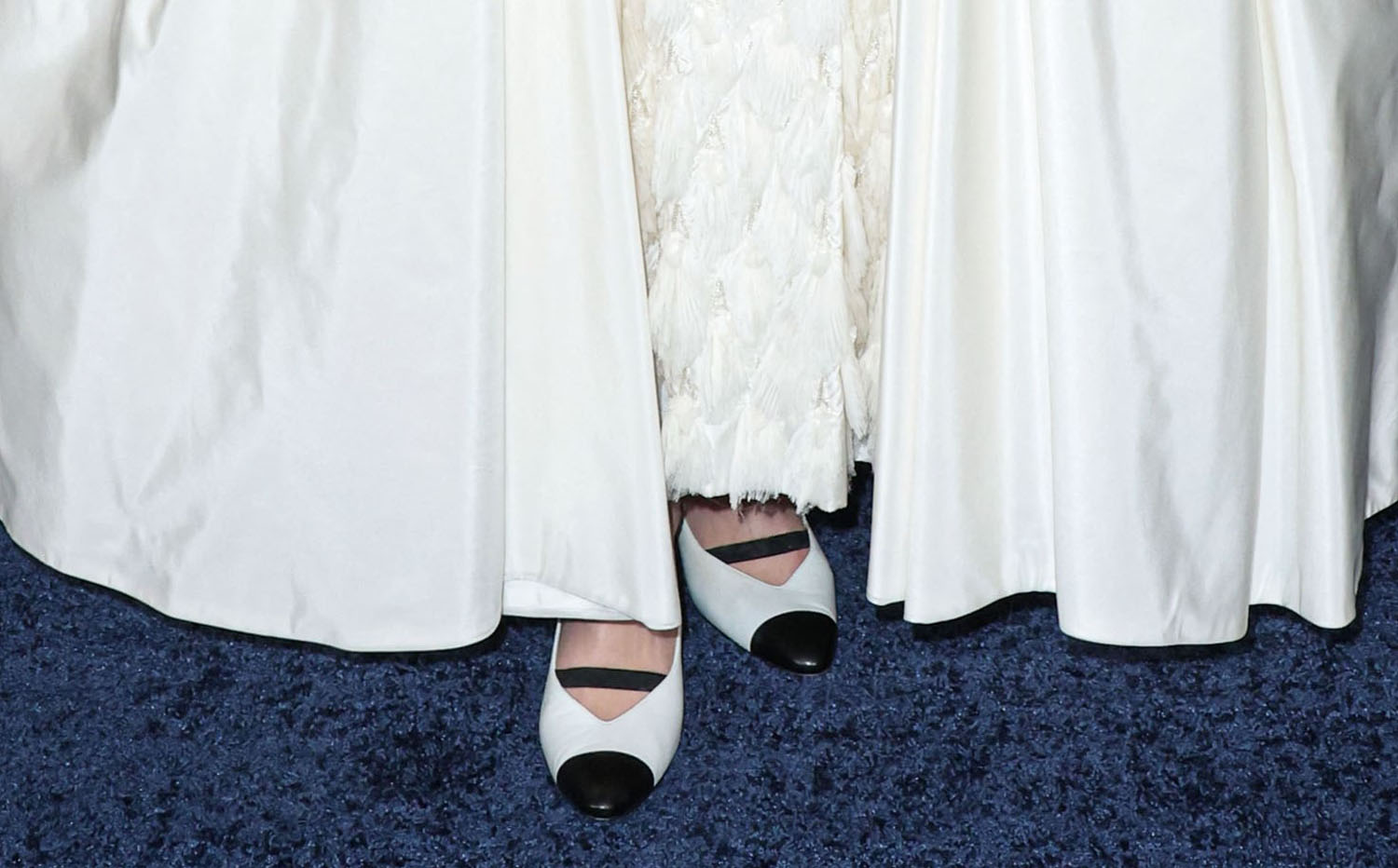 As for the styling, though, I do love this Chanel dress on her because for me personally, it’s where I live. It’s also where the film lives, as The Pale Blue Eye is set in the 1830s so she’s kinda dressing on theme with this Victorian silhouette and modern at the same time with the drop sleeve and how beautifully the layers are constructed with different materials. And it’s the perfect shoe choice – a classic Chanel white pump with the black toe and the band.